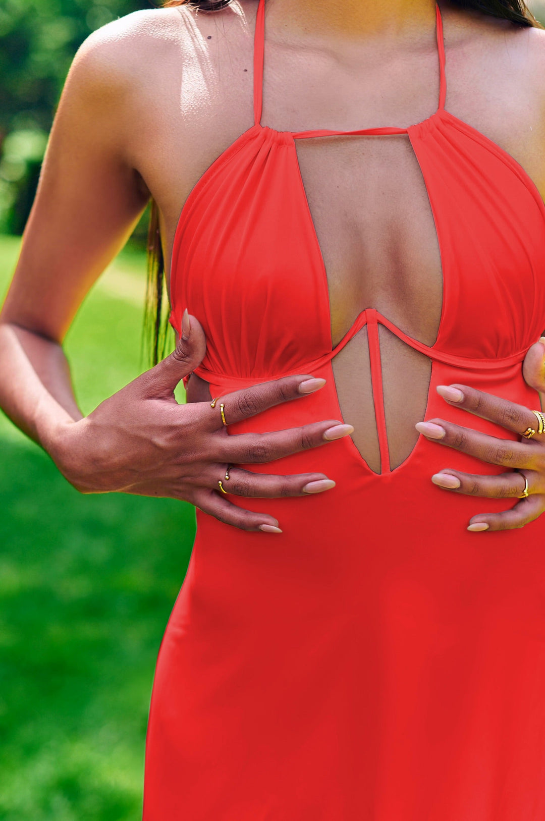 Dress with collected triagulos, long strips to cross the waist and skirts overlapping with a leg, spring back and preense