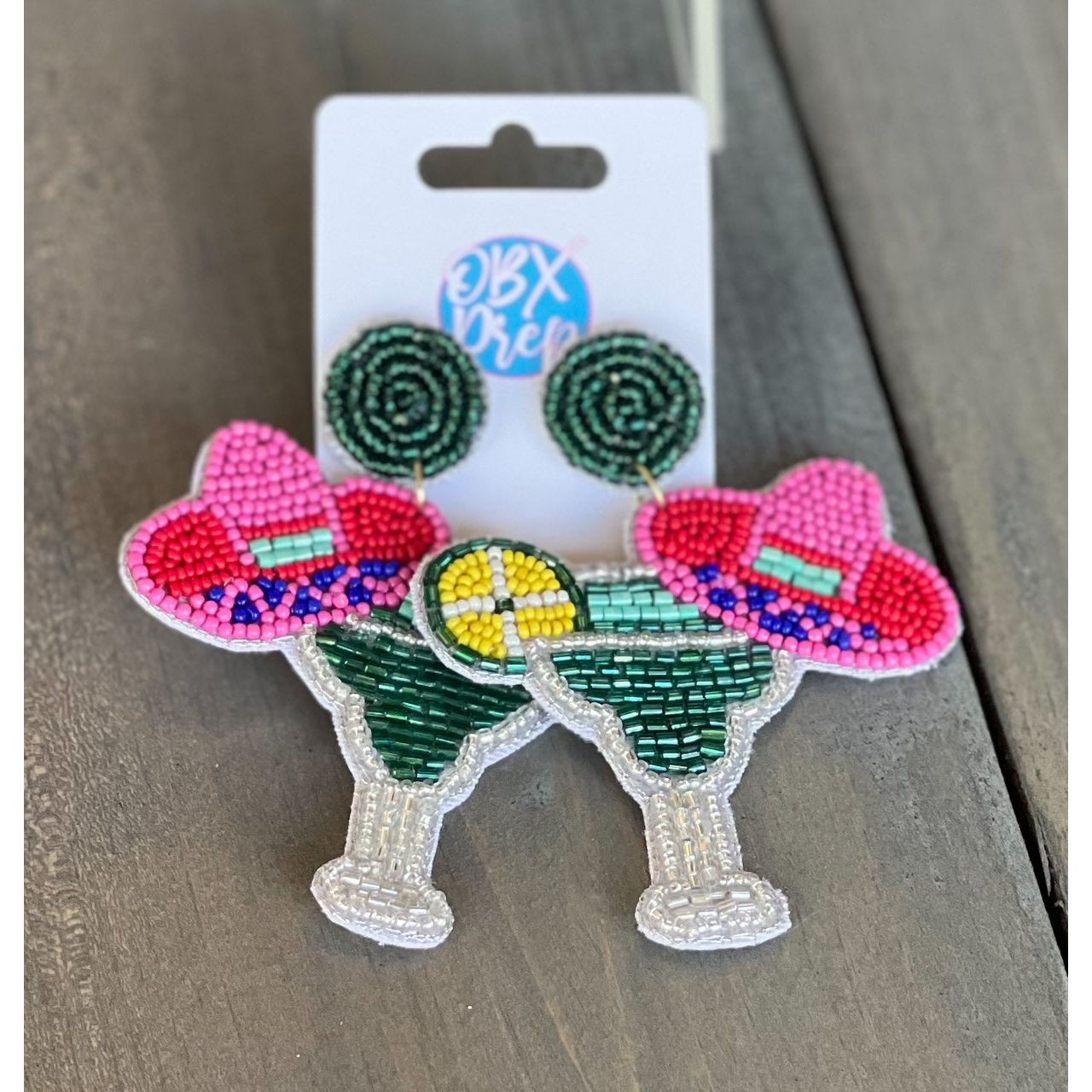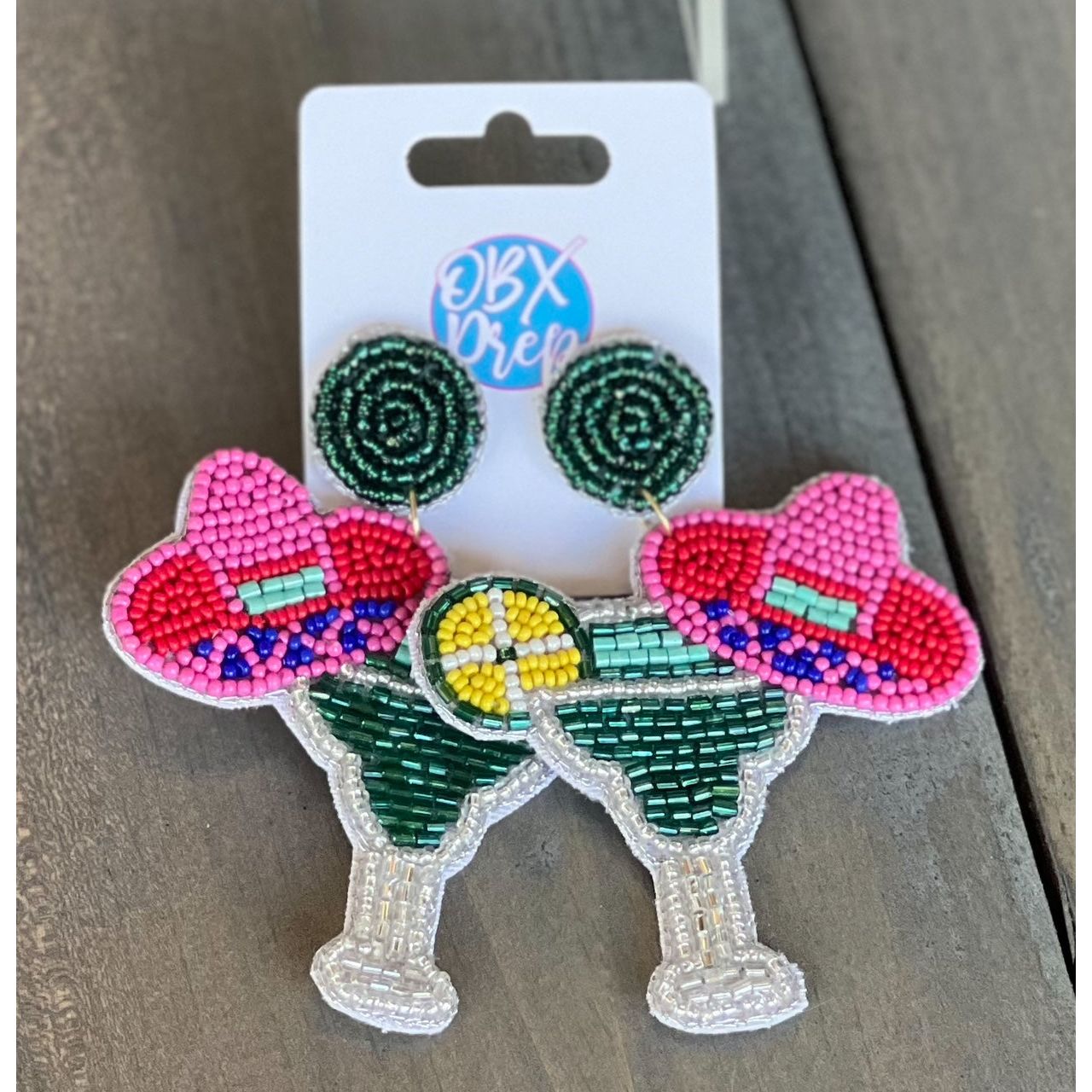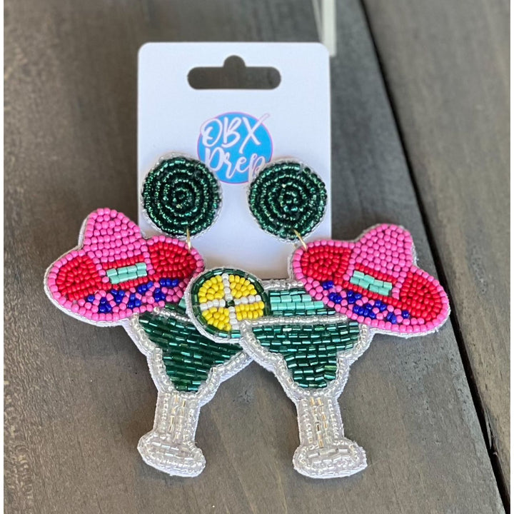 Handmade beaded Margarita with sombrero seed beaded dangle earrings.