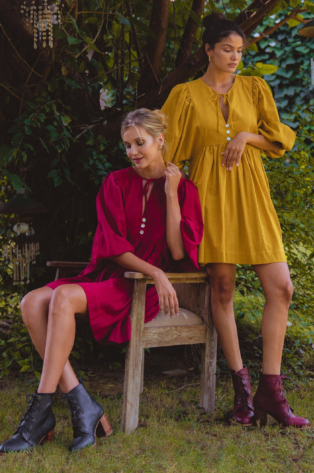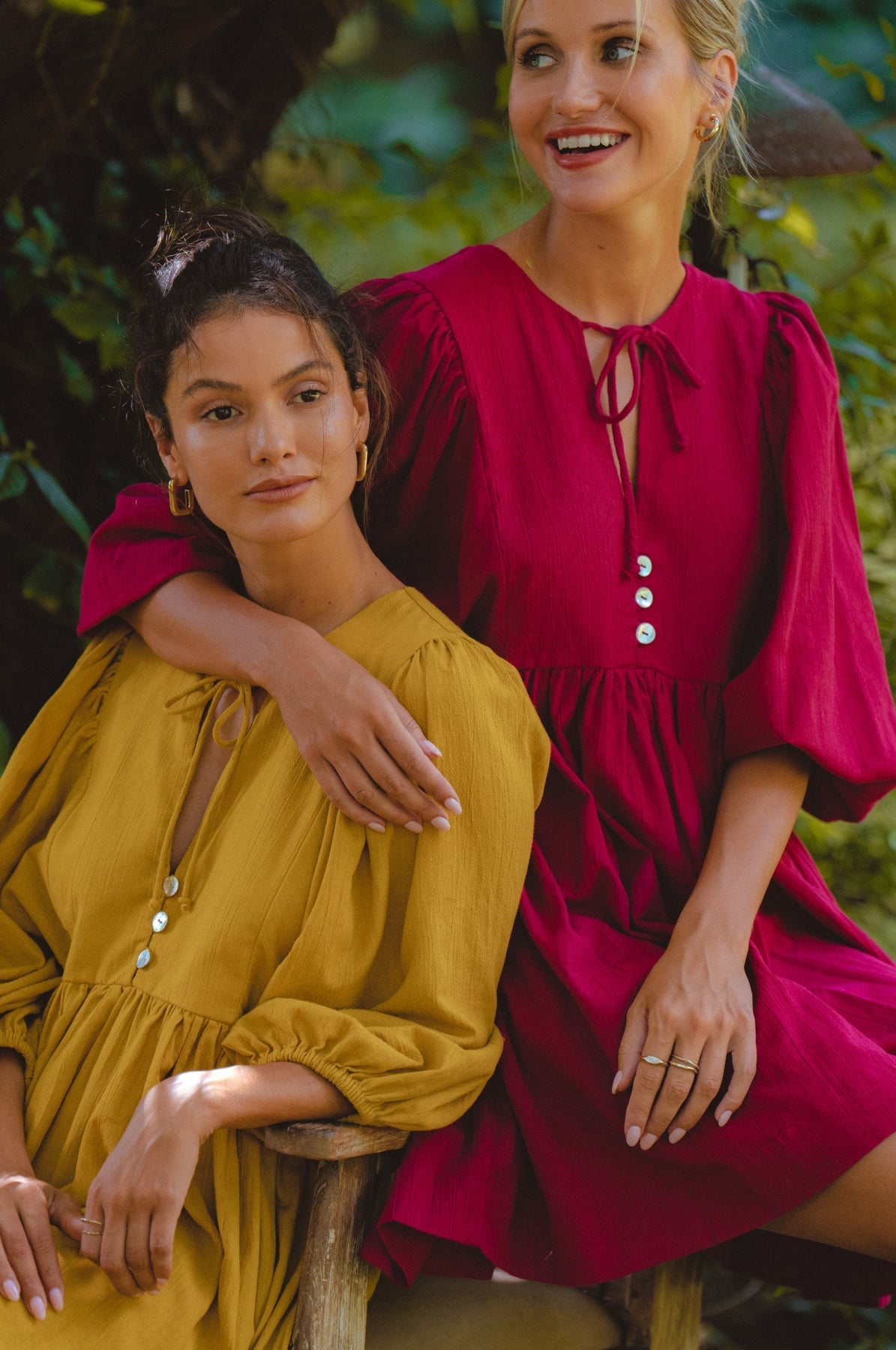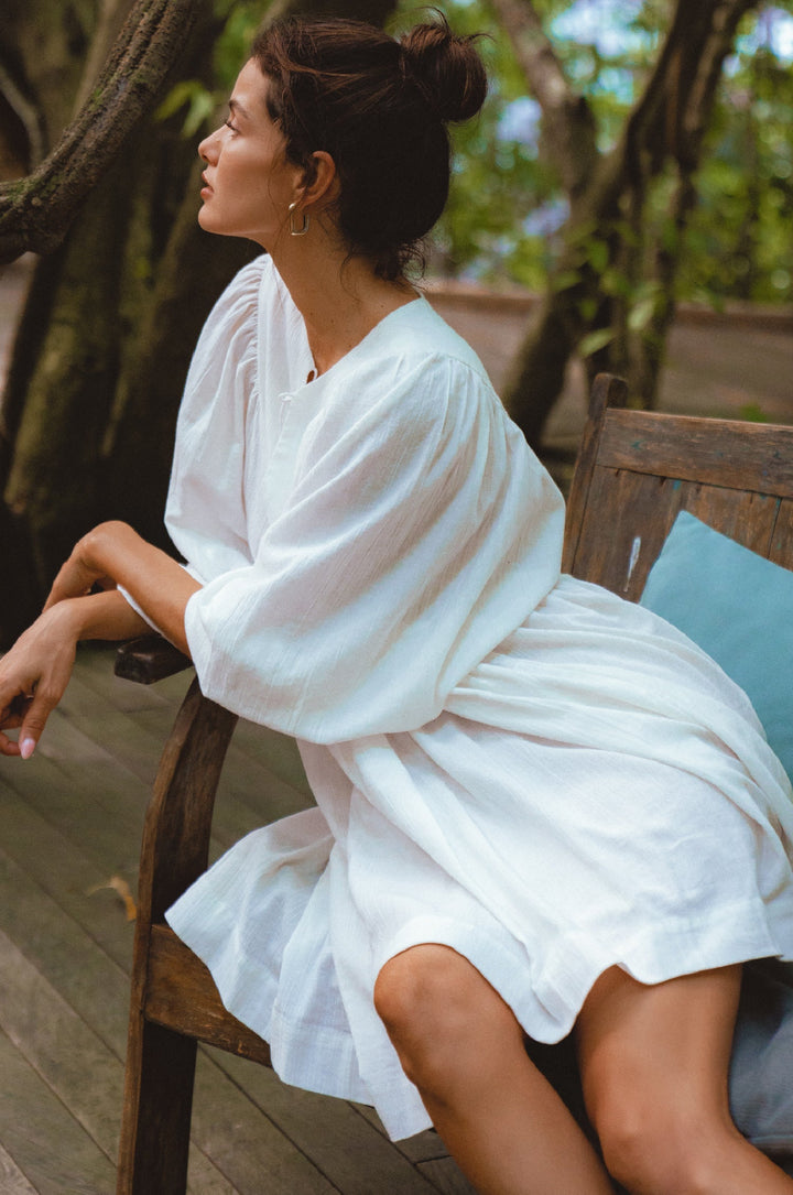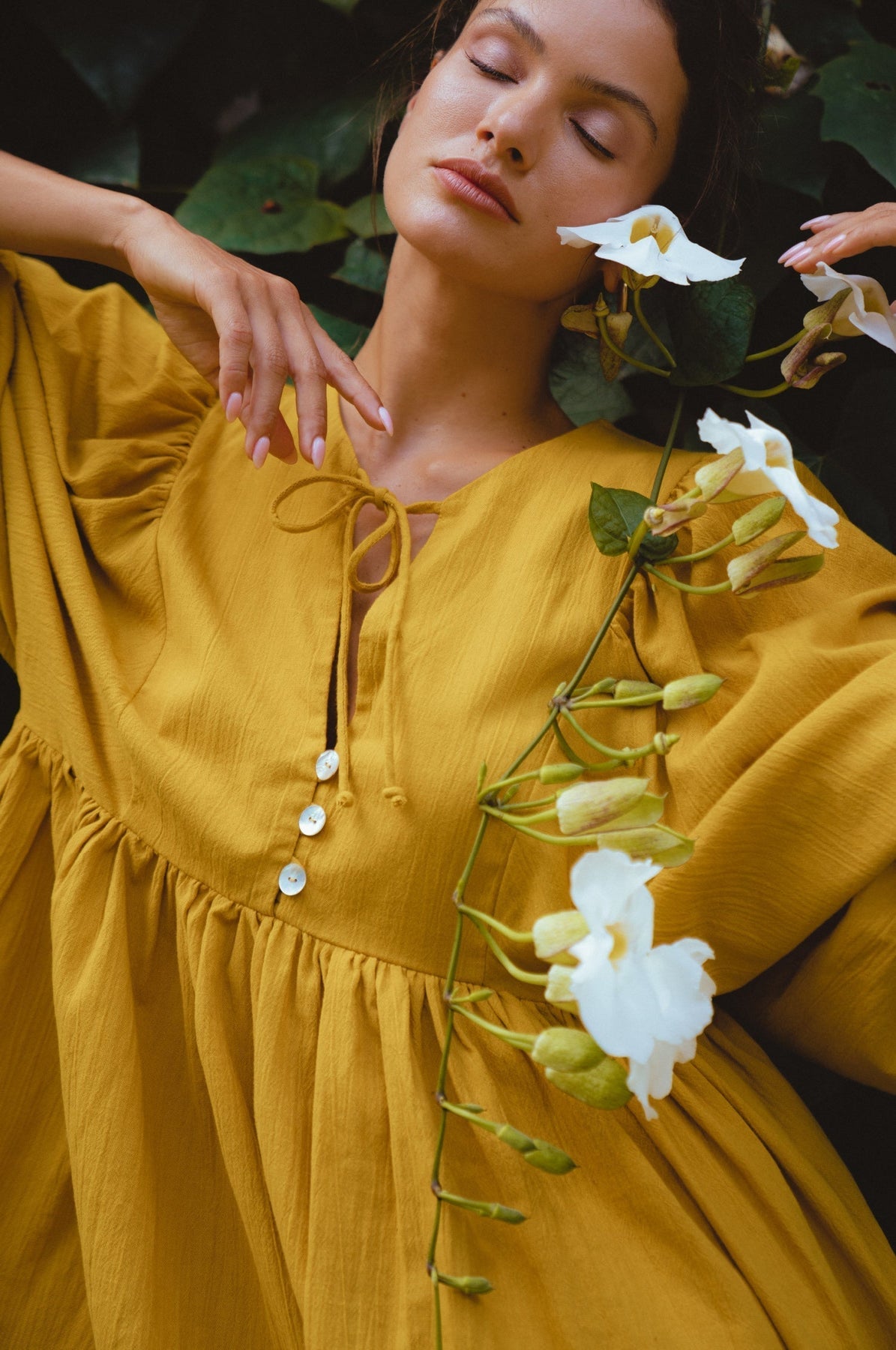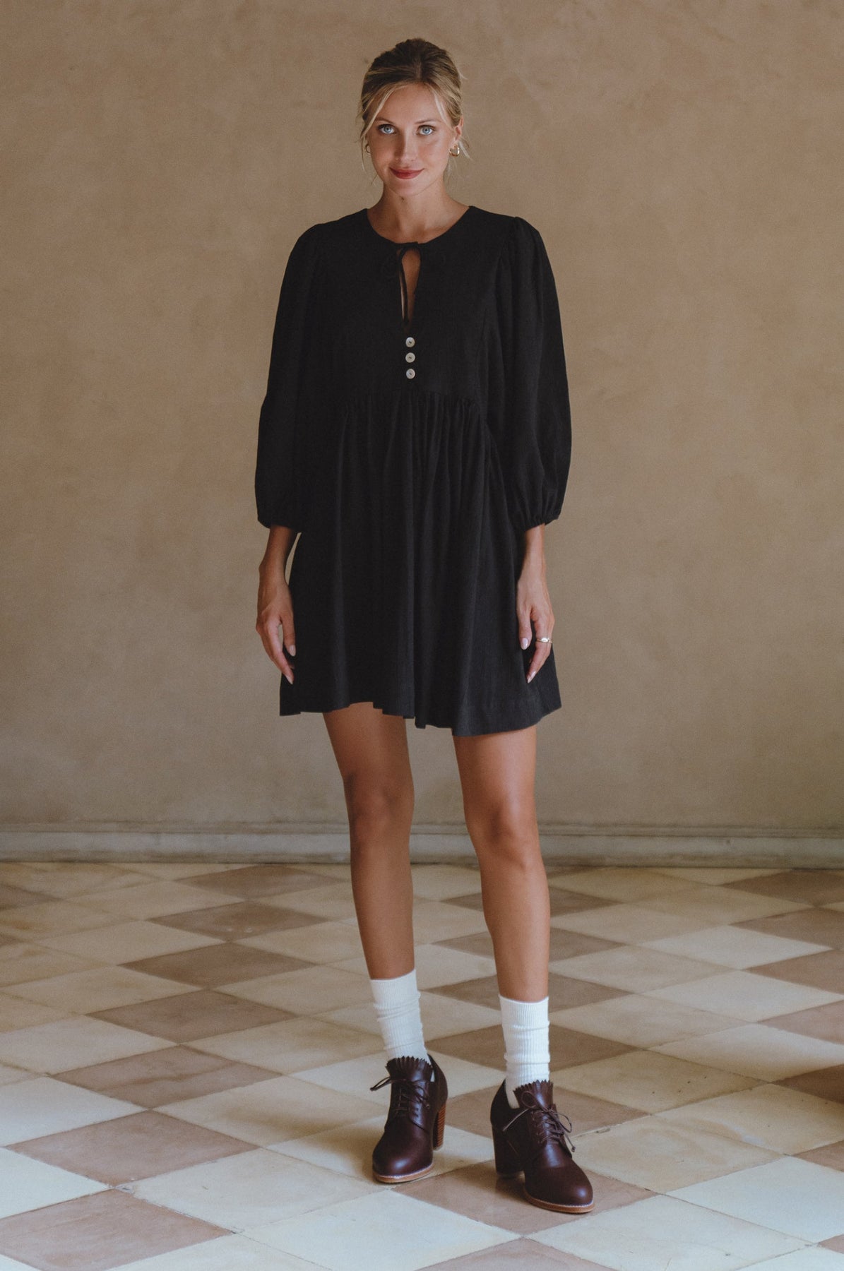 Maribelle linen mini dress is handmade from lightweight crinkle linen into a long sleeve baby doll mini silhouette. It's adorned with buttons and self tie and is beautifully gathered along the sleeves to create texture and enhance the loose shape.