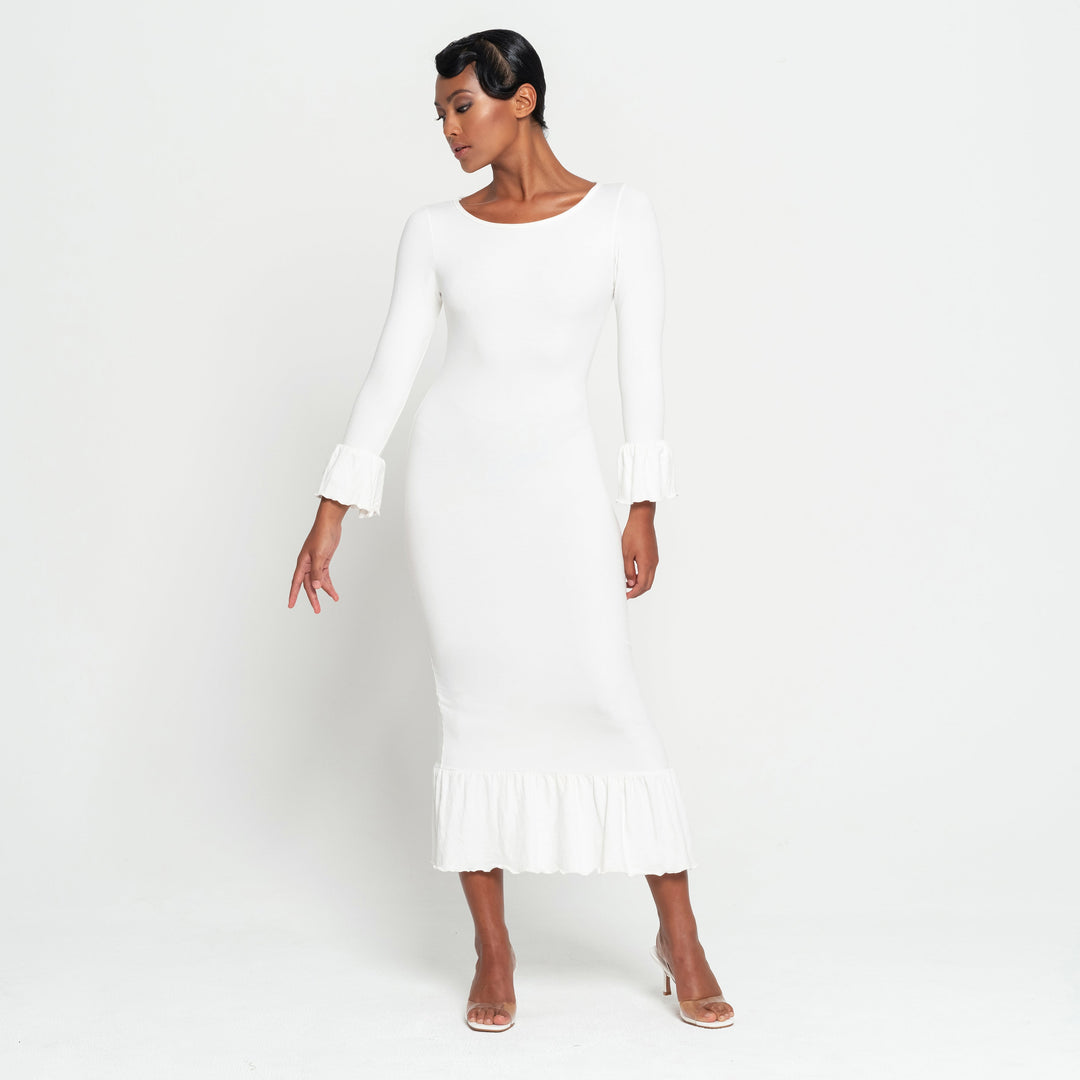 MARJORIE Bamboo Ruffle Dress, in Off-white by BrunnaCo