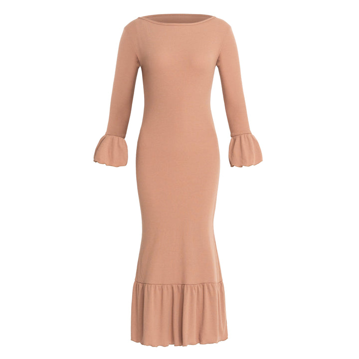 MARJORIE Ruffle Rib Dress, in Camel Brown by BrunnaCo