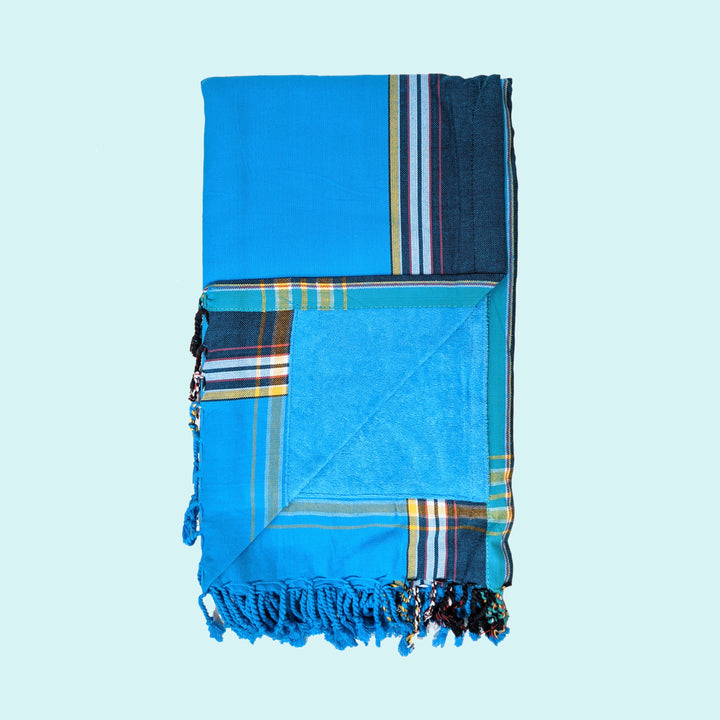 Soak up some sun with the Medium Blue Kenyan Beach Towel! Our fair trade Kenyan Beach Towels are ethically crafted in Nairobi, Kenya. We back lightweight and absorbent hand-loomed cotton kikoy cloth with quick-dry microfiber terry for extra absorption. The hidden velcro pocket in the interior is perfect for storing your keys or phone!