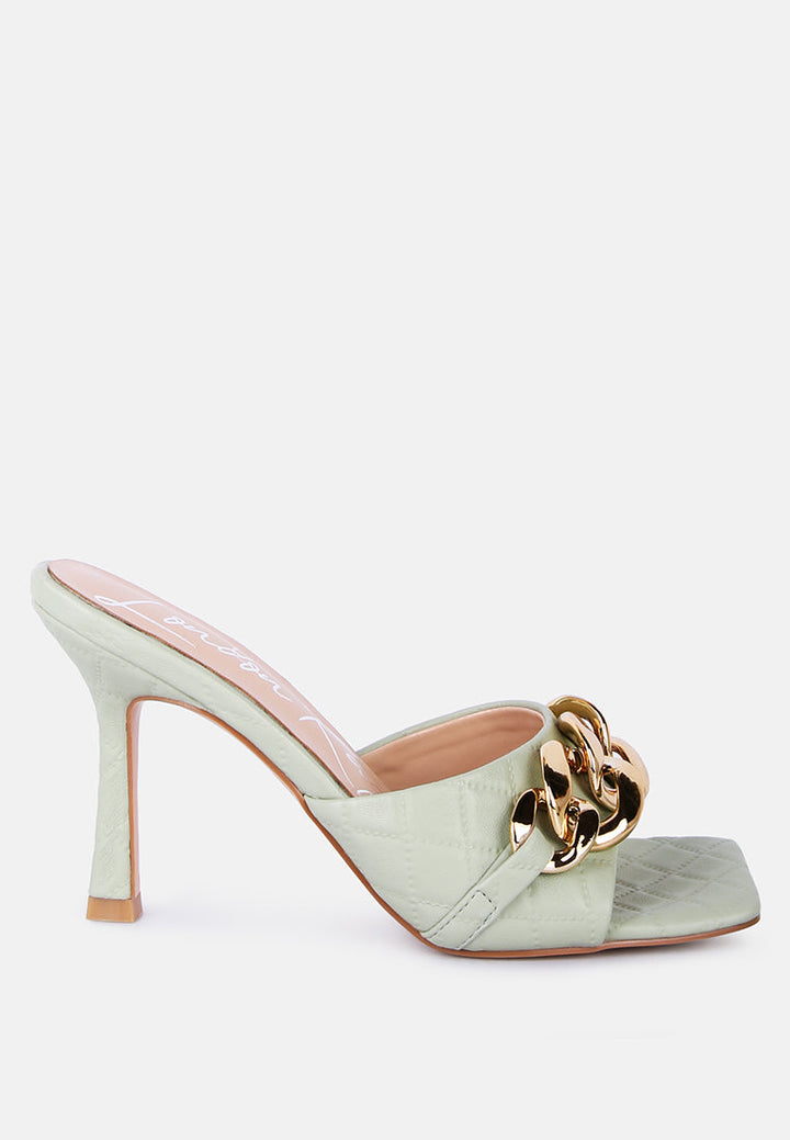 The quilted sandals are chic and fashionable with link chain embellishment which enhances the overall look of the shoe style. The heels are perfect as a wedding guest shoes or bridesmaid shoes, and also work well with business casual looks!