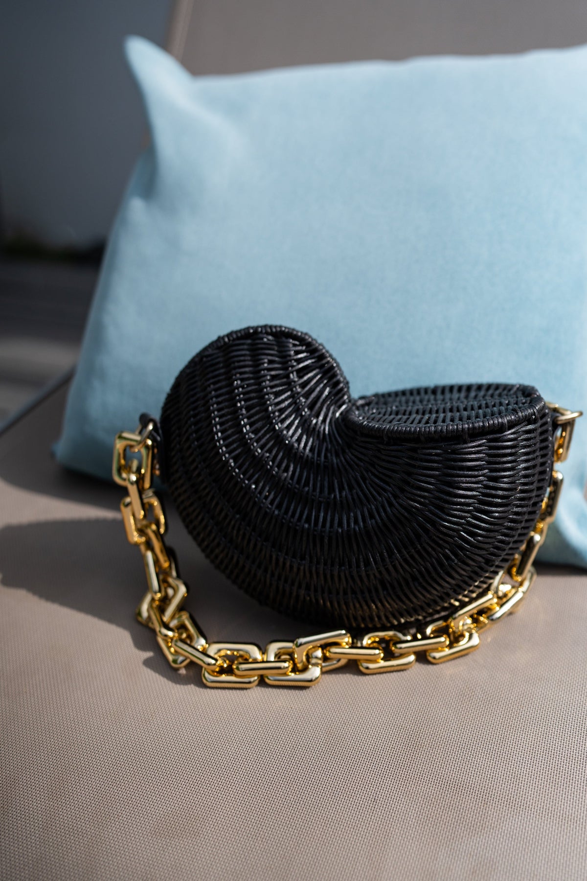 Introducing our Moon Shell Purse in Black Wicker, a playful addition to your accessory collection! Made of durable wicker, this purse features a light chain and is delicately covered in gold for a touch of elegance. The structured shoulder bag, in the shape of a shell, features a hidden magnetic closure for easy access. Carry your essentials in style with this unique and whimsical handbag.