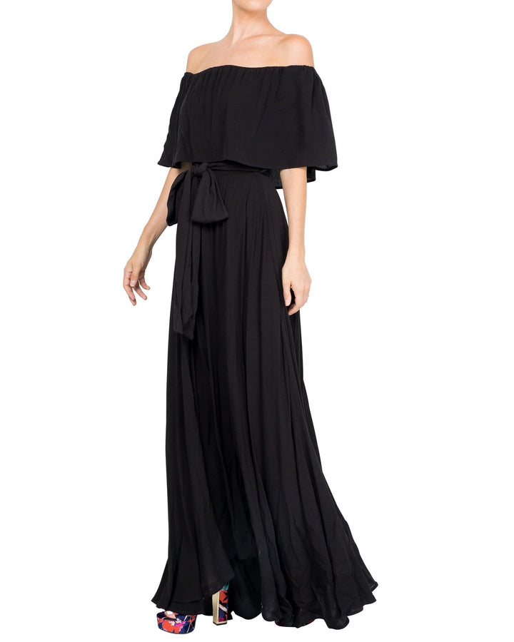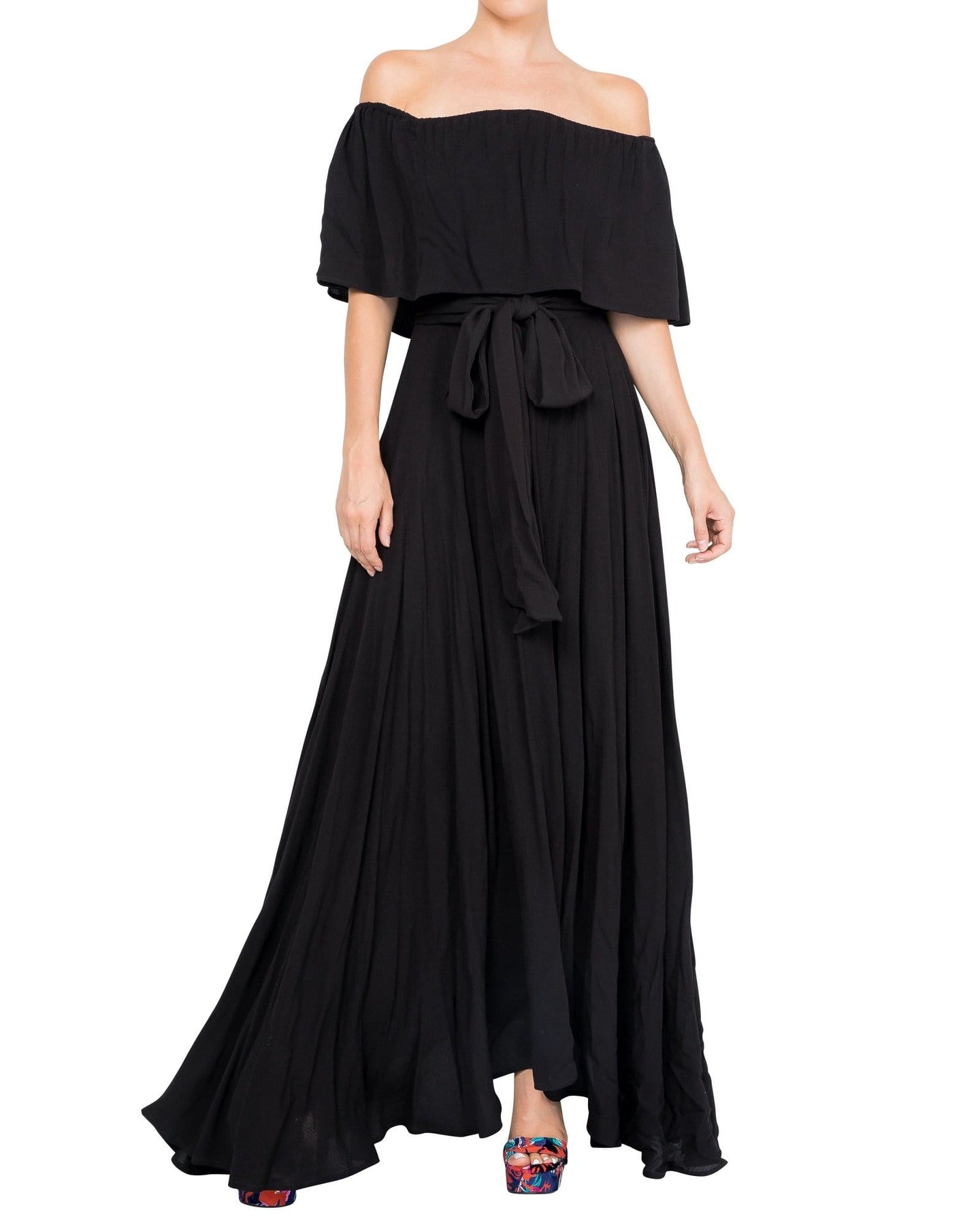 This versatile strapless maxi dress has an elasticized top neckline with an attached ruffle flounce that can be worn on or off the shoulder.