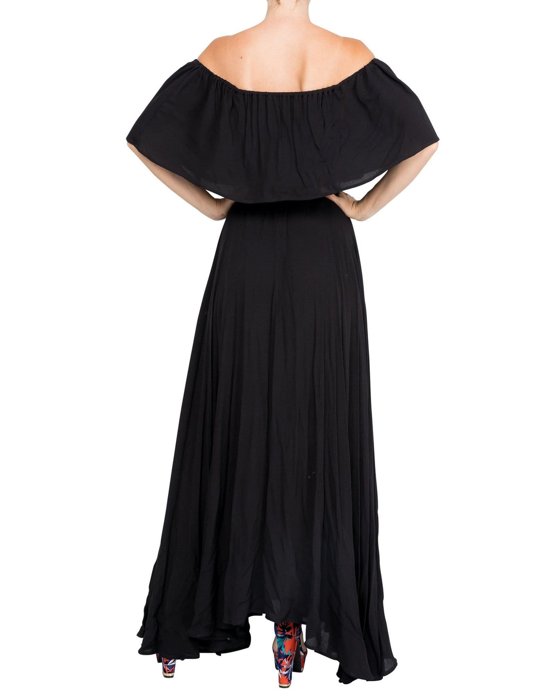 The full, sweeping circle maxi skirt adds just the right amount of drama for a show- stopping entrance that will turn heads.  There is a removable self fabric sash at the elasticized waistband.  This ultra flattering dress is cut from a butter soft crinkled rayon in an opaque jet black hue. The skirt is partially lined.