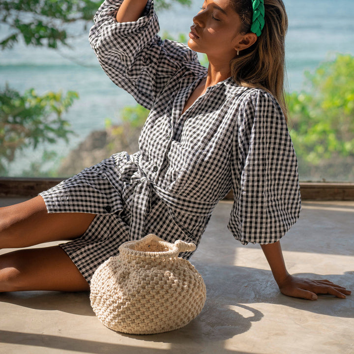 This bucket bag is made with macrame cotton ropes by our female artisan community in Java, Indonesia. It takes at least around 80 hours to make each bag, and this project helps to provide jobs and security for the artisans in this region.