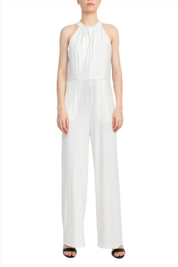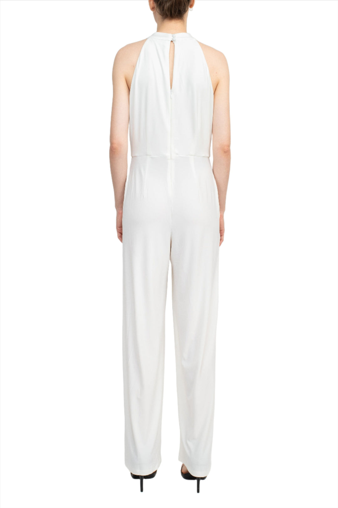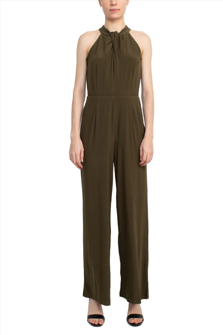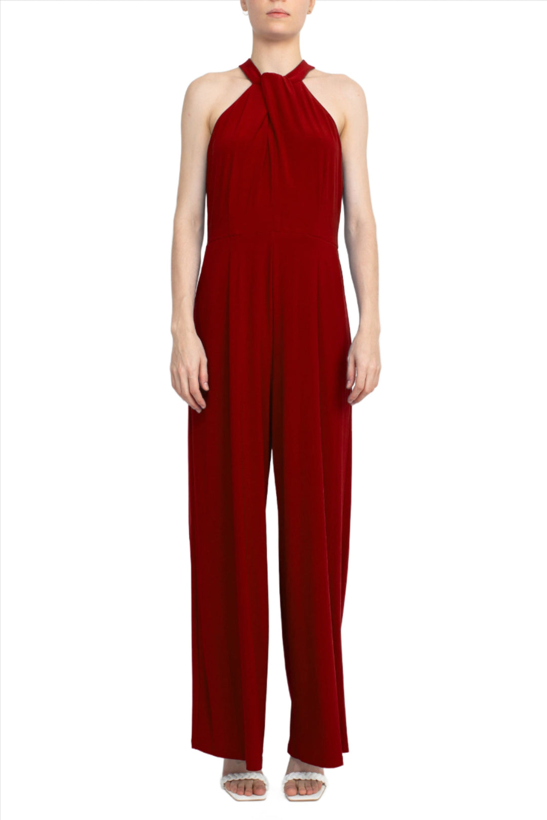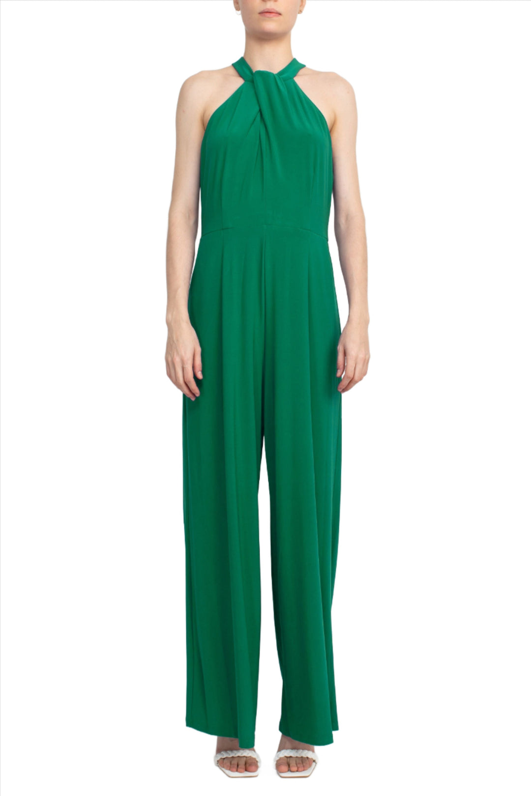 Nina Leonard Crossed Neck Sleeveless Keyhole Back Solid Jersey Jumpsuit