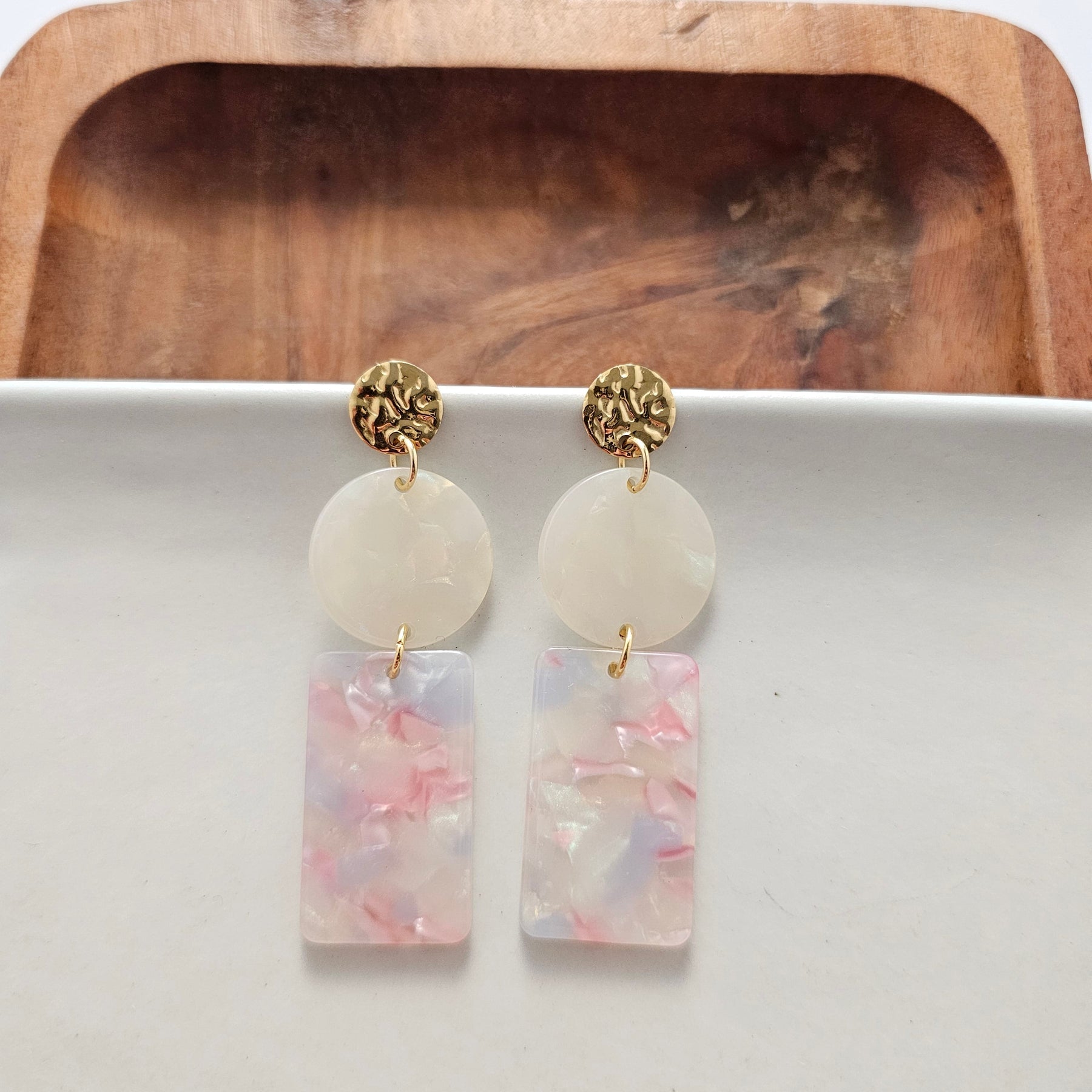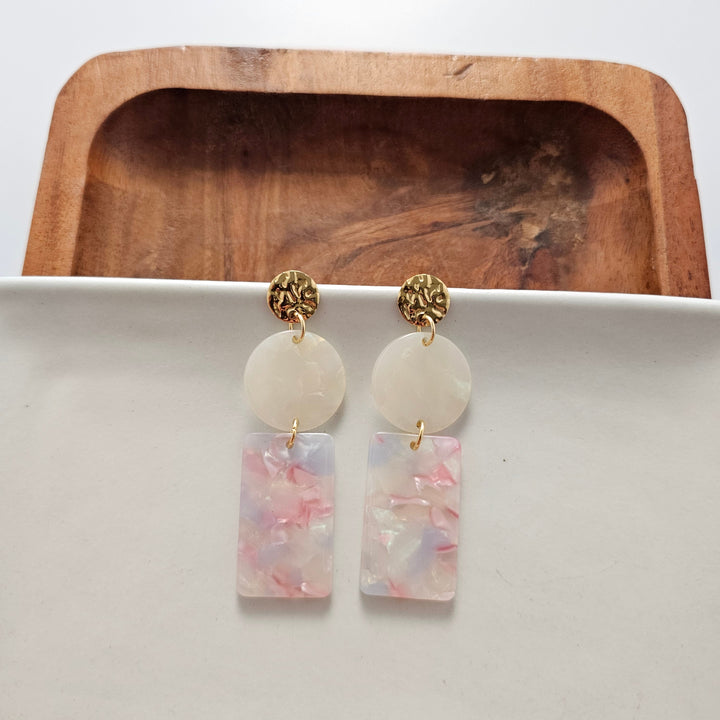 Add some fun and flair to your outfit with the Nora Earrings! These statement earrings feature circular and rectangular acrylic charms and gold posts. Make a statement with these unique and stylish earrings.