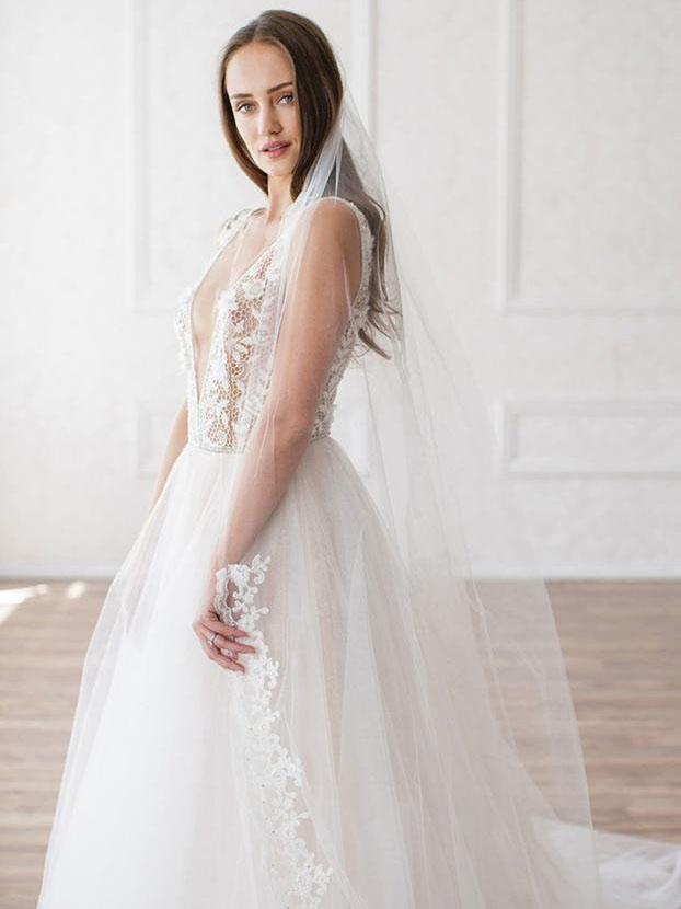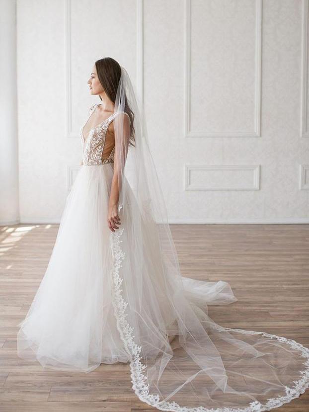 This is a delicately hand sewn single tier with a 3" floral Alencon lace edge with scattered rhinestone accents. The lace detail starts 36 inches from the wire comb.