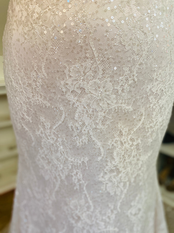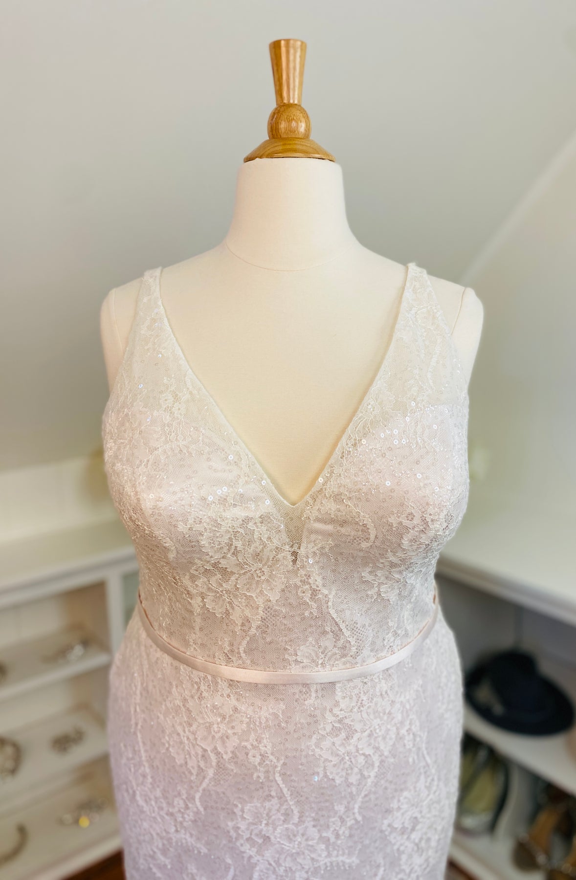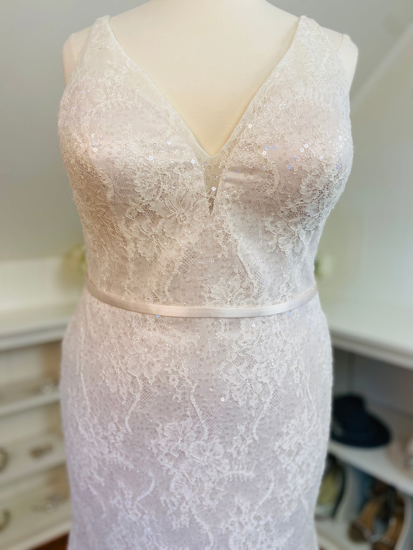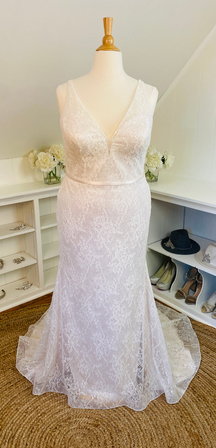 Sale wedding dresses, bridal party dresses and bridal accessories come to us directly from small independent retailers and brands and are mostly discontinued samples.  This merchandise has never been previously purchased or altered, and while most of these goods are in immaculate condition normal wear and tear can occur during previous try on.  Any defects outside of normal wear are disclosed in each listing.