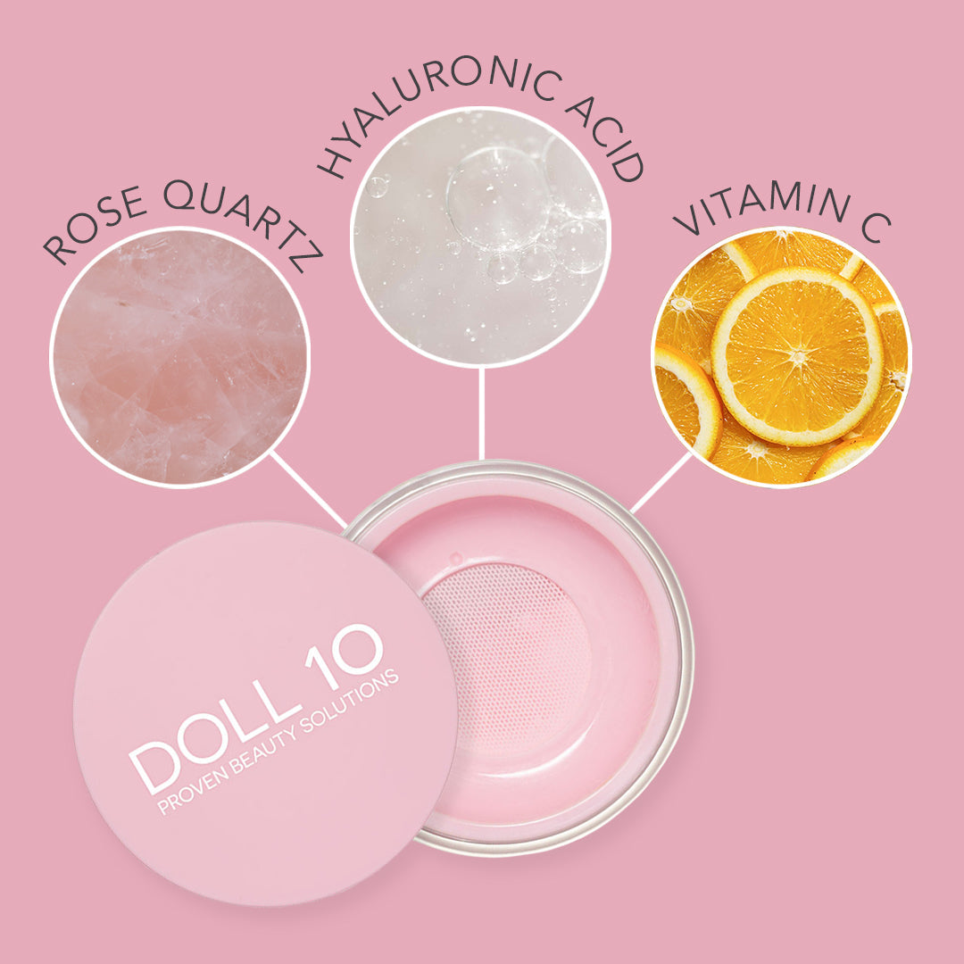 The  Doll Skin™ Pink Power Brightening Treatment Powder is an ultra-blurring, weightless powder that creates a photo-friendly, airbrushed-look finish. This silky loose powder is fortified with Vitamin C, Bamboo Extract, Peptides, Hyaluronic Acid & Rose Quartz to help nourish, brighten and smooth skin’s appearance.