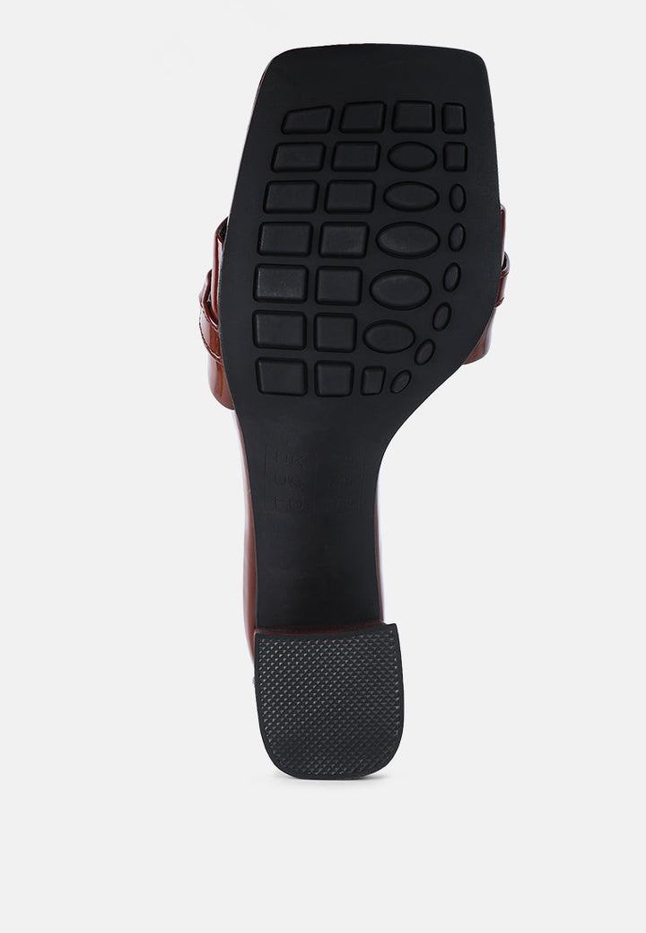 Crafted with fine finish and construction, this pair of patent pleather block-heeled sandals have a smooth metal chain detail on top. Which adds a glamourous detail on the pair!