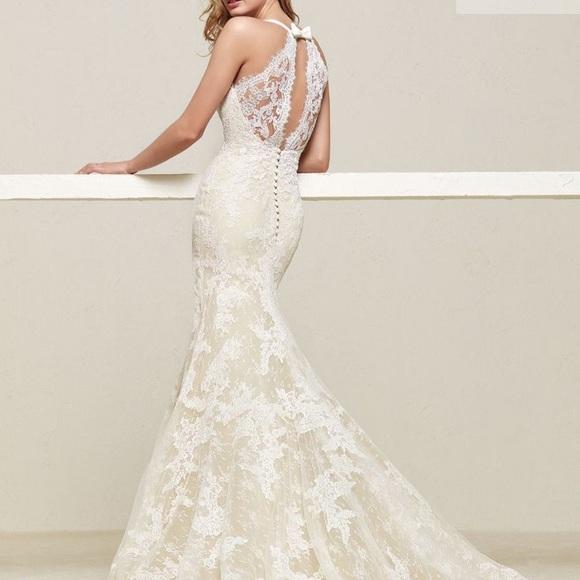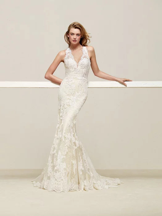 This mermaid dress has a sensual halter neck in lace with central opening and sophisticated grosgrain bow. The V-neck plays with transparencies and blends at the waist into a fitted skirt that opens out at the bottom into a beautiful lace and tulle train. Gemstone appliqués give lots of sparkle to this dazzling design.