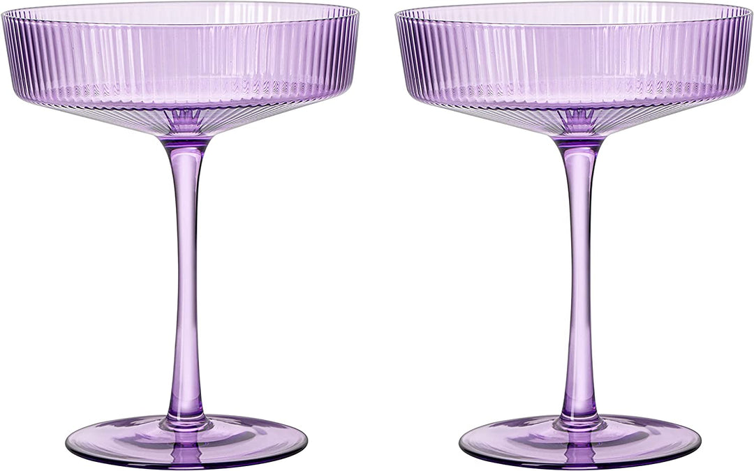 Ribbed Coupe Cocktail Glasses 8 oz | Set of 2 | Classic Manhattan Glasses For Cocktails, Champagne Coupe, Ripple Coupe Glasses, Art Deco Gatsby Vintage, Crystal with Stems (Lavender, Set of 2) by The Wine Savant