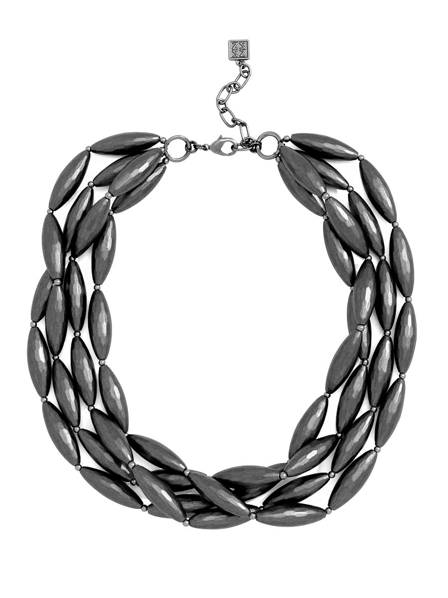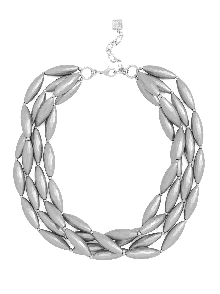 The Savannah spindle collar necklace evokes a timeless statement appeal. This design features three strands of modern spindle shapes with triple plating and a lobster claw closure.