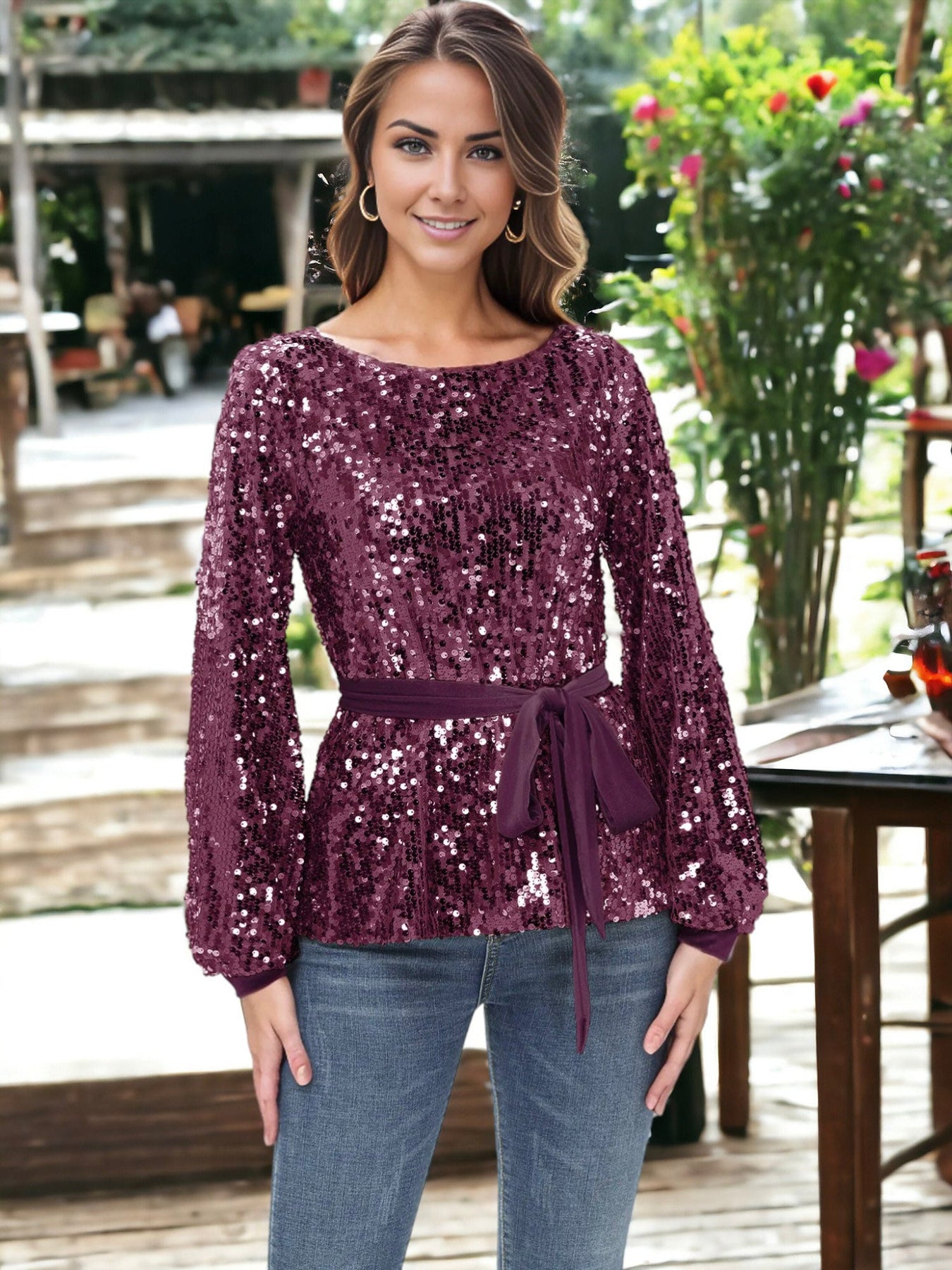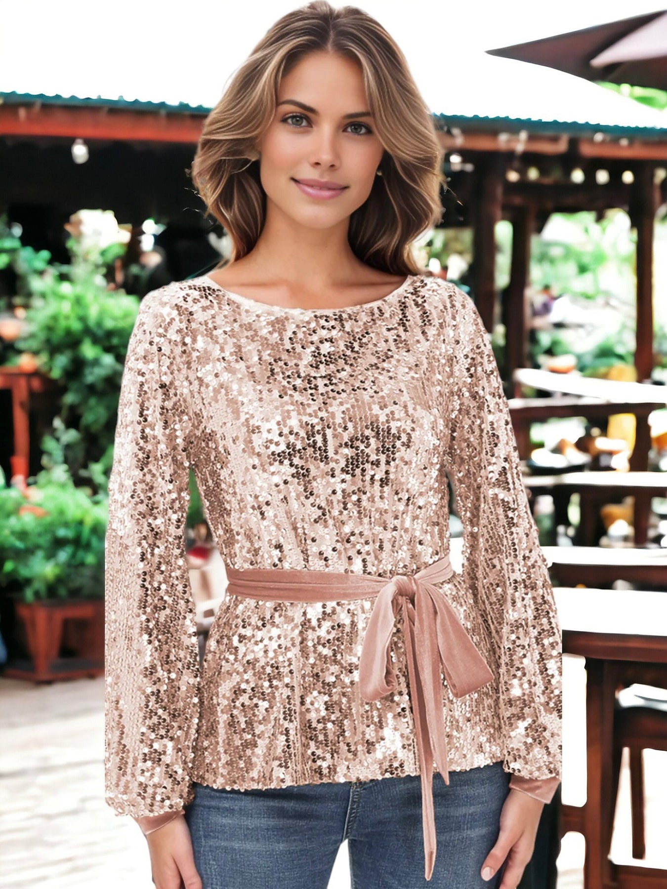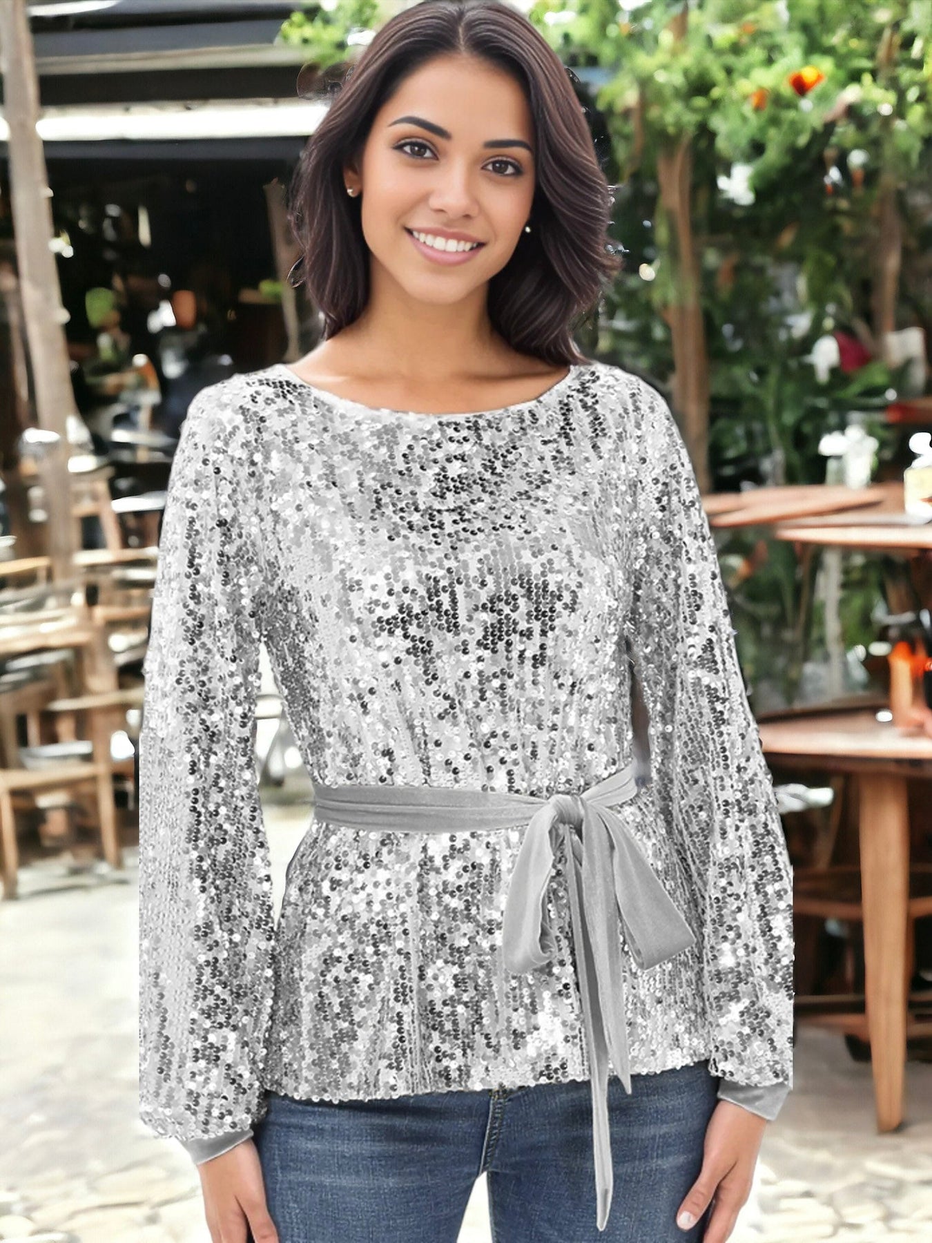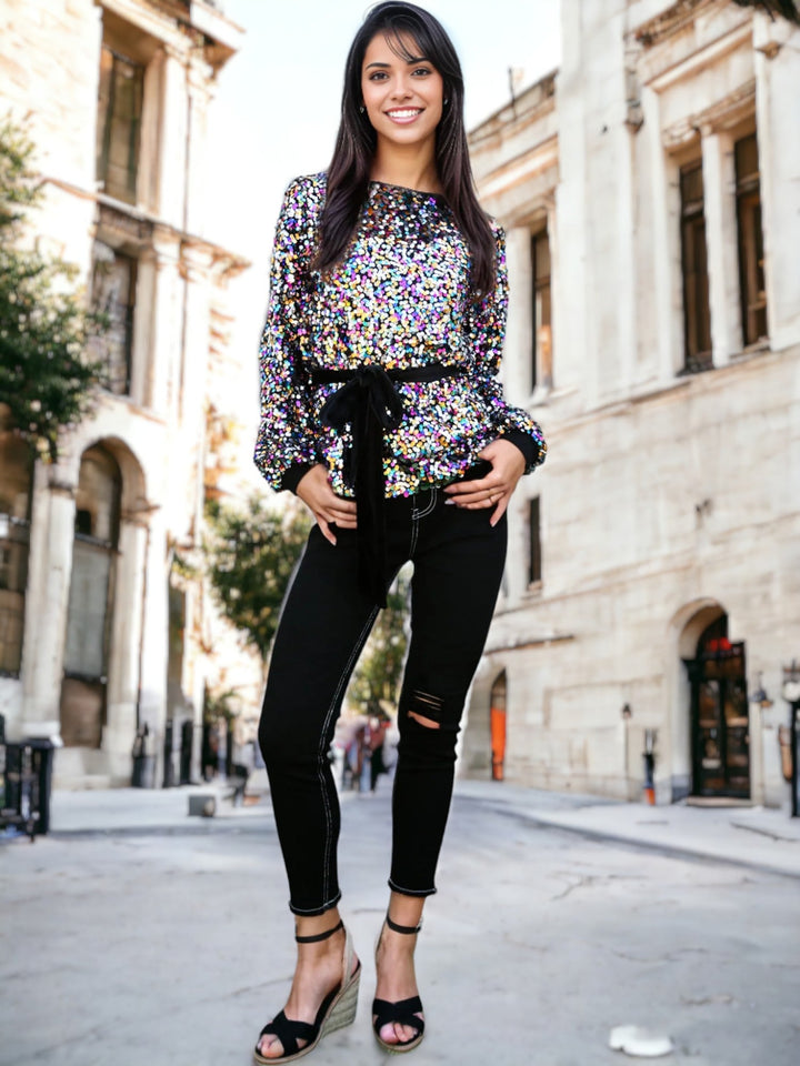 Redefine glamour with our Sequin Party Tie Waist Sweatshirt Pullover Top. The sparkling sequins add a touch of sophistication to this stylish top. Featuring a trendy tie waist, it effortlessly combines comfort and chic. Perfect for parties or casual outings, this top is a versatile addition to your wardrobe. Elevate your style and make a statement with the Sequin Party Tie Waist Sweatshirt Pullover Top.