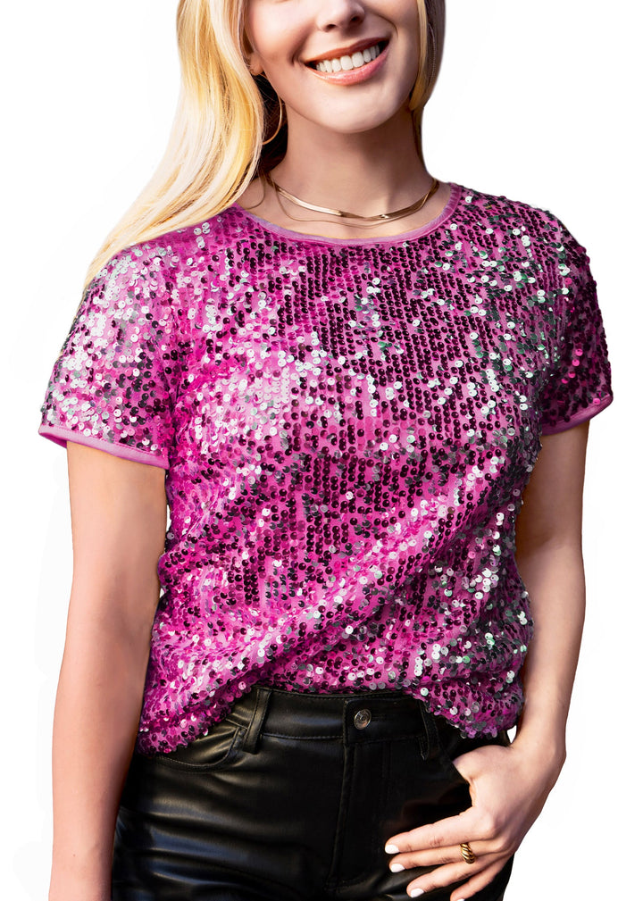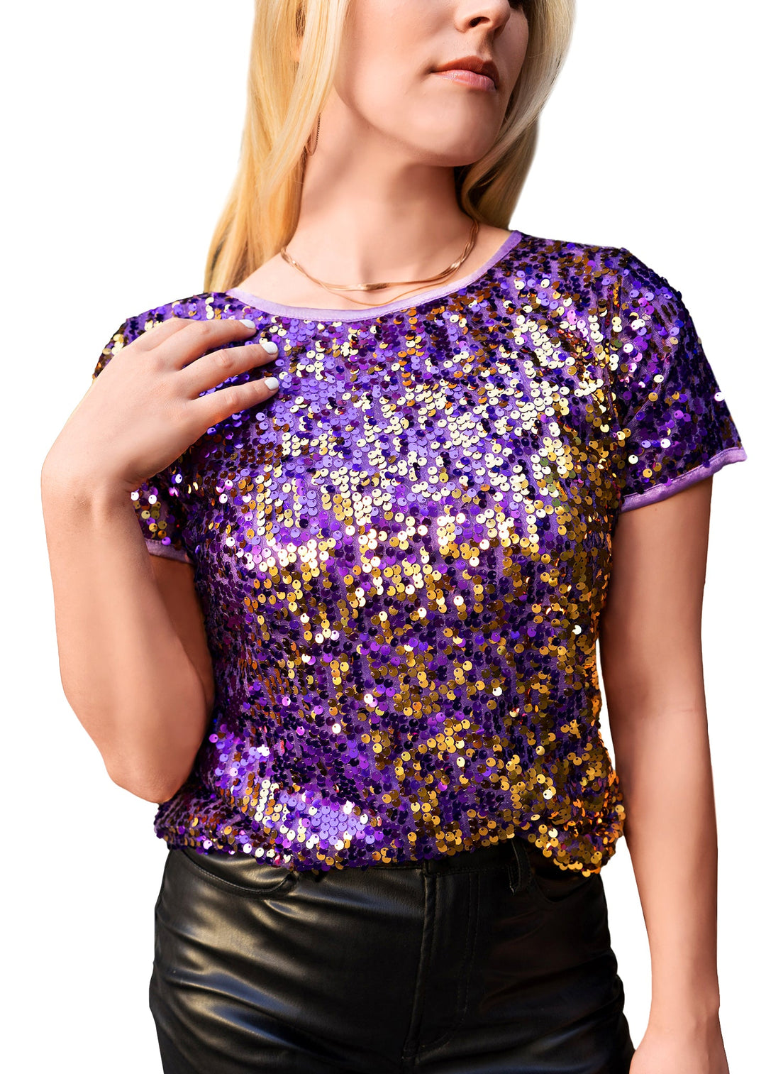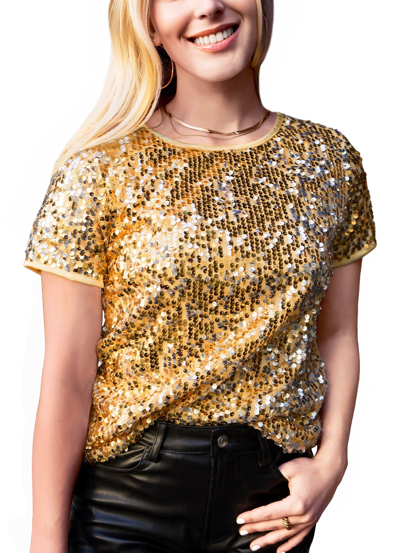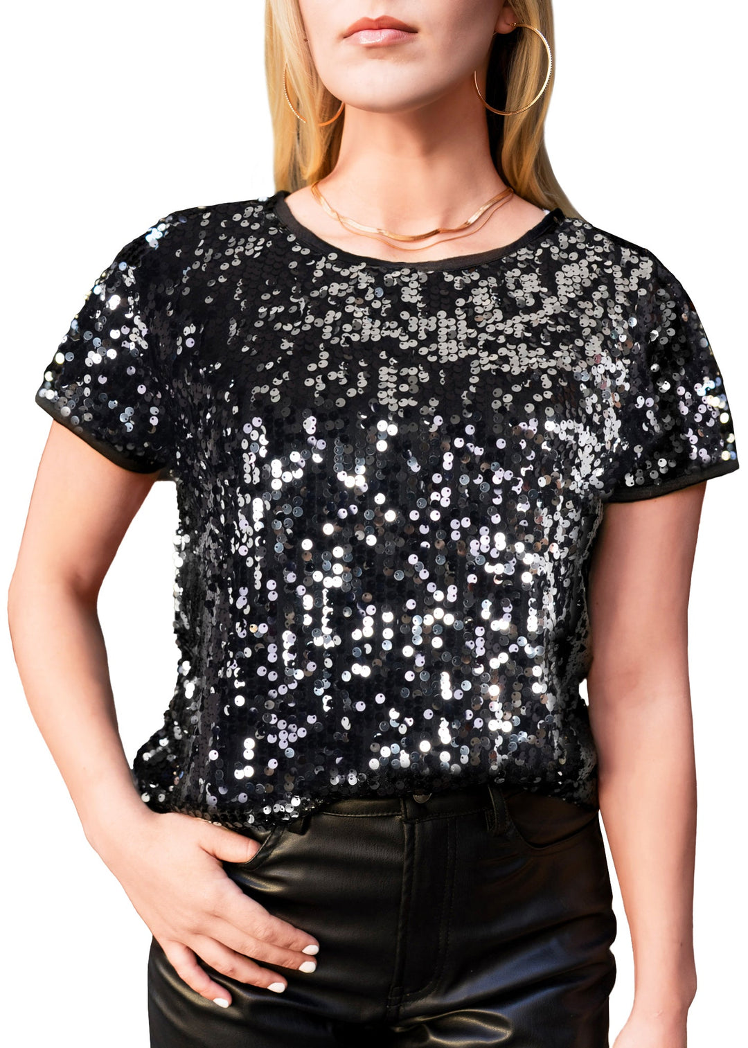 Sequin Short Sleeve Sparkly Shirt Round Neck Blouse