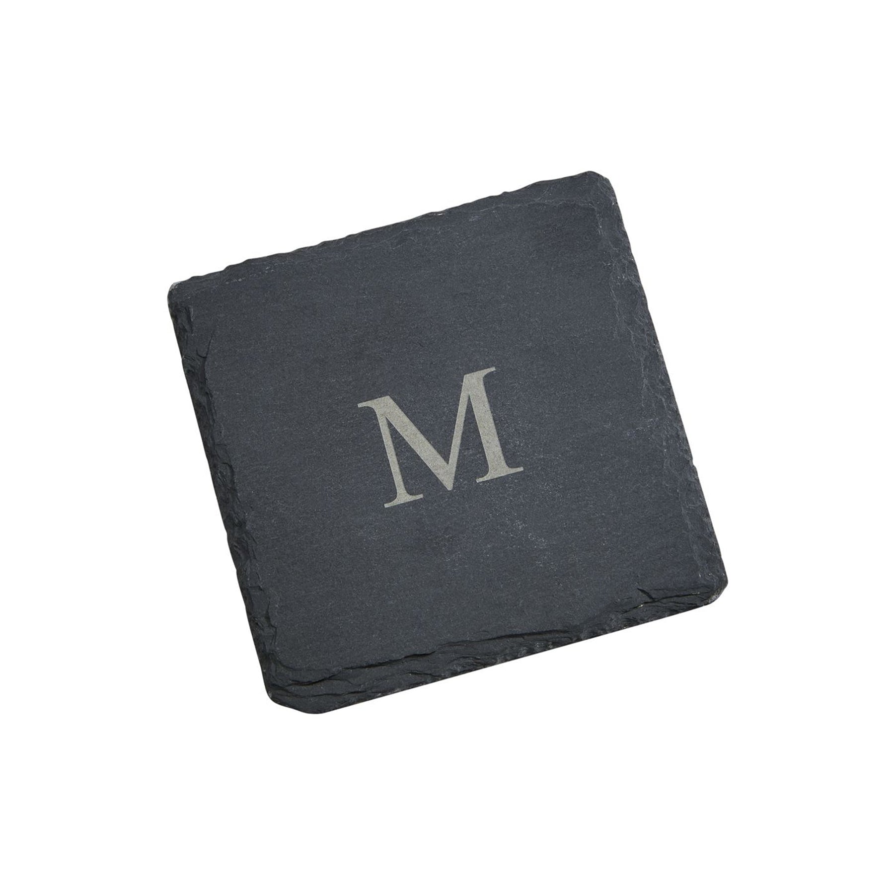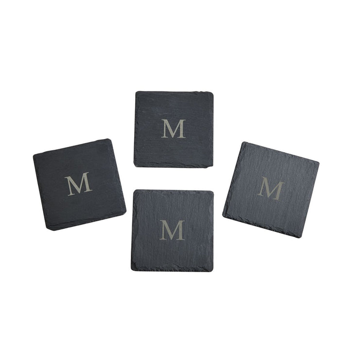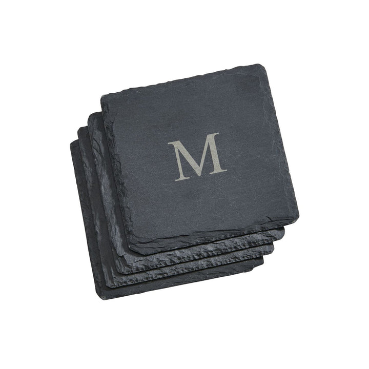 These 4" square genuine natural slate coasters feature textured edges and 4 padded feet on each coaster. Intended as coasters, we've heard of uses as mini-cheese or snack servers, and even buffet signs too. Write on them with chalk - it wipes clean with a damp cloth. You can add a laser etched monogram, too (engraving available - check for additional cost if applicable). The set of four makes a great housewarming or wedding gift. Gift boxed.