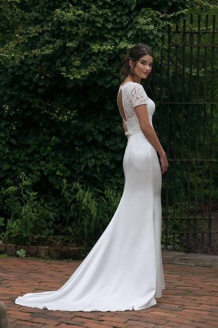 An allover lace short sleeve bodice pairs with a satin skirt to create a soft, wedding day look. Finished with a detachable lace peplum to give you an option of that added feminine touch.