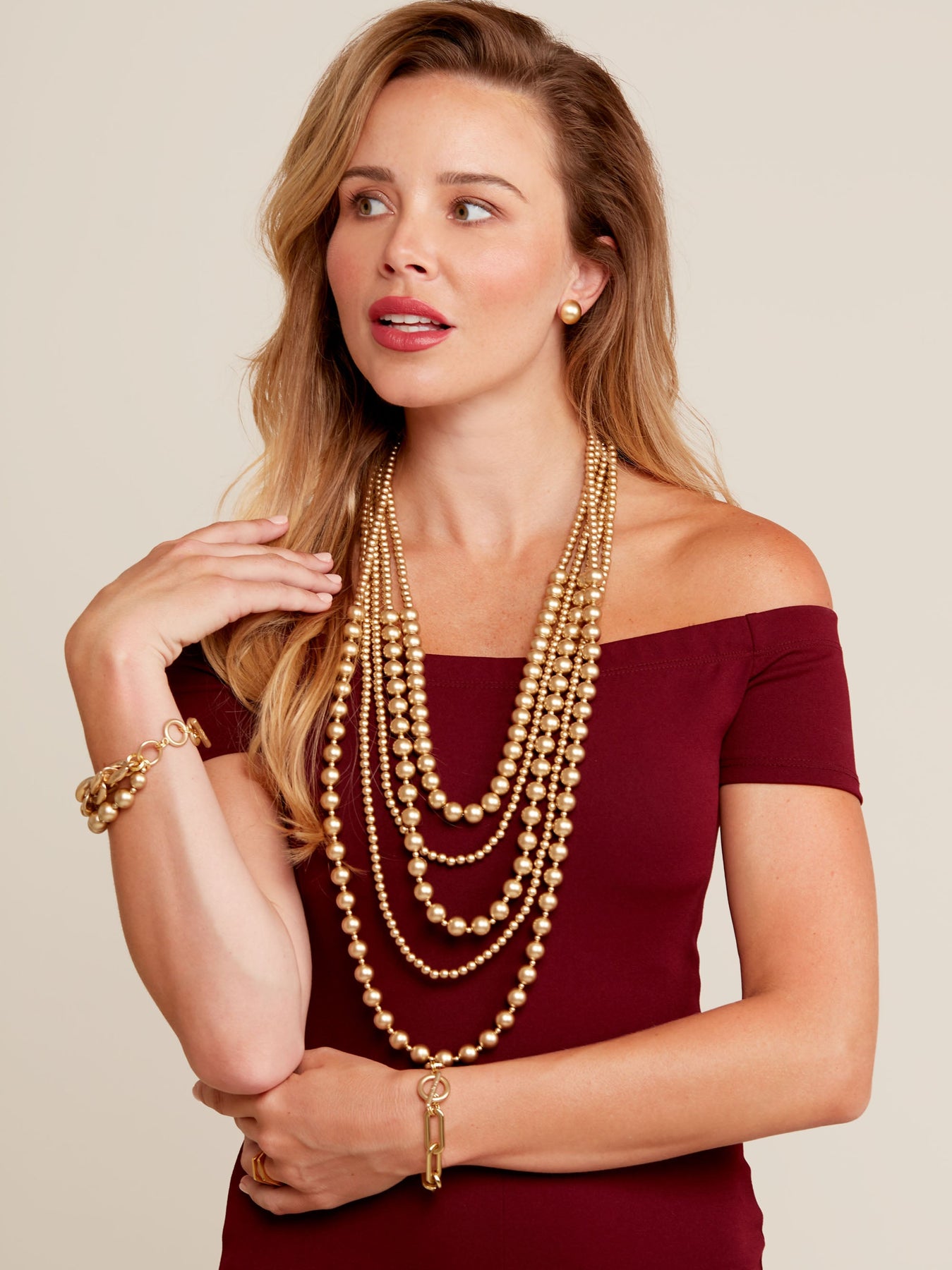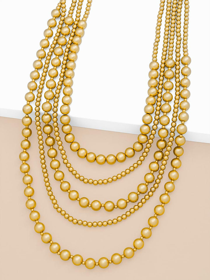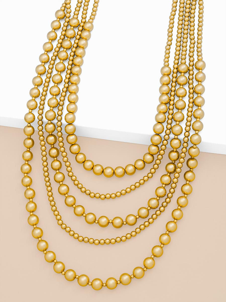 A showstopper if there ever was one. This five-layer beauty designed with multi-sized matte golden beads is the perfect foundation for your necklace stack.