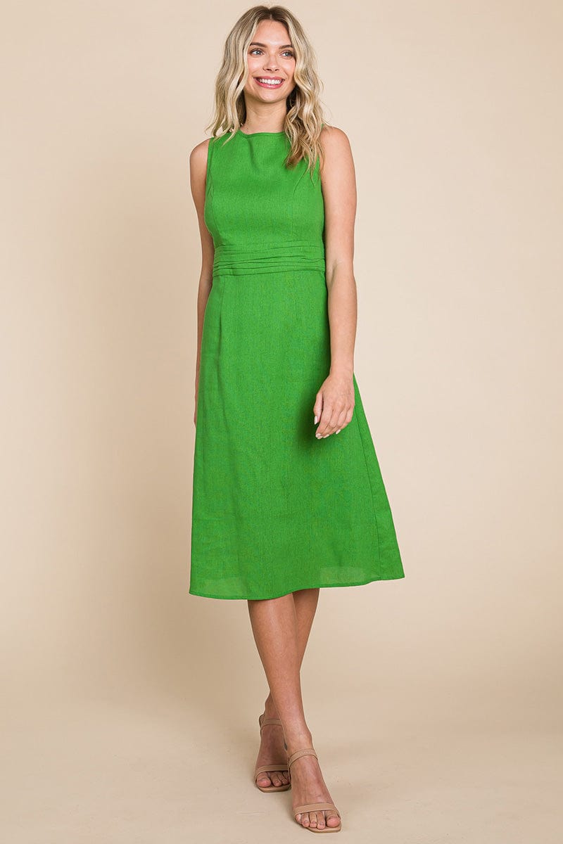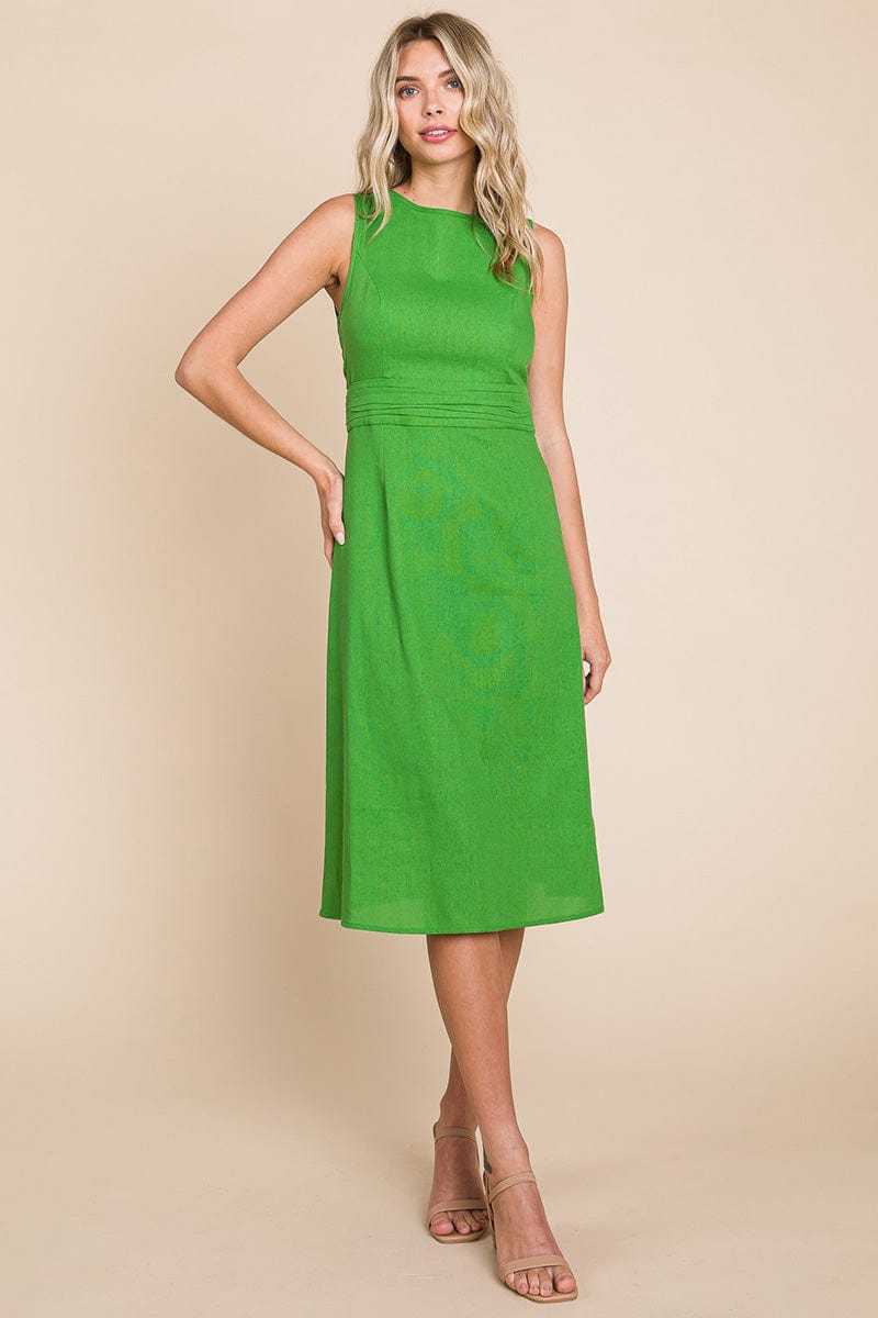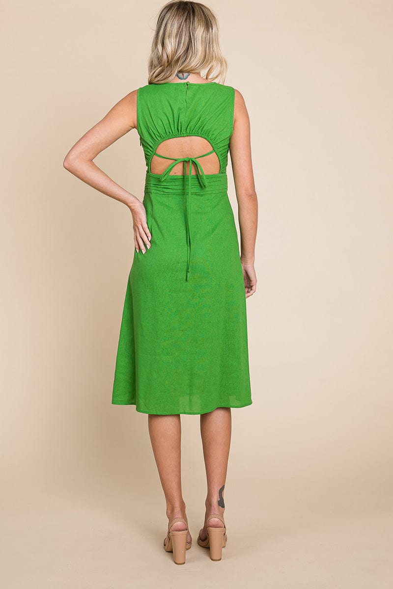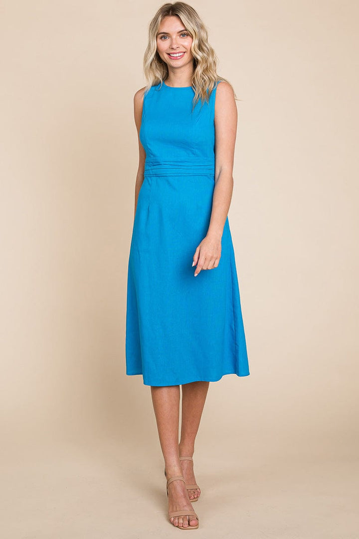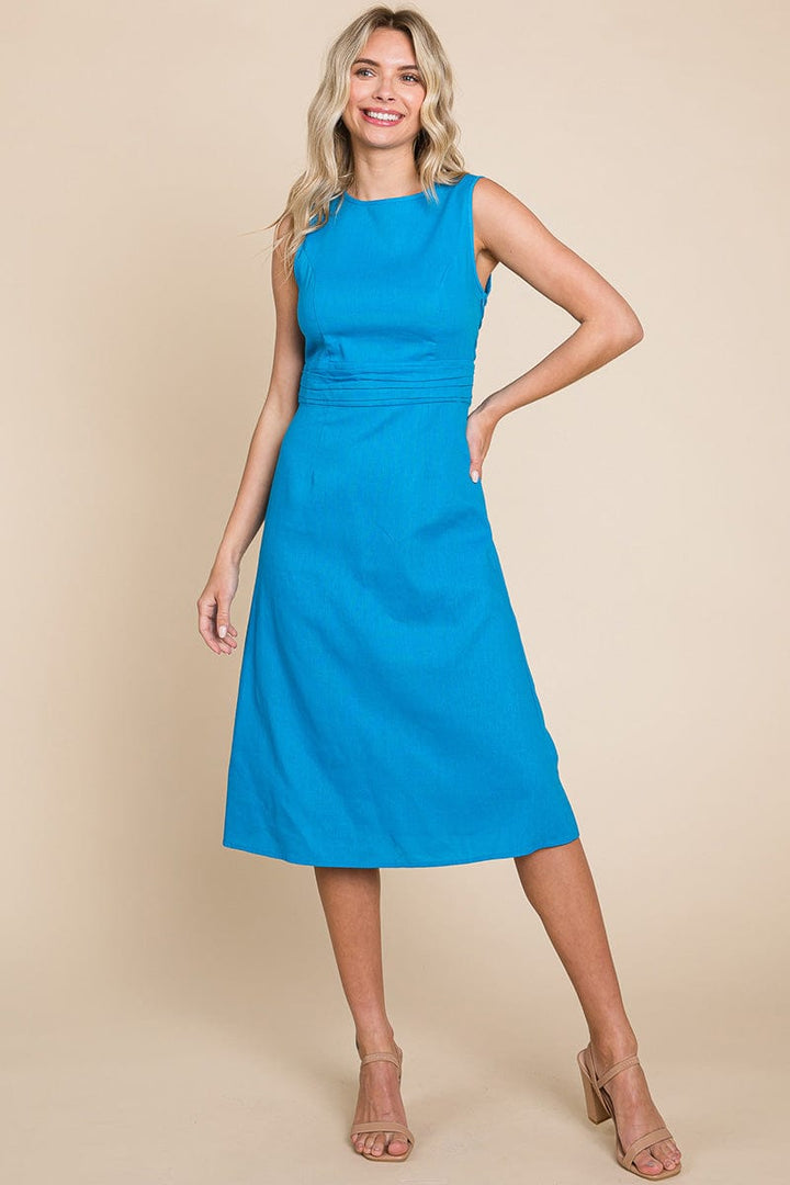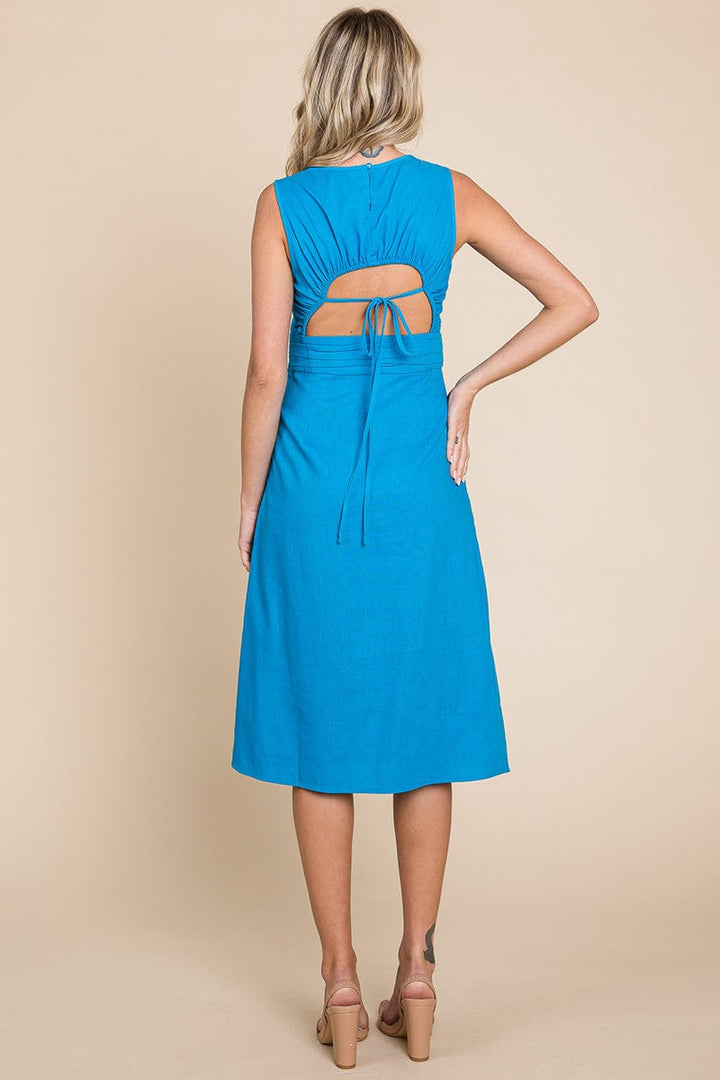 Sleeveless Tied Backless Pleated Midi Linen Dress by RolyPoly Apparel