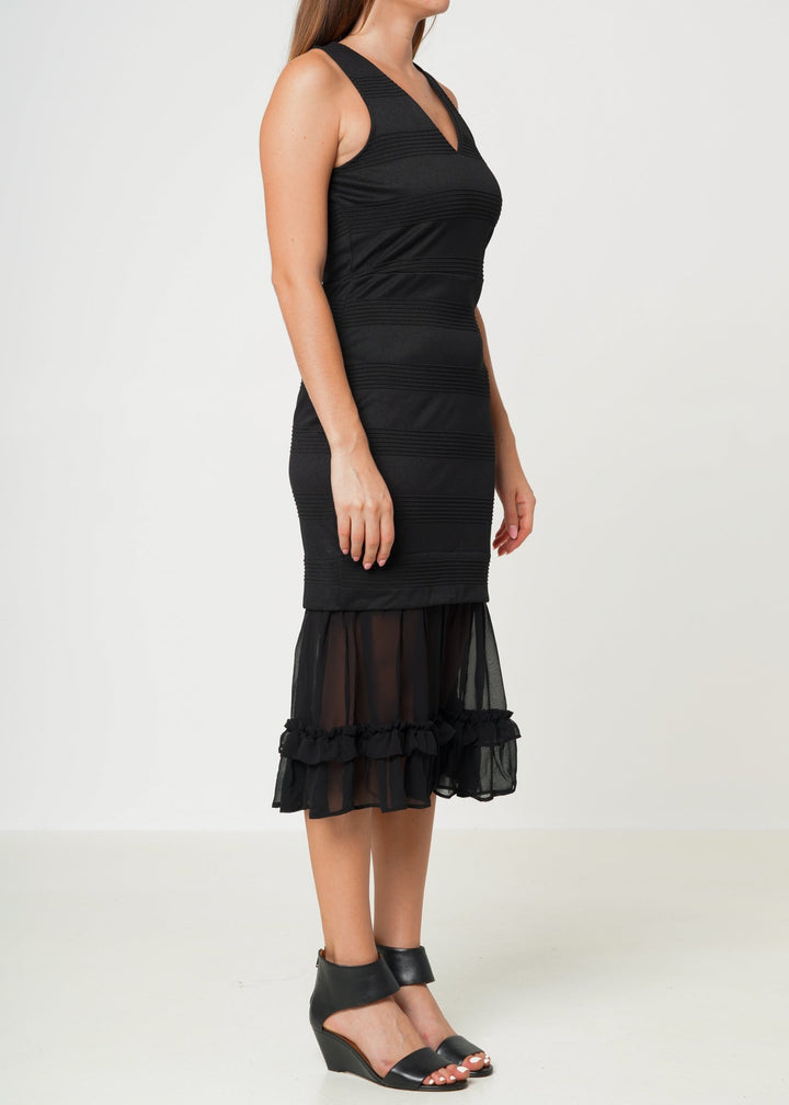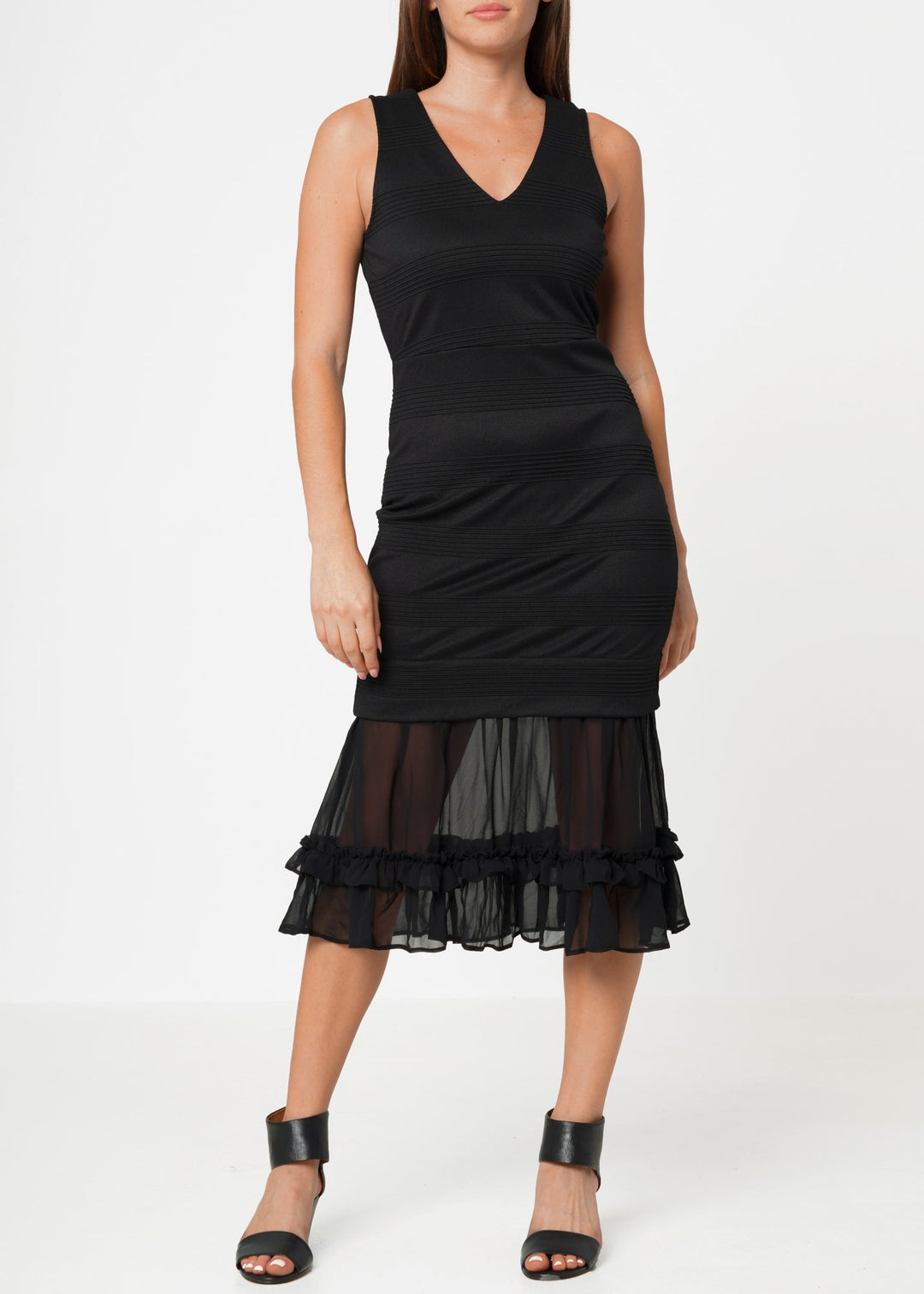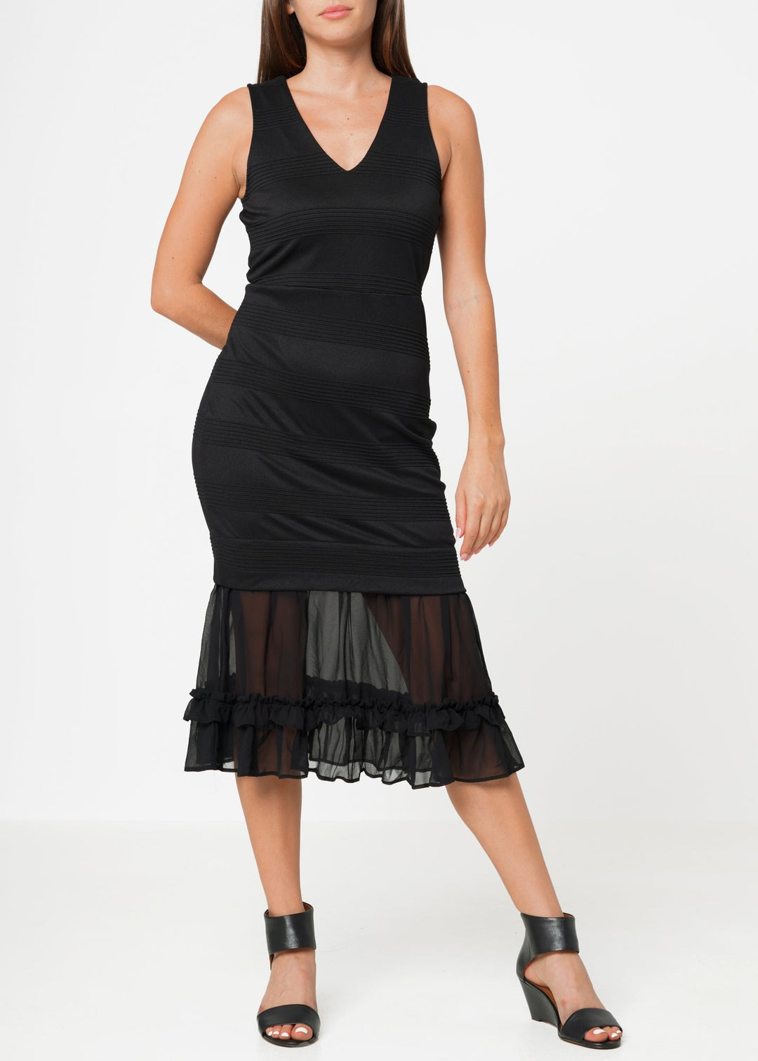 Sleeveless V-neck Sheer Ruffle Hem Bodycon Dress In Black