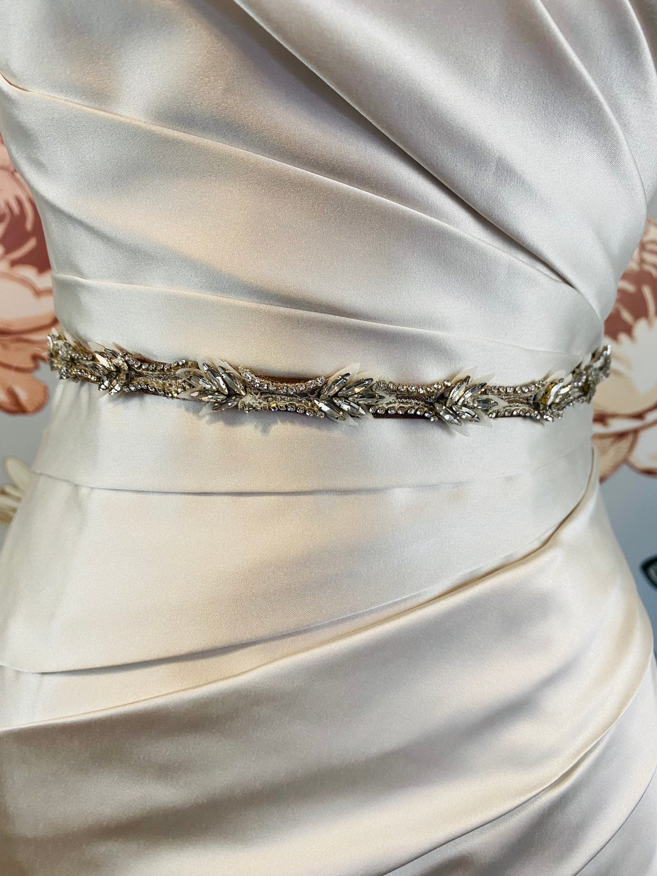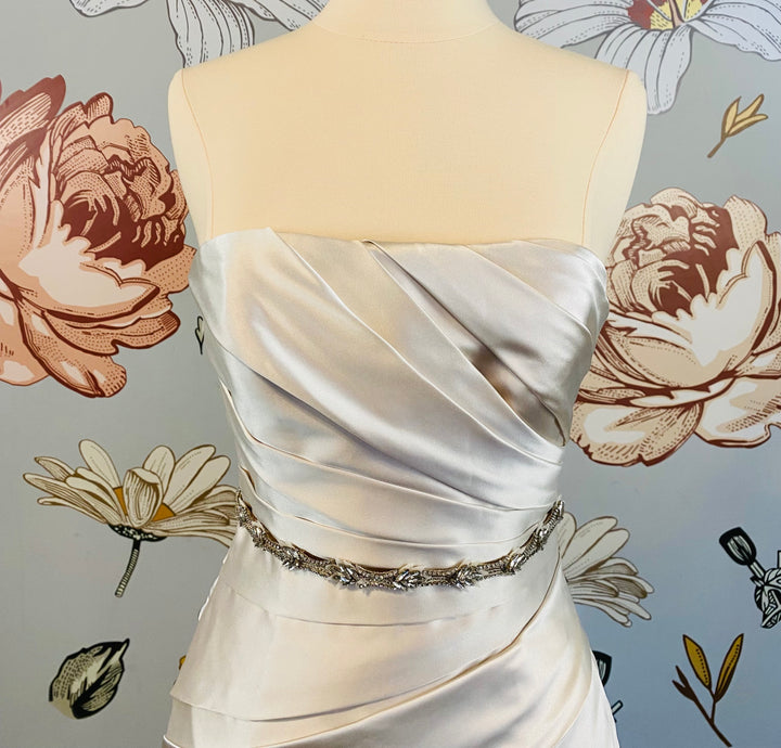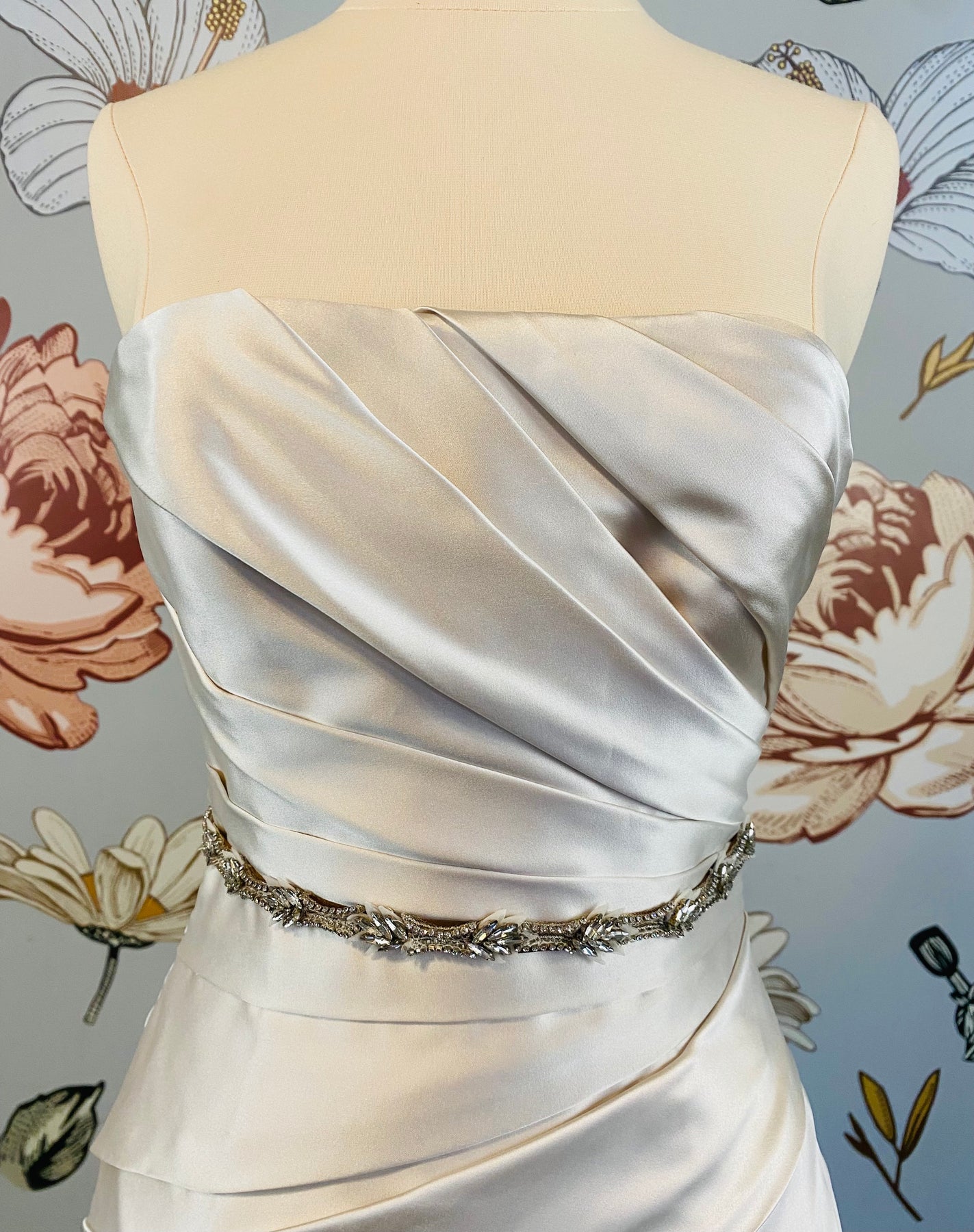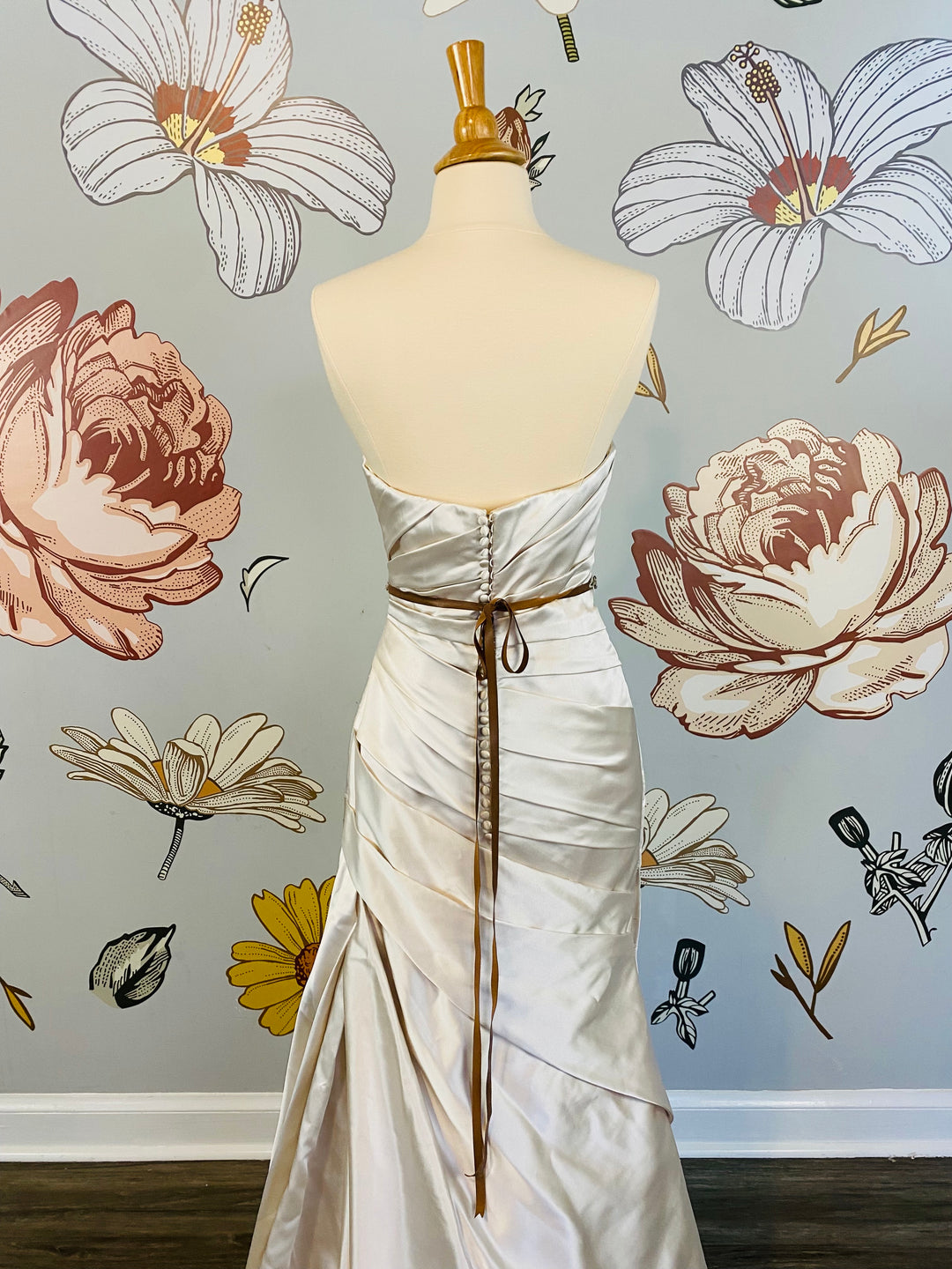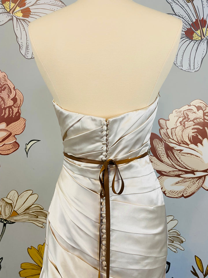 Sale wedding dresses, bridal party dresses and bridal accessories come to us directly from small independent retailers and brands and are mostly discontinued samples.  This merchandise has never been previously purchased or altered, and while most of these goods are in immaculate condition normal wear and tear can occur during previous try on.  Any defects outside of normal wear are disclosed in each listing.