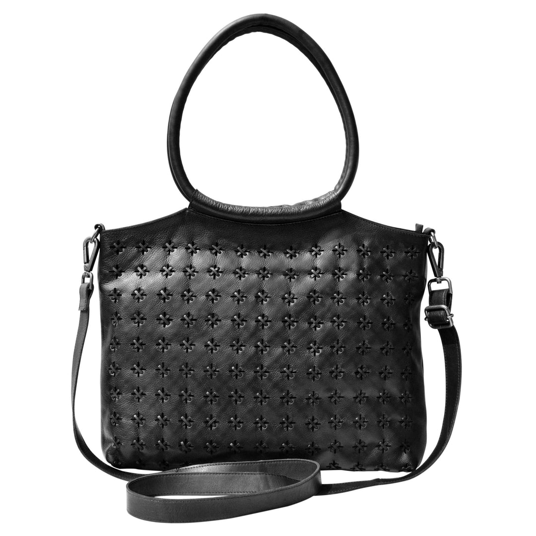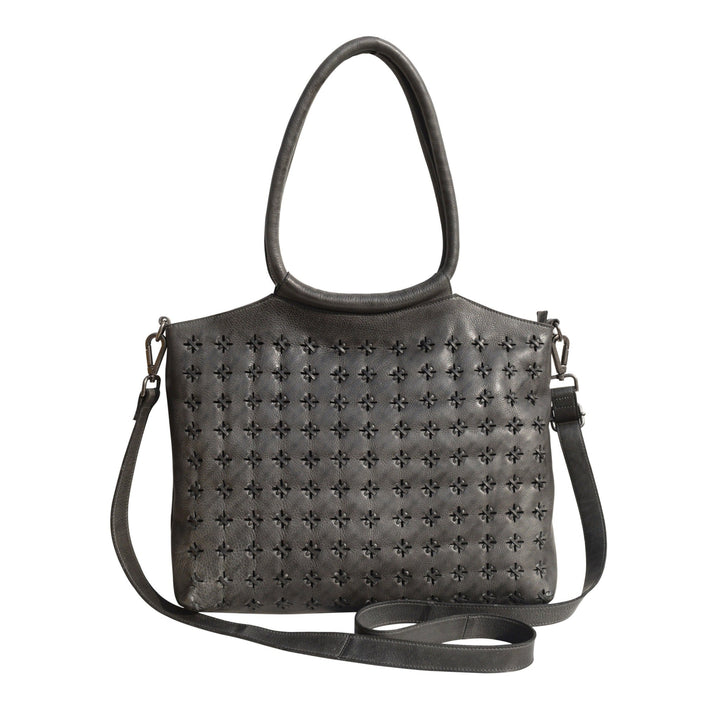 Rugged meets refined design in this handcrafted leather star stitch pattern tote. Round and lightly padded top handles are comfortable on the shoulder and in the hand. Bag can be worn with an adjustable crossbody strap. Multiple pockets for storage, hidden phone pocket, + complete interior organizer.