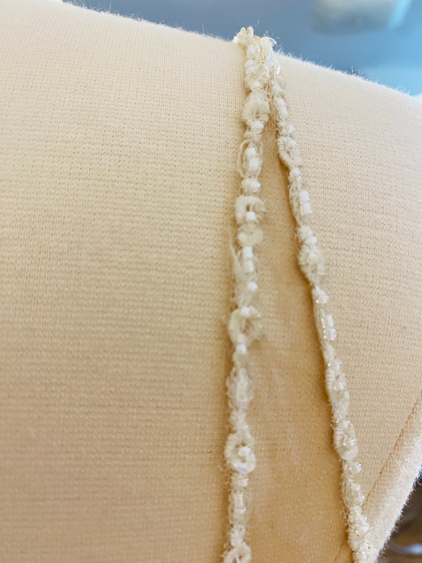 Condition: Good condition; Store sample (there's a hole in the sheer illusion on the left back, on each strap and the zipper base needs to be re-sewn.  There are a couple of buttons missing as well)