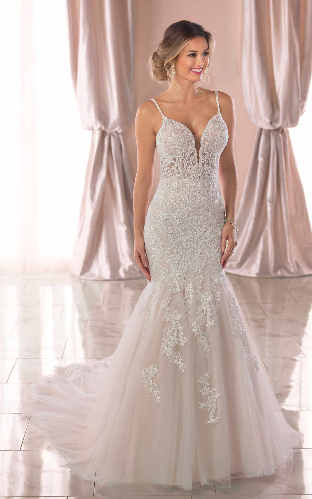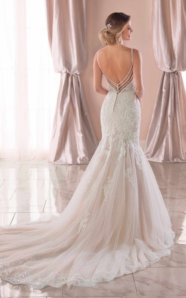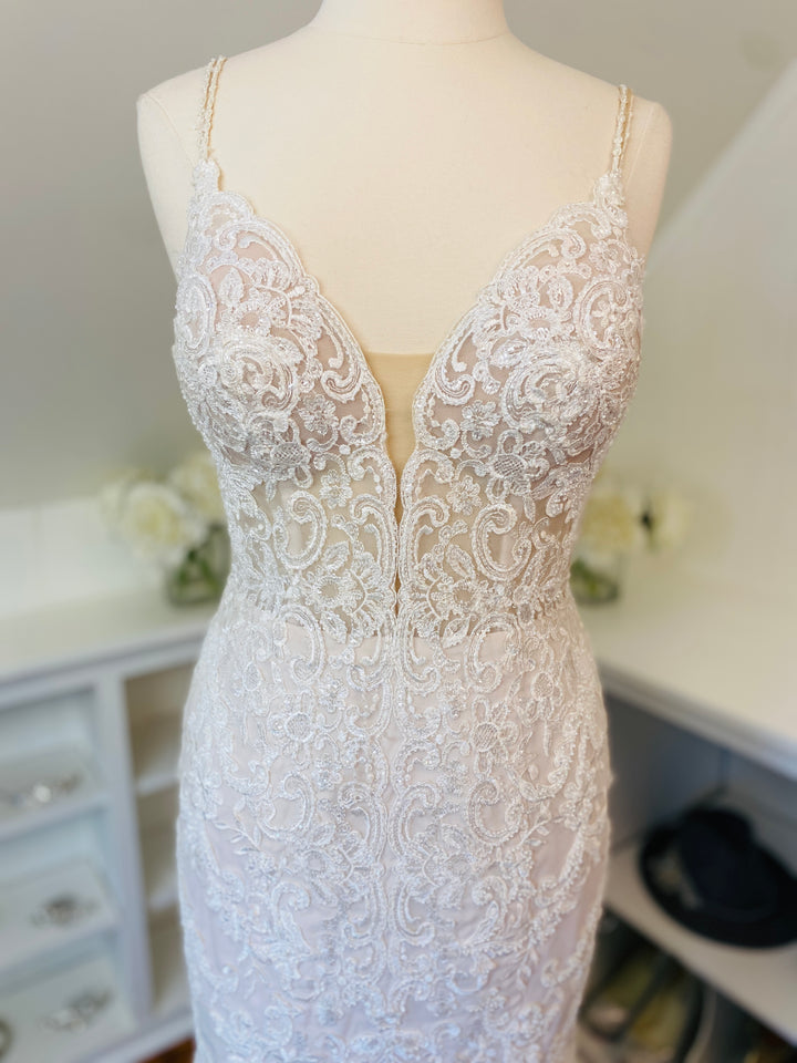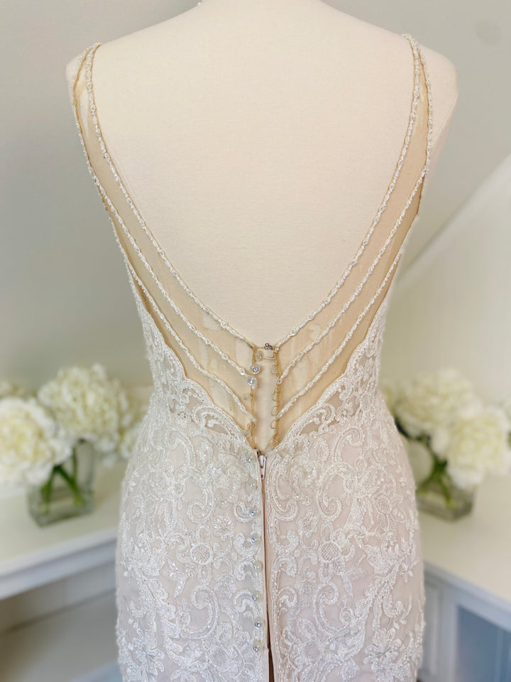 This wedding dress is far from ordinary! Subtly sheer, its lace and tulle composition is adorned with ornately beaded elements that will captivate brides everywhere. Its modernized mermaid silhouette showcases a sheer beaded lace bodice with a delicately scalloped plunge neckline, while intricate lace appliques swirl around the body to add definition and subtle curves. Beaded back straps converge at an open back with a beguiling linear pattern, and the frothy skirt and long train complete the look.
