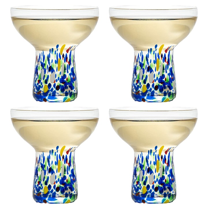 • These hand-blown, colorful glasses feature a timeless confetti design. Handcrafted by skilled artisans, these margarita glasses will be a true conversation starter.