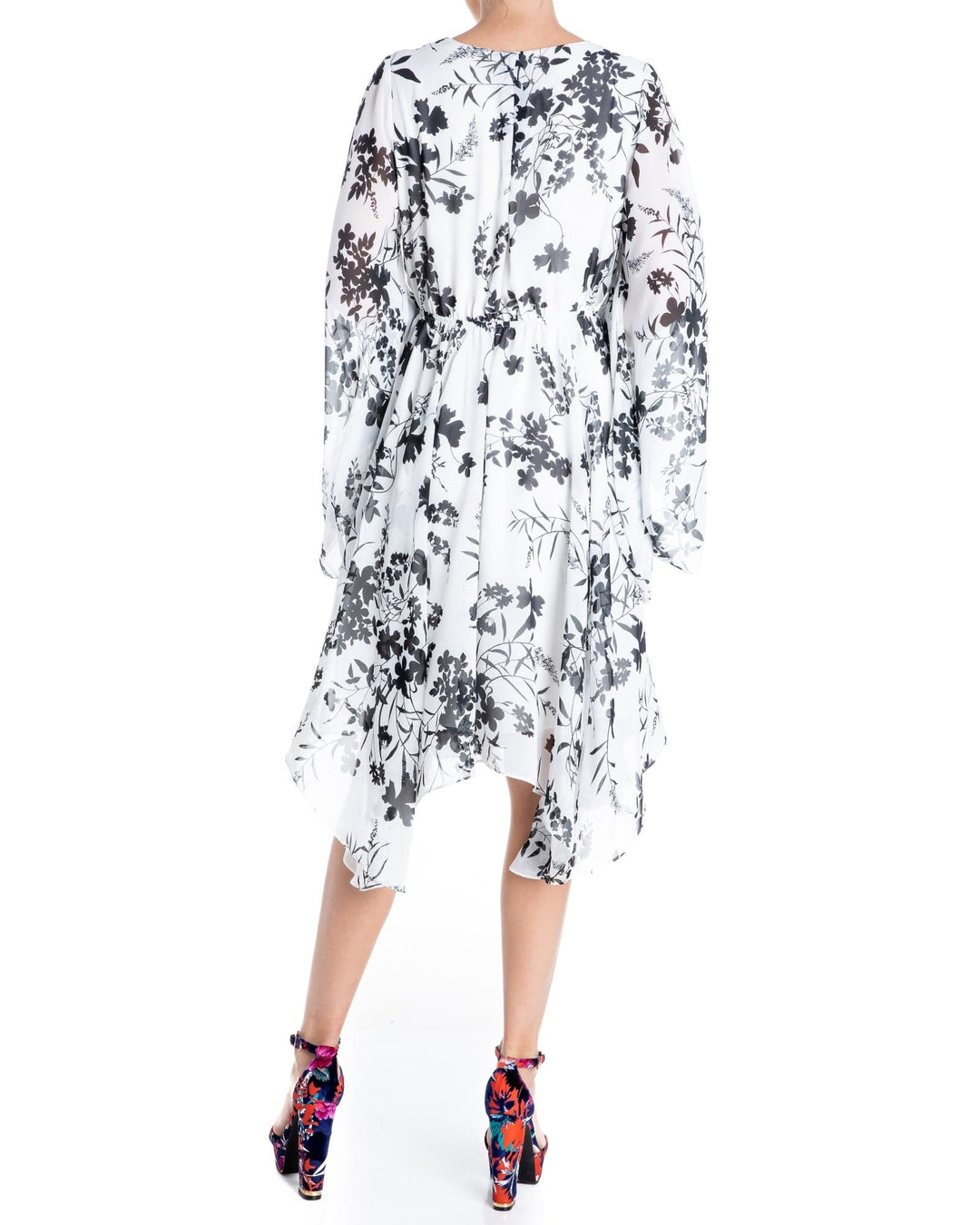 This striking dress has a center back neck pleat with a pull over fit that is unbelievably comfortable and easy to wear. This dress is cut from a lightweight, sheer chiffon fabrication with a large-scale tropical inspired print.