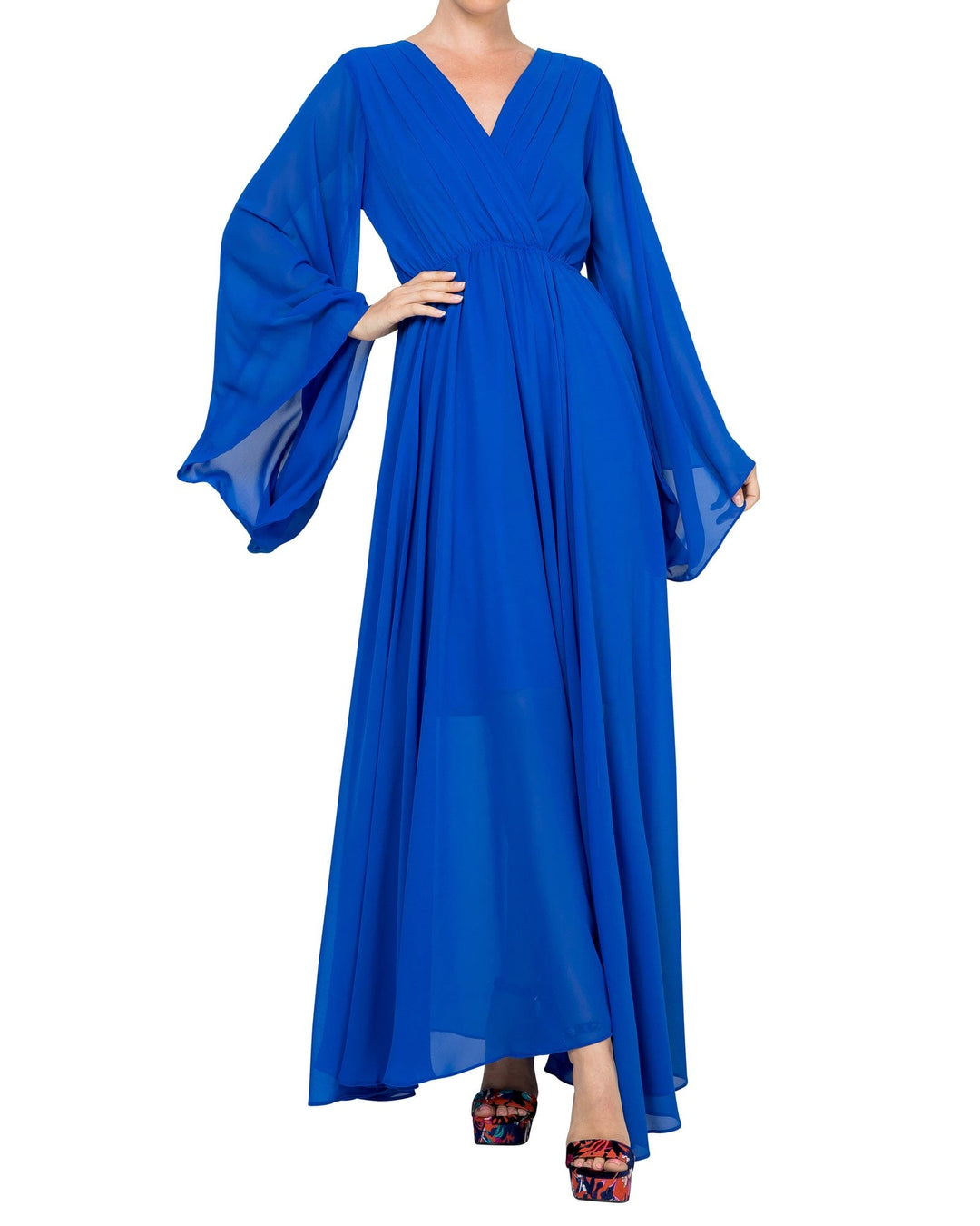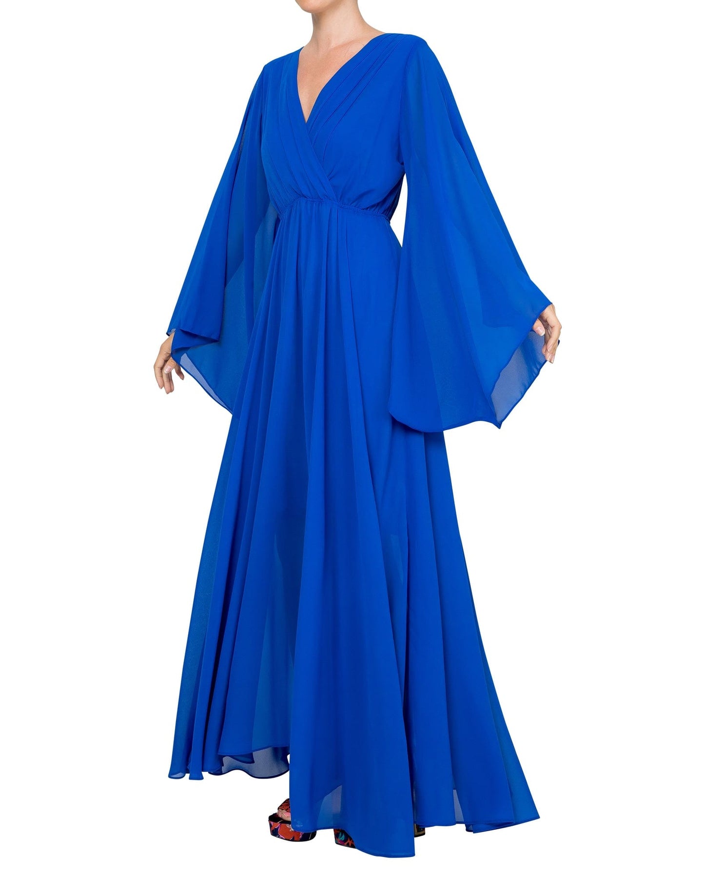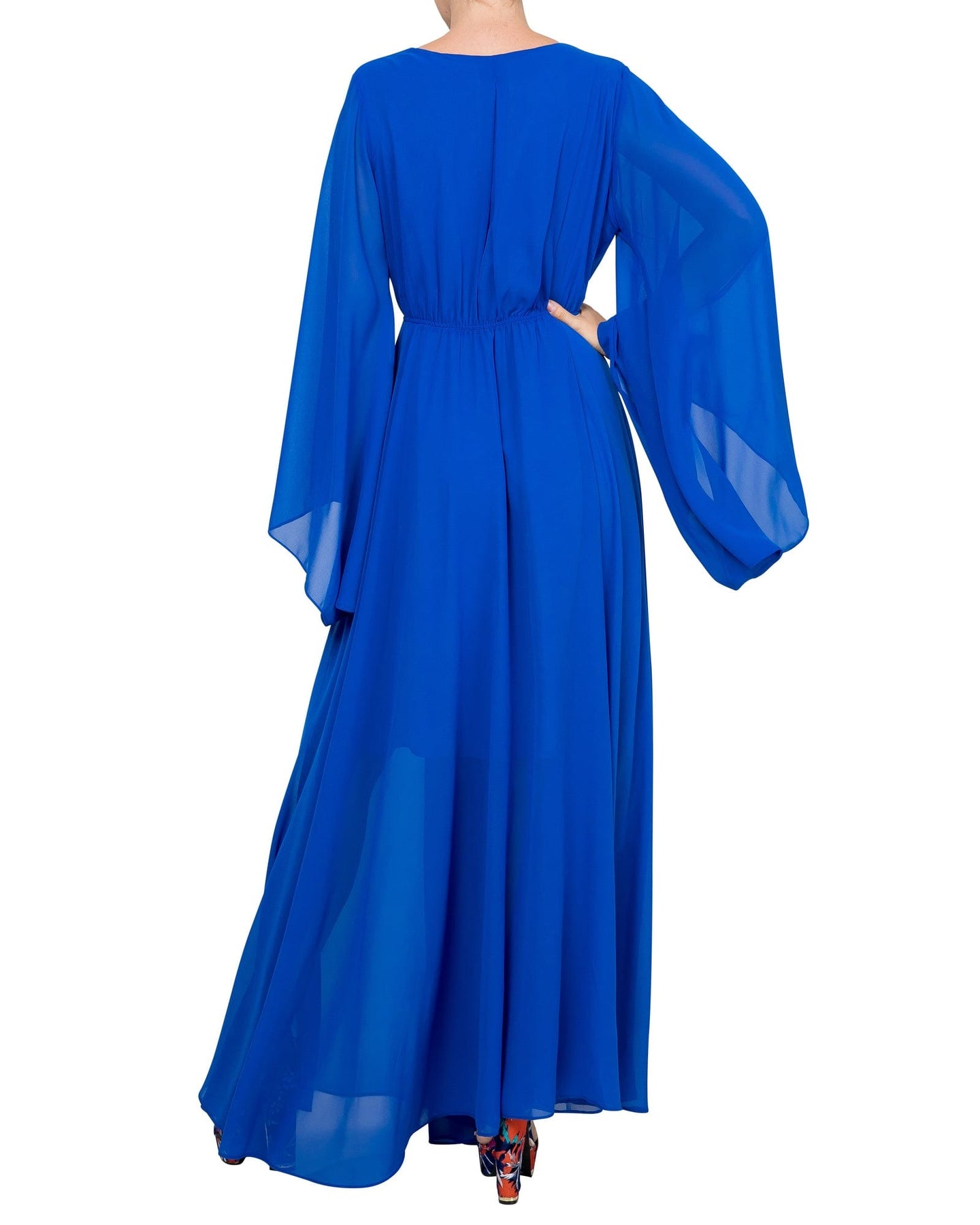 This striking maxi dress has a center back neck pleat with a pull over fit that is unbelievably comfortable and easy to wear. This maxi dress is cut from a lightweight, sheer chiffon fabrication with a vibrant royal blue hue and is partially lined to the knee.