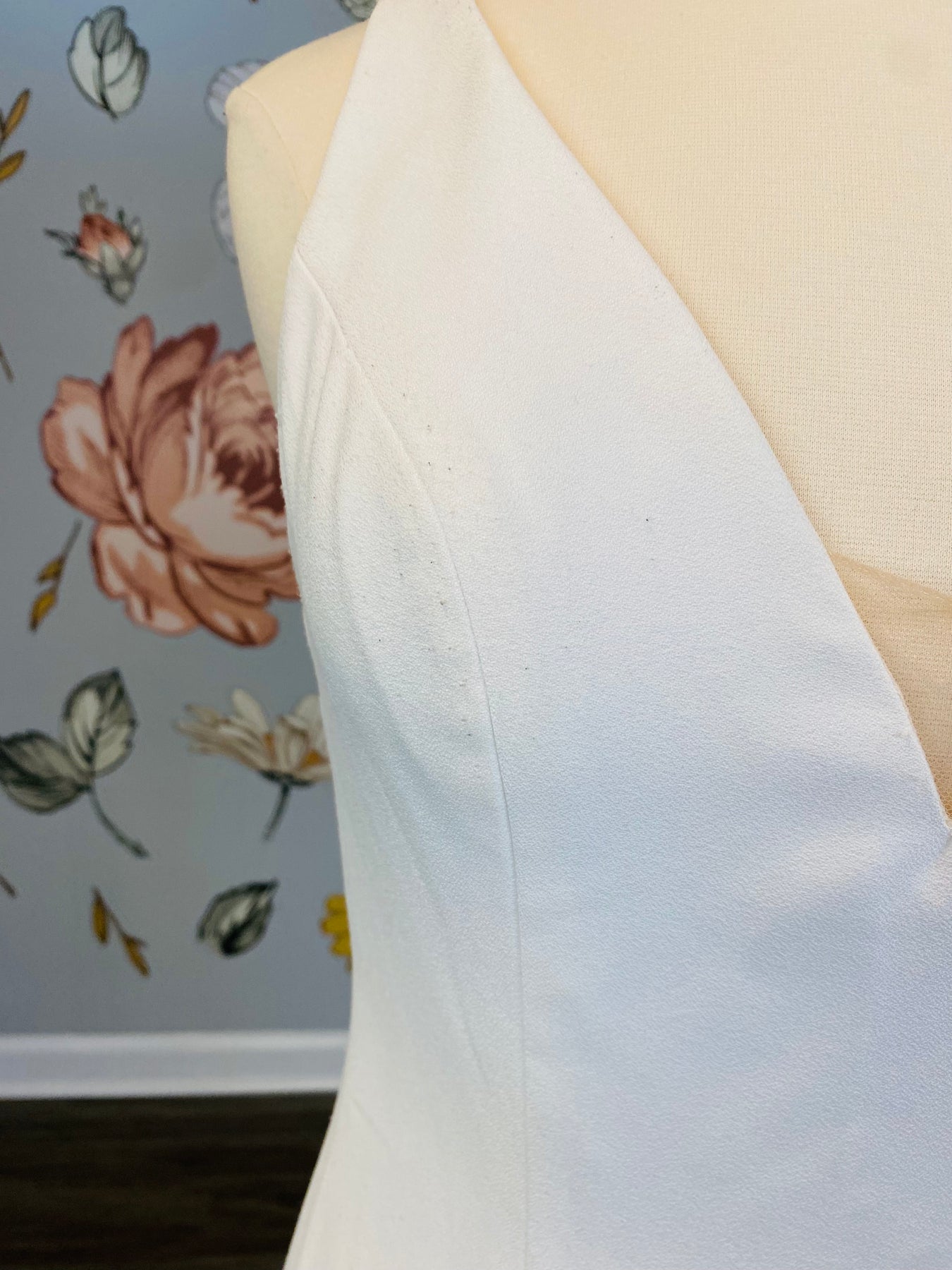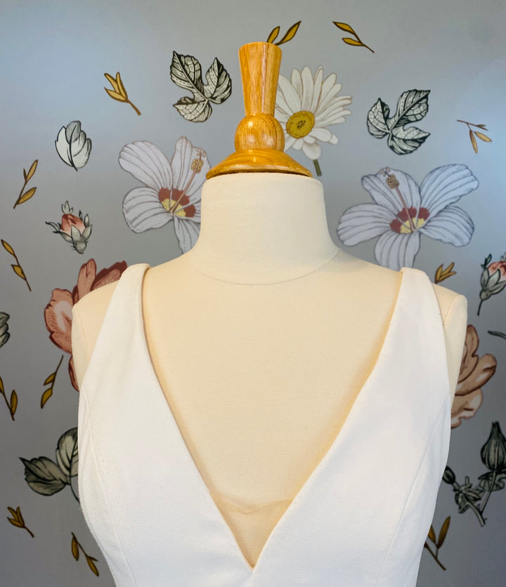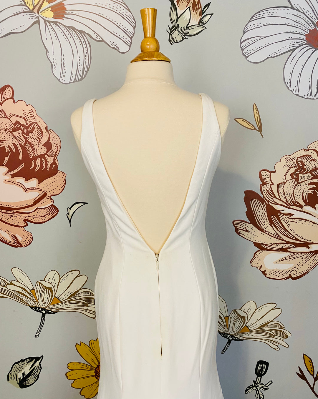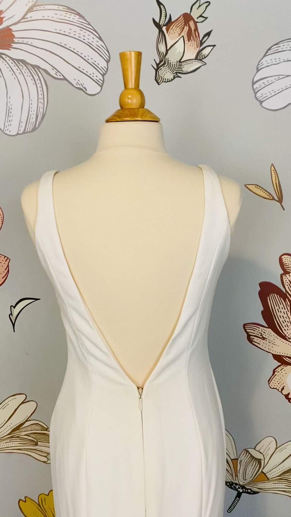 This understated elegant dress is made from heavy ivory Crepe fabric and lin in jersey.  It's a Fit and Flare with Plunging V-Neck and V back