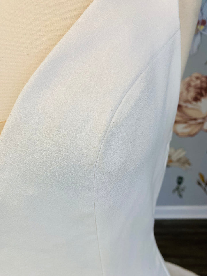 Condition: Store sample; fair condition (there's pilling on the crepe bodice and debris along the hemline.  We recommend dry cleaning.  You can get creative with the front to cover the pilling).