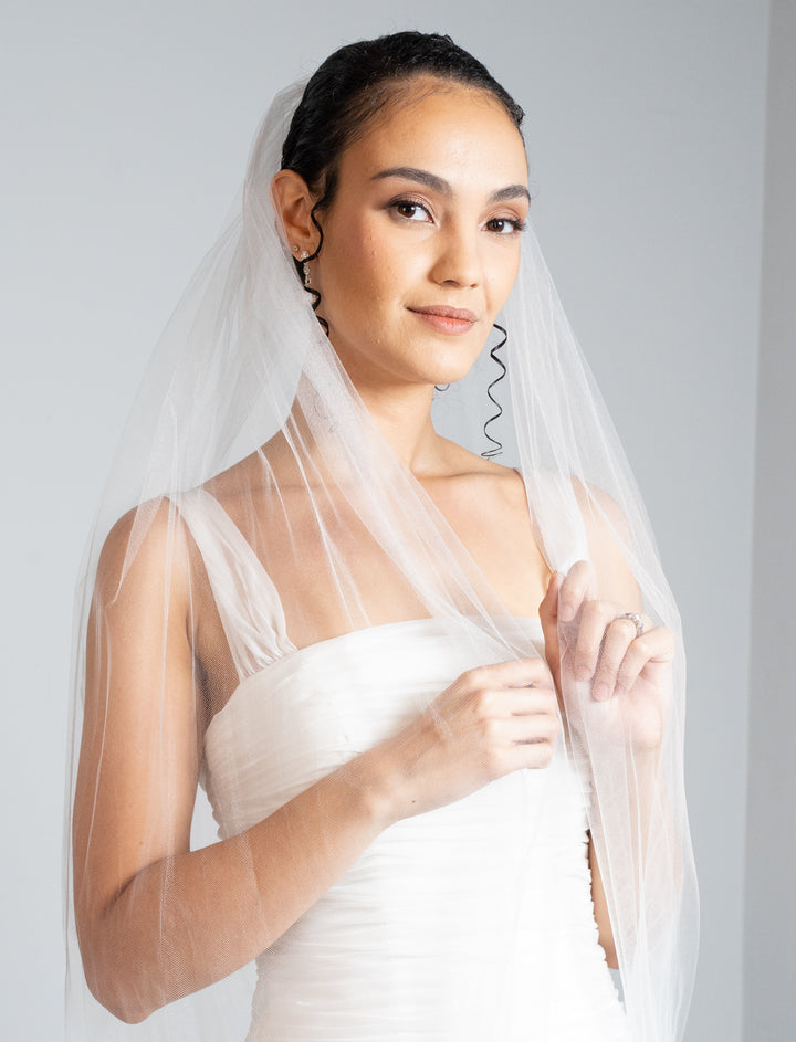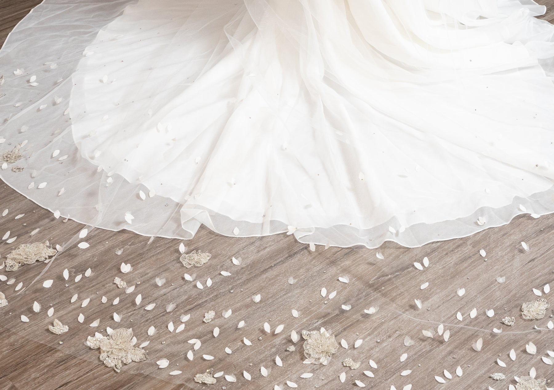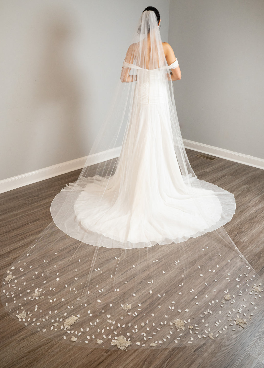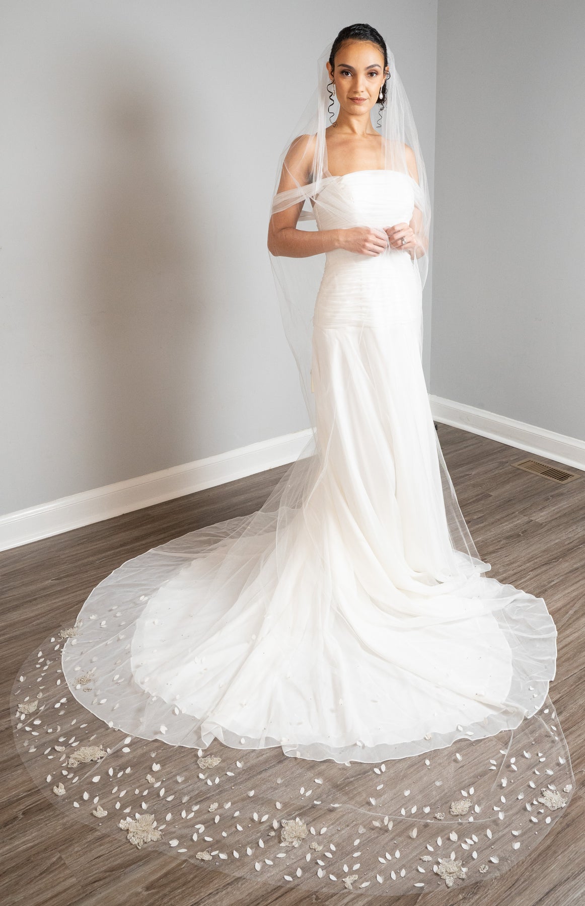 The Helene veil is an absolute showstopper.  All the drama is along the bottom and it features three dimensional organza flowers with crystals and beadwork, scattered crystals, and silk scattered leaf detailing.  The veil is 120" long.