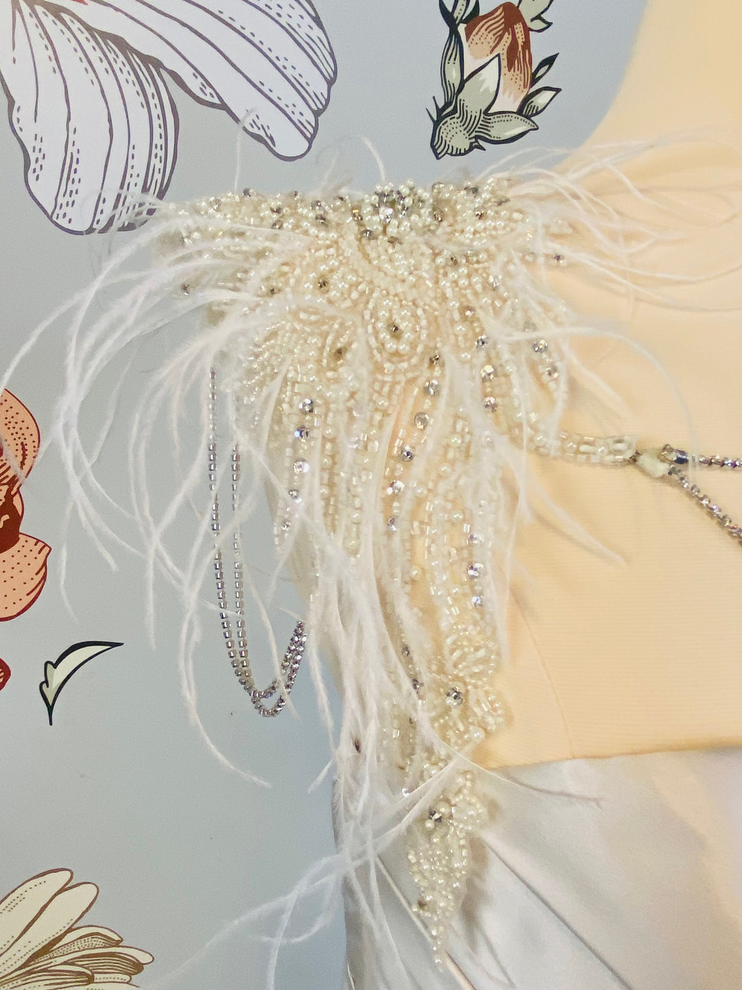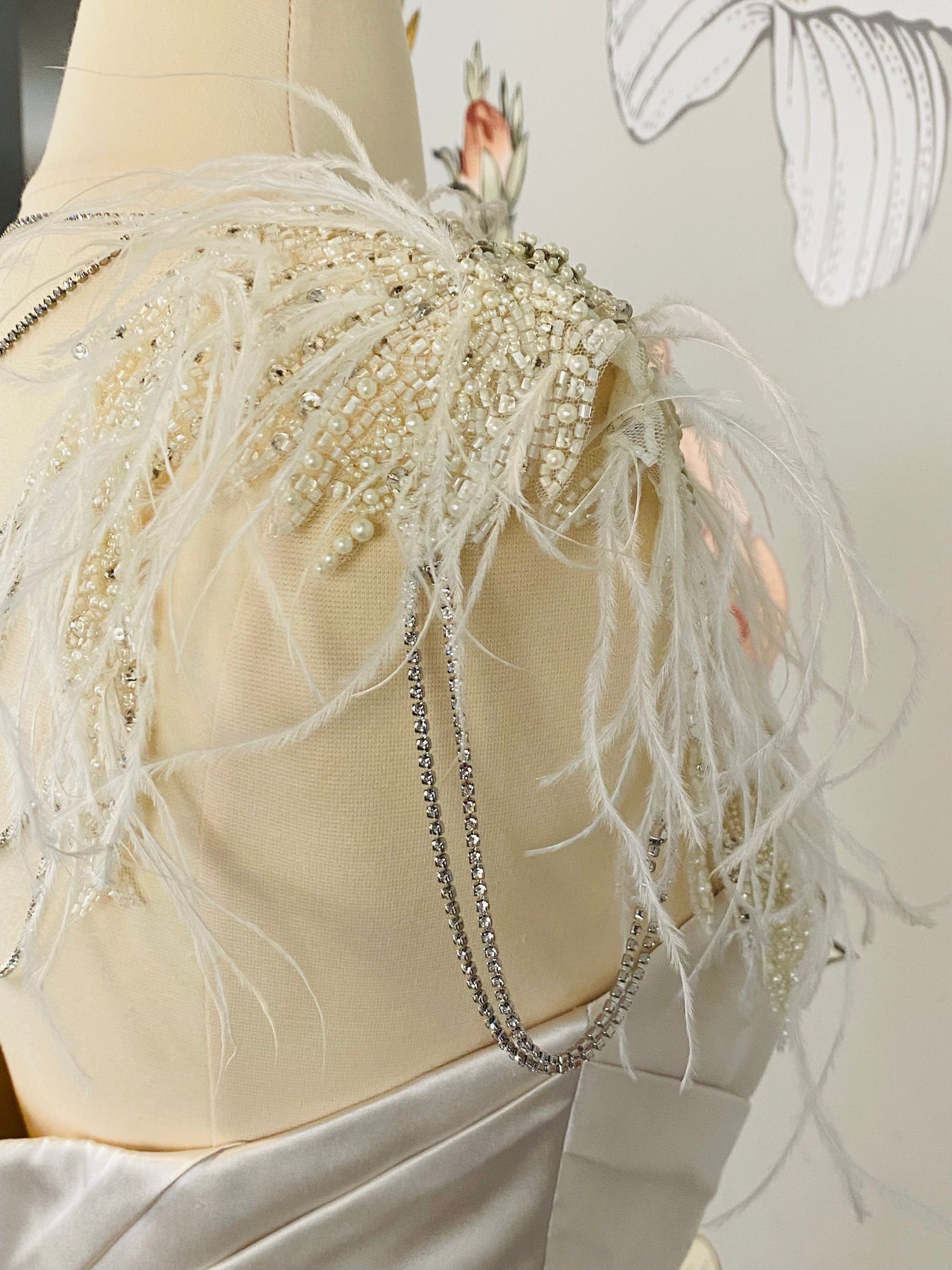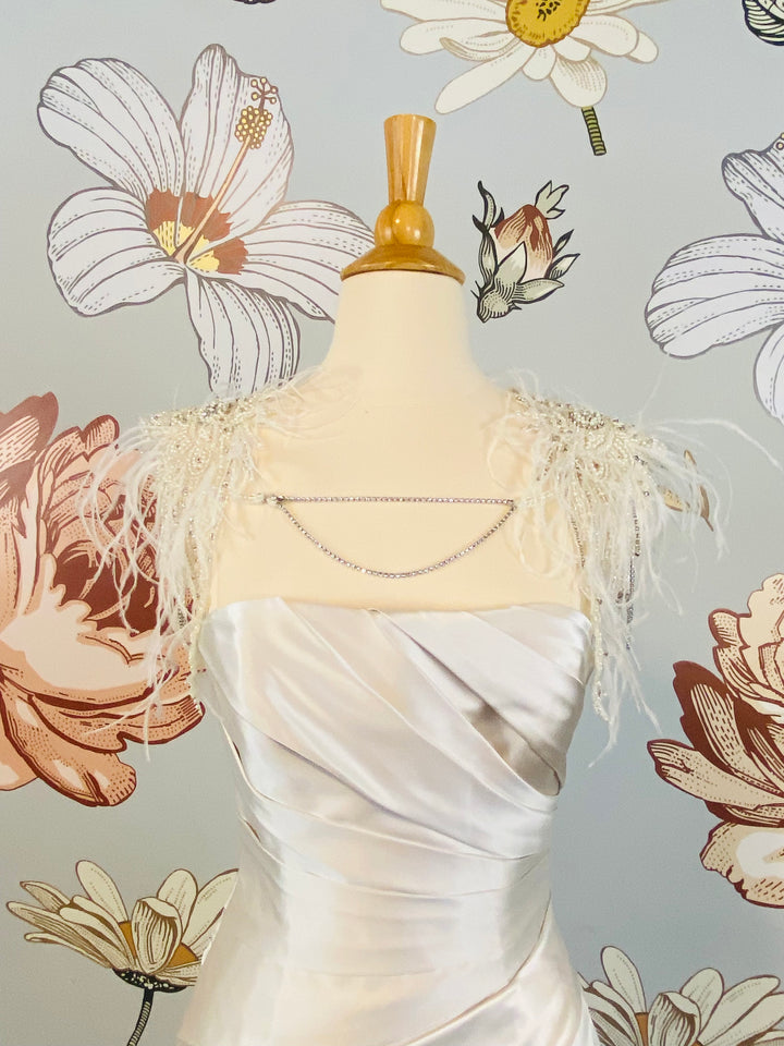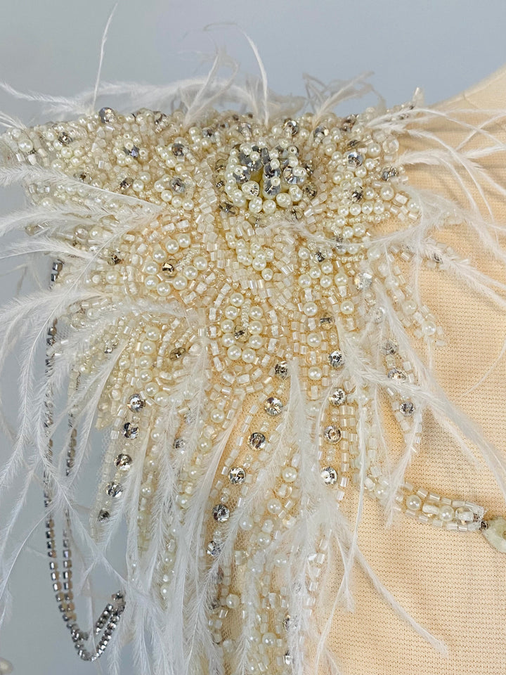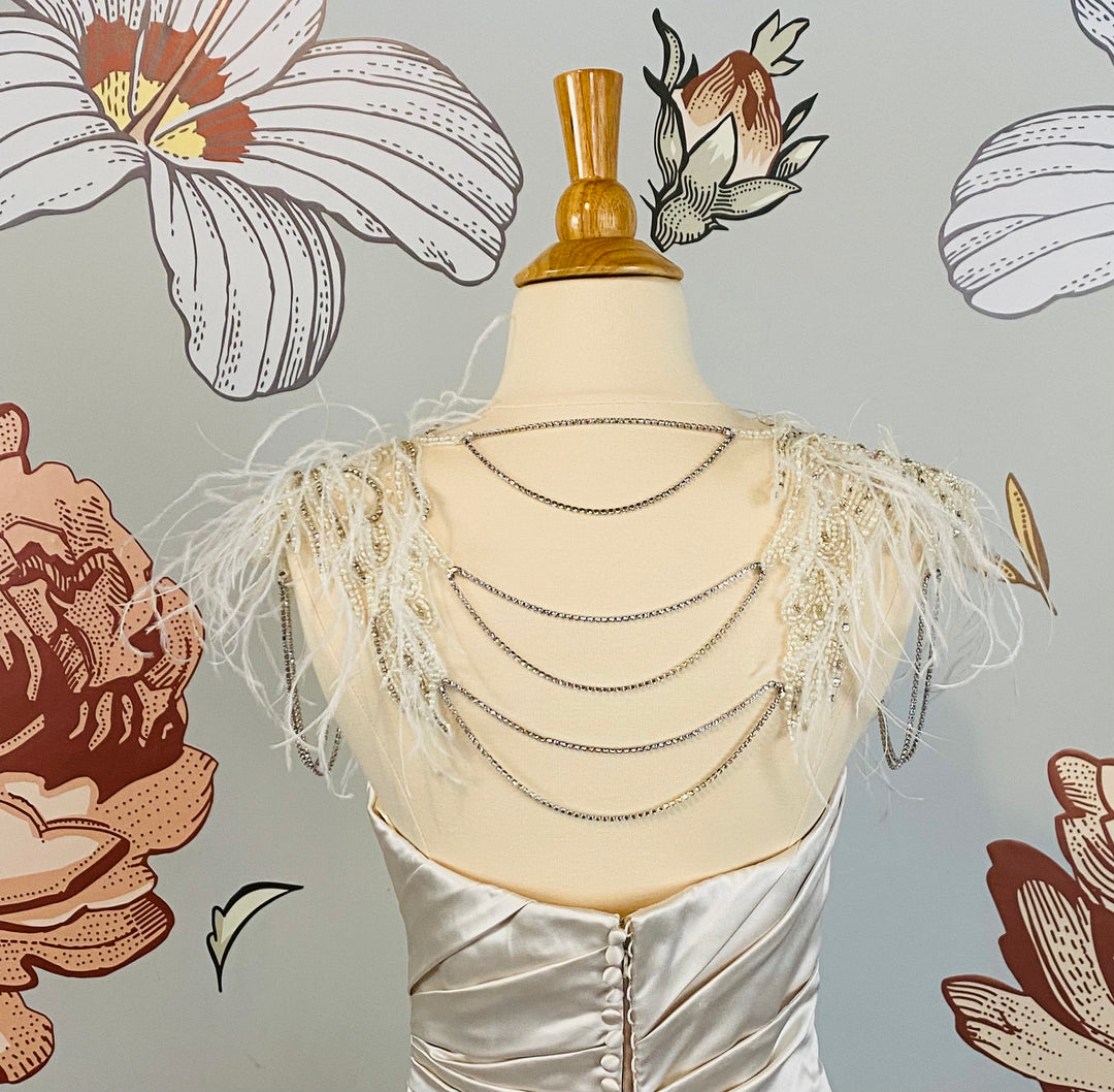 The Istanbul Shoulder and Neck Jewelry by Revelry features ornately intricate beadwork, ostrich feathers, and radiant rhinestone strands, allowing for the ultimate bridal transformation with two looks in one.
