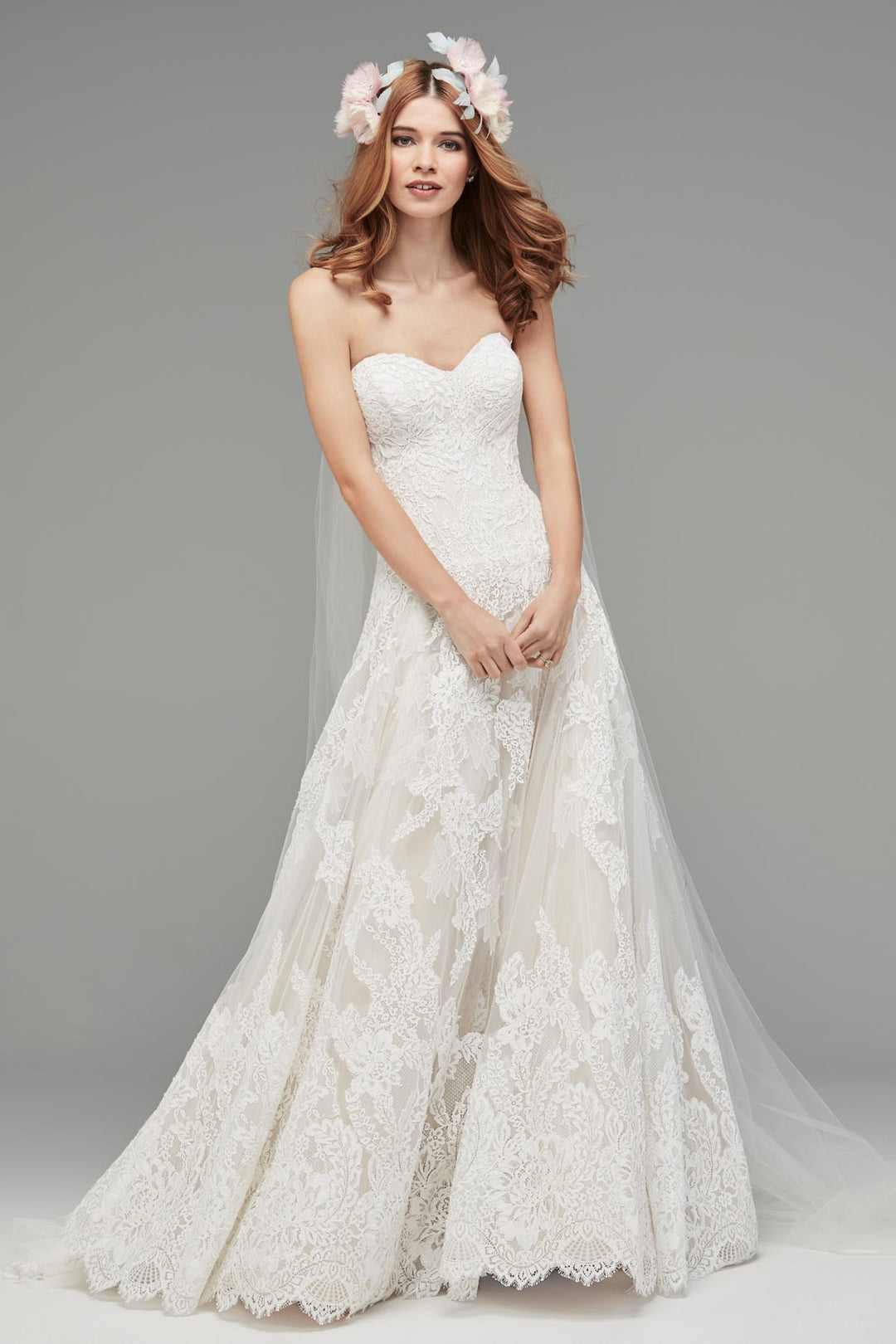 Watters Lyric is a dreamy A-line gown! The strapless bodice is comprised of a sweetheart neckline + dropped waist. Layers of Briar + Leaf lace create a truly romantic look, completed by a full skirt and chapel length train!