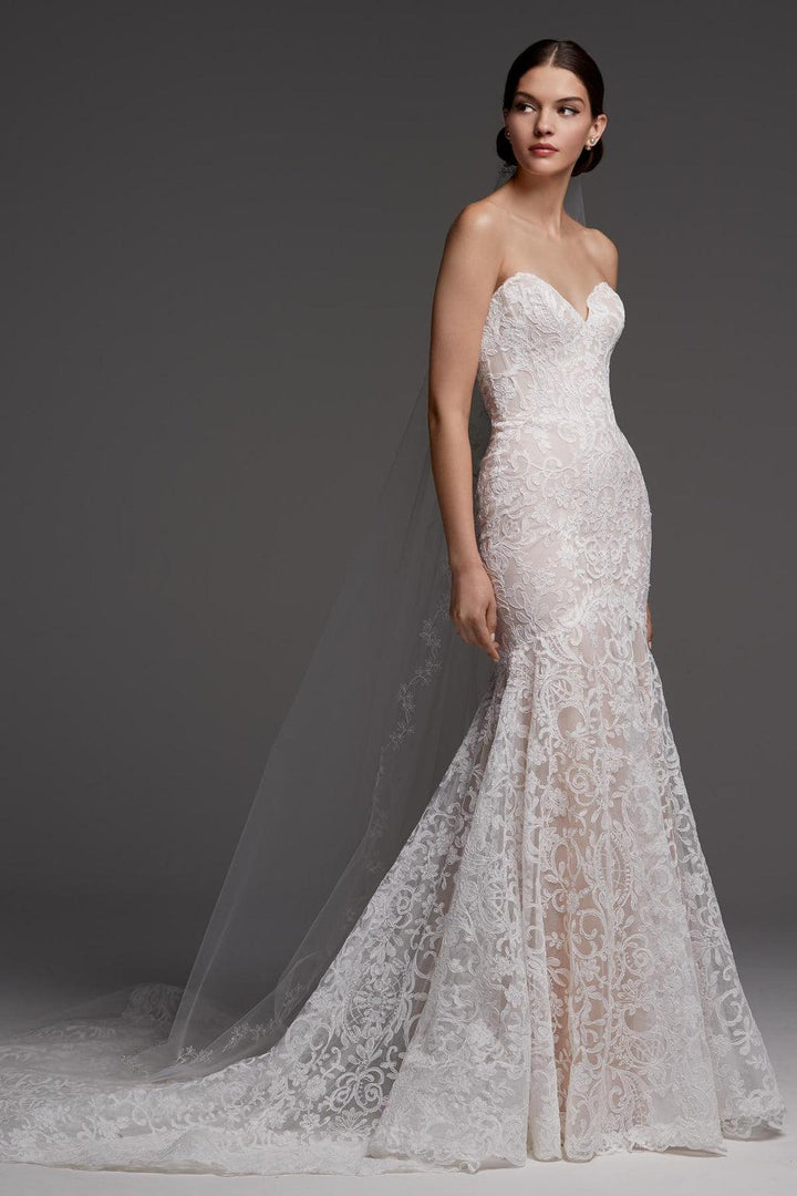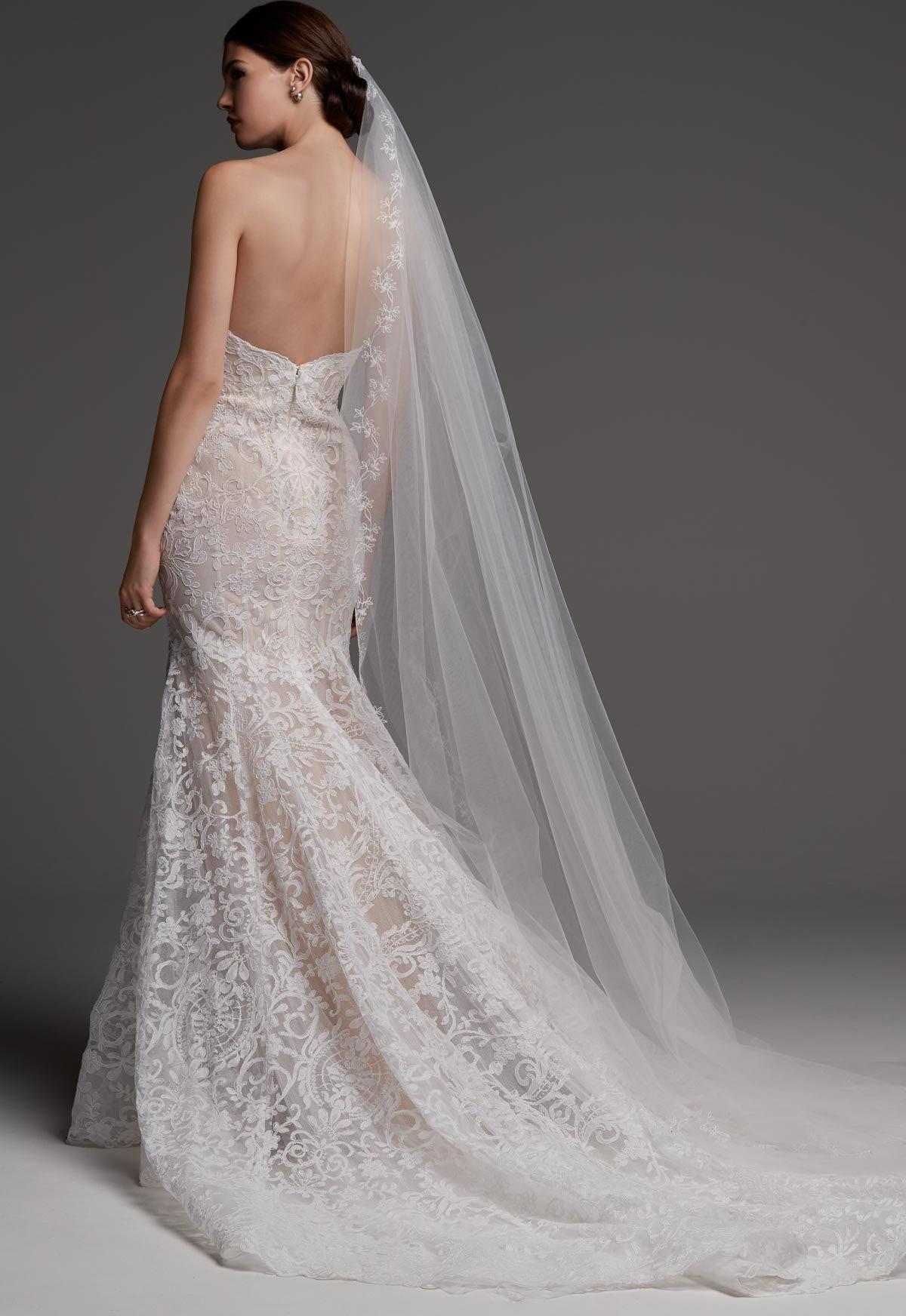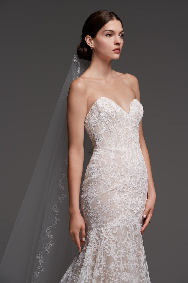 Medici's classic fit-and-flare silhouette is transformed with mesmerizing Muscovy Lace and a dramatic cathedral length train.