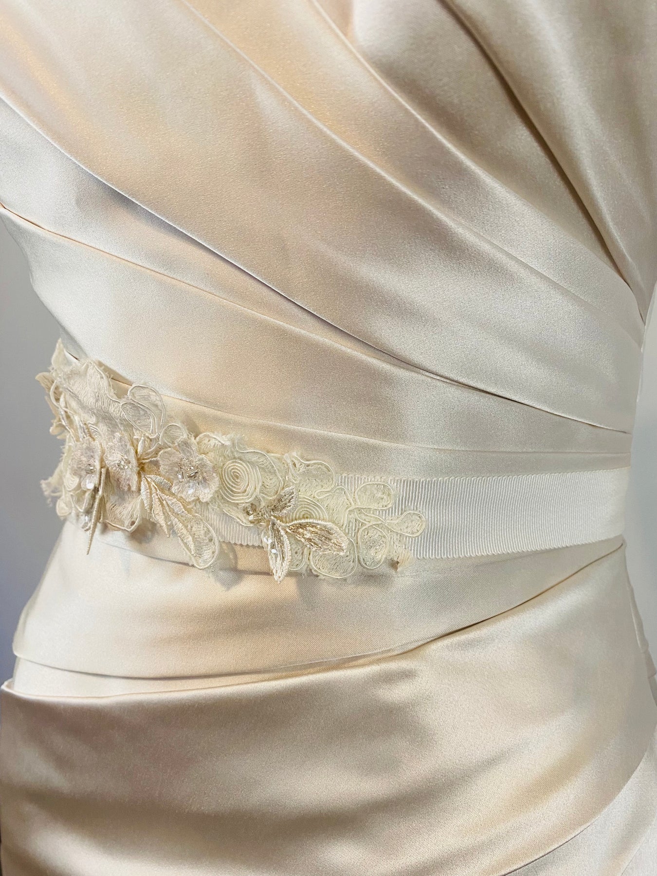 Nassau is a belt crafted of a soft gross grain ribbon adorned with an off-centered monochromatic floral lace accent and delicate tonal beadwork.  It has metal hook closures and can fit up to a 36" waistline.