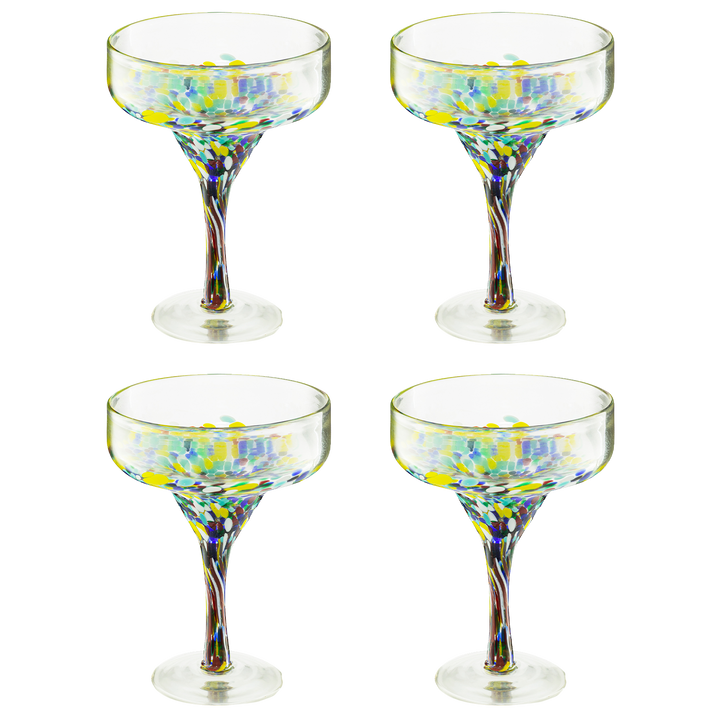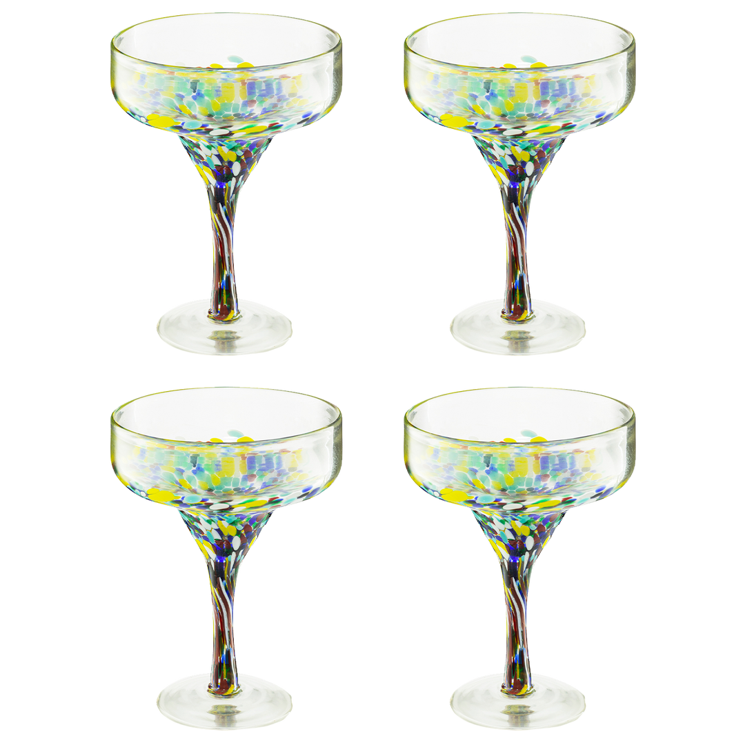 • These hand-blown, colorful glasses feature a timeless confetti design. Handcrafted by skilled artisans, these margarita glasses will be a true conversation starter.