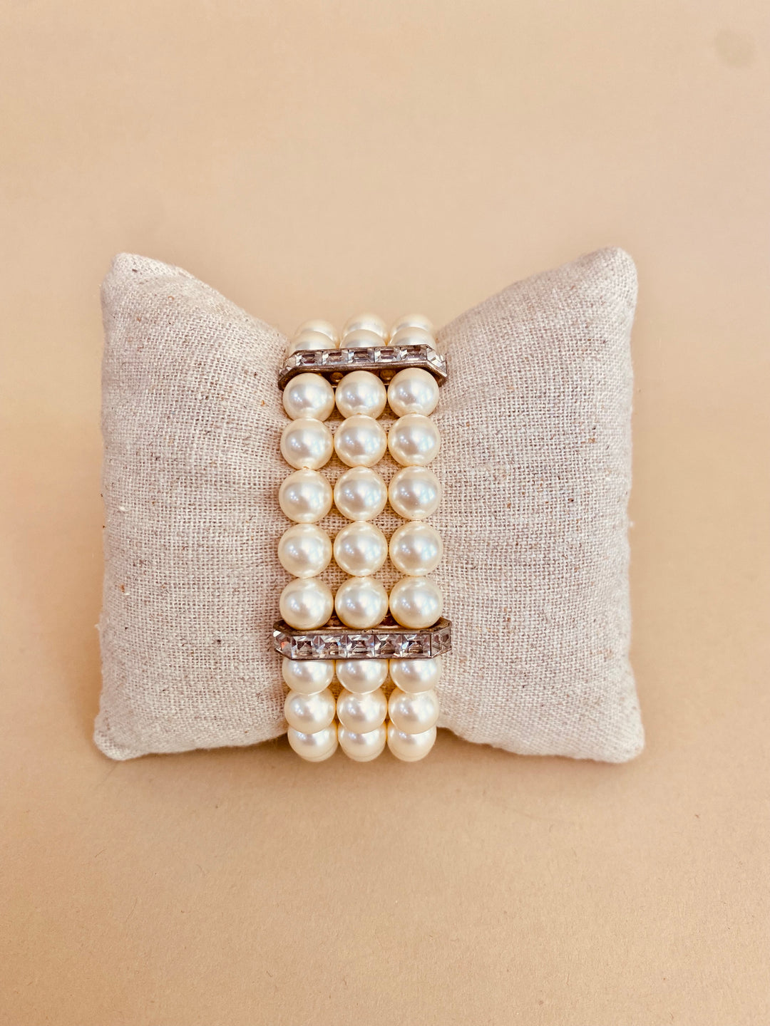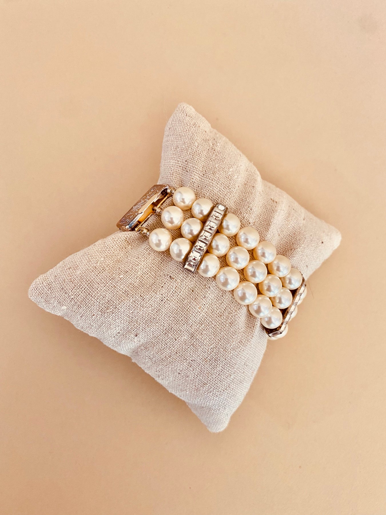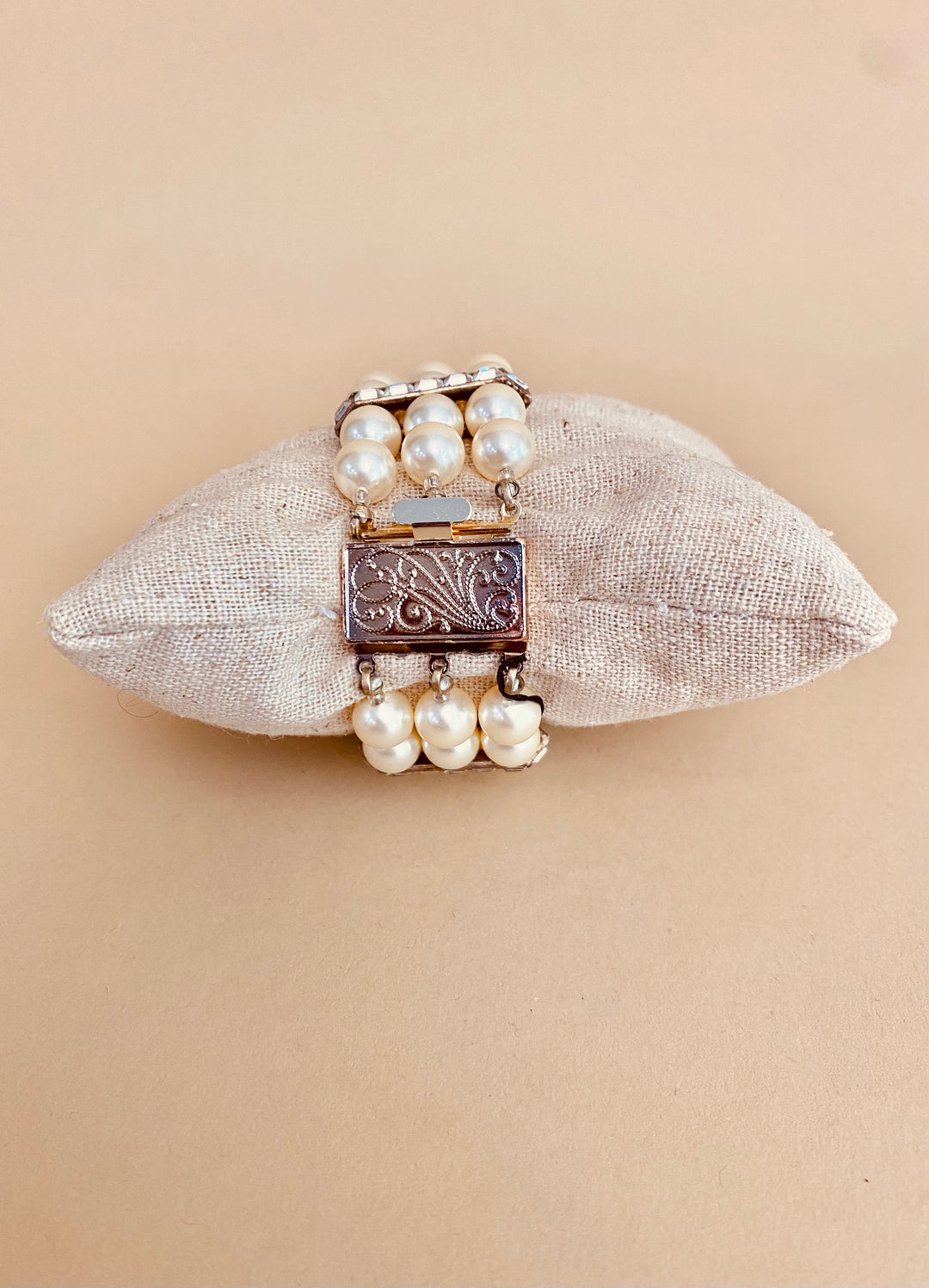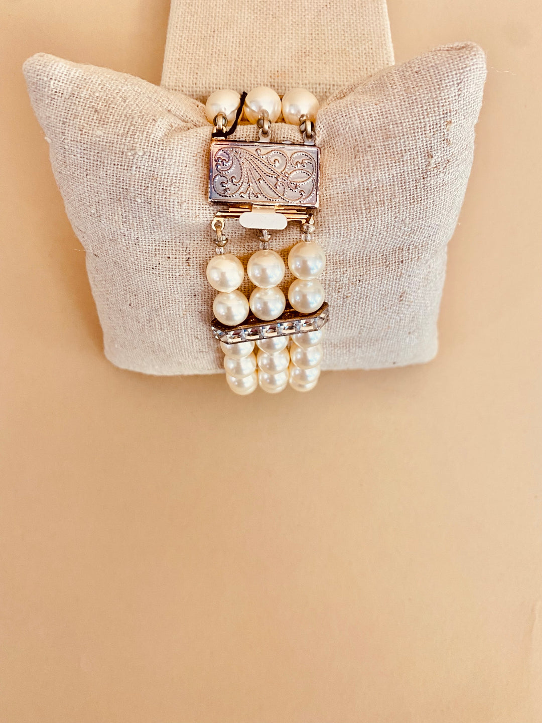 A classic and striking three-strand ivory pearl bracelet with crystal bars and a filigree designed clasp.  The clasp needs some shining up, but the rest of this gem is in excellent condition.