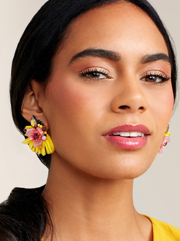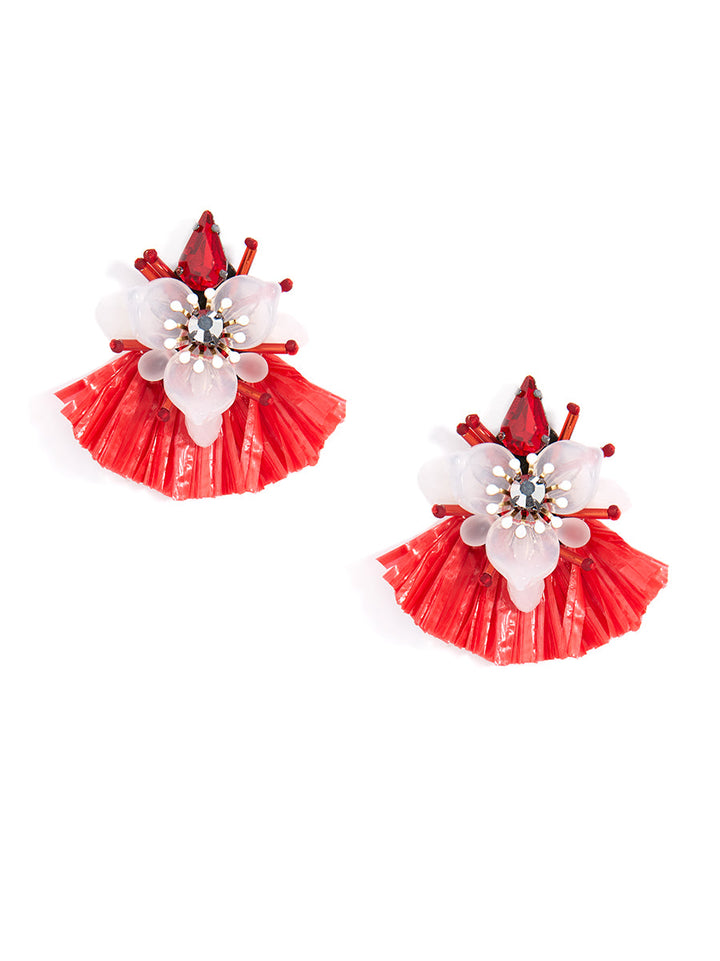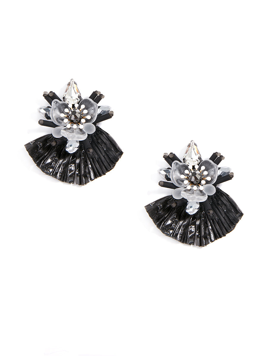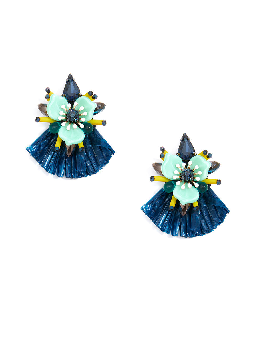 Add a little tropical bliss to your look with these fun drop earrings. This handmade style features a crystal post and flower with a raffia fringe drop.
