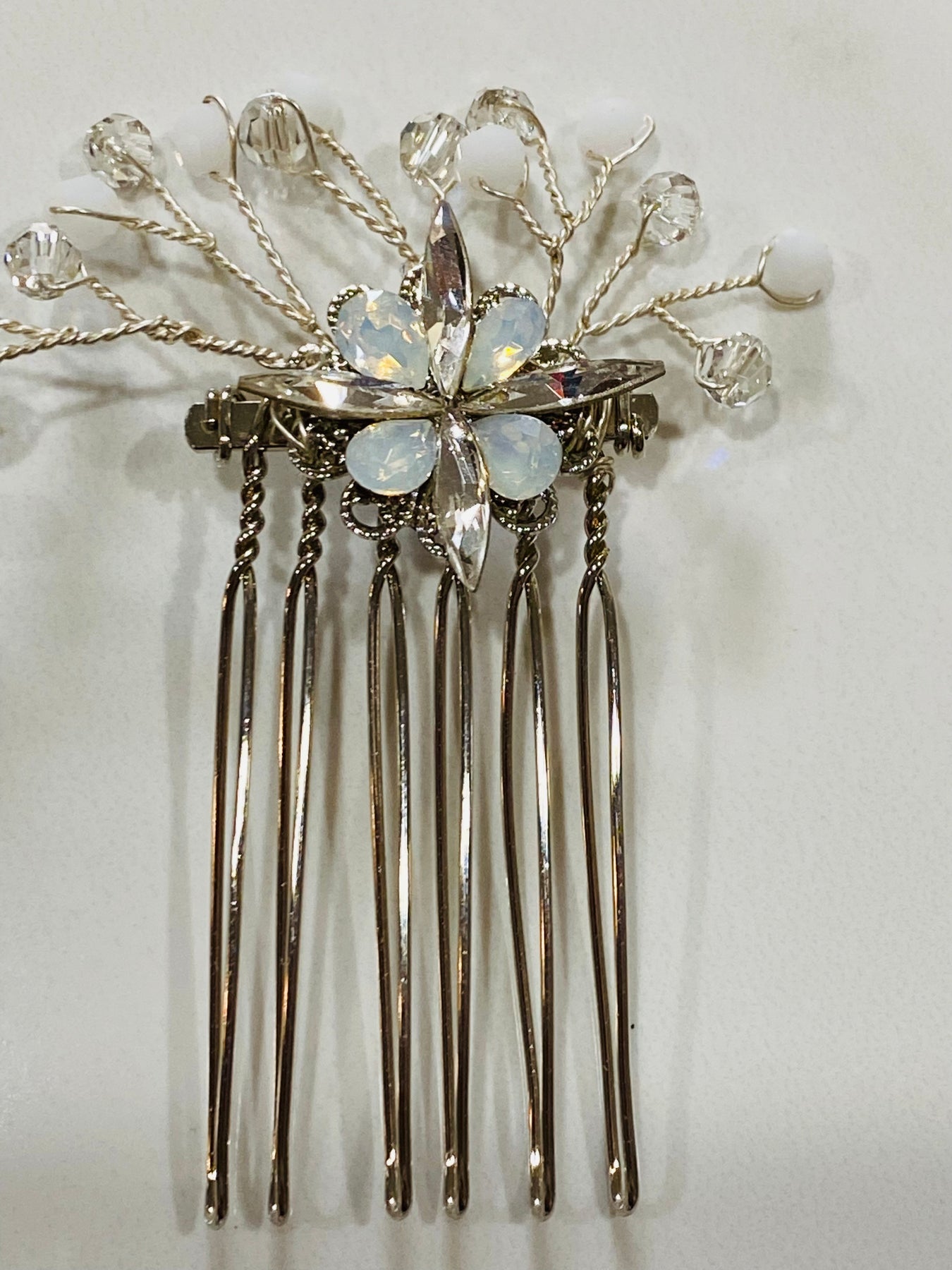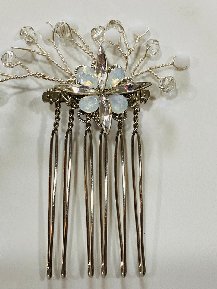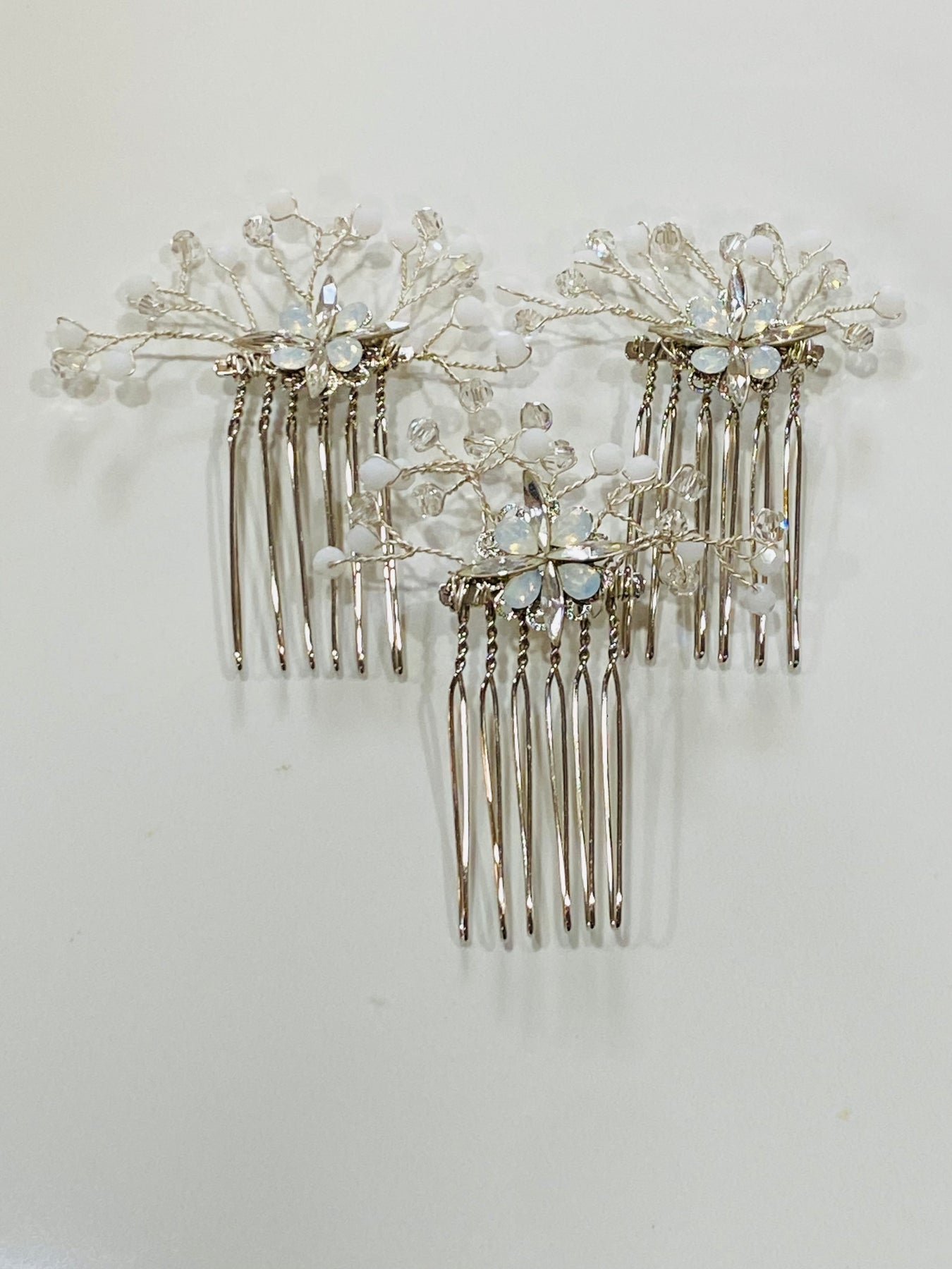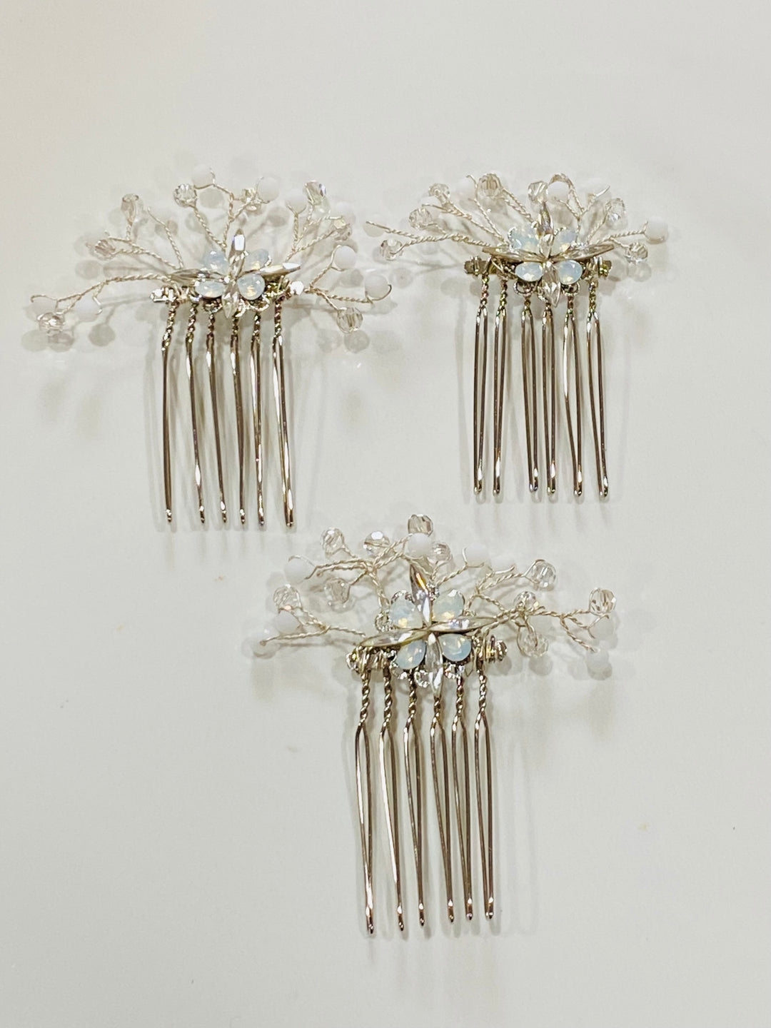 These miniature hair combs come in a set of three.  The dainty design is composed of opalescent and clear crystals in a stunning floral pattern.