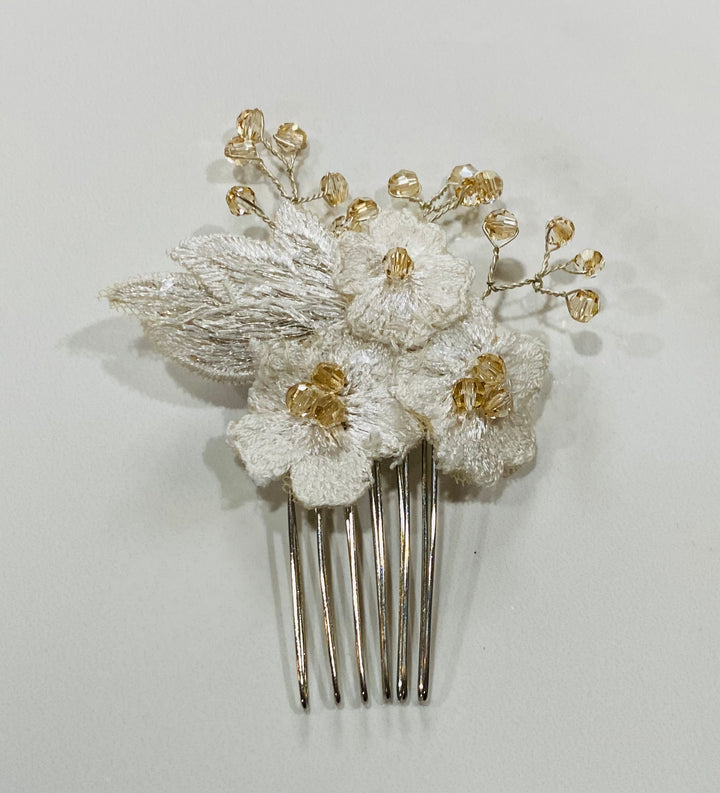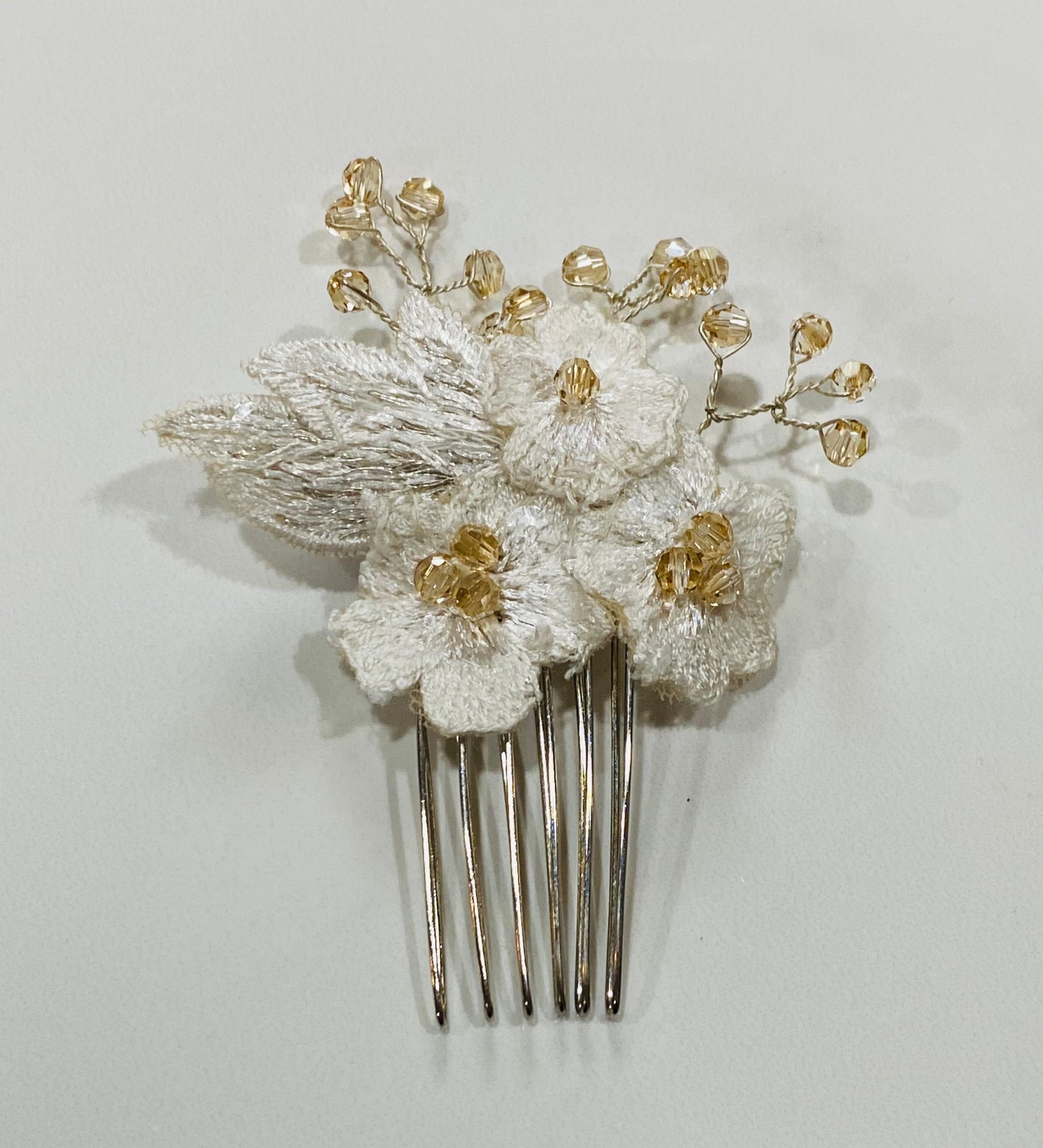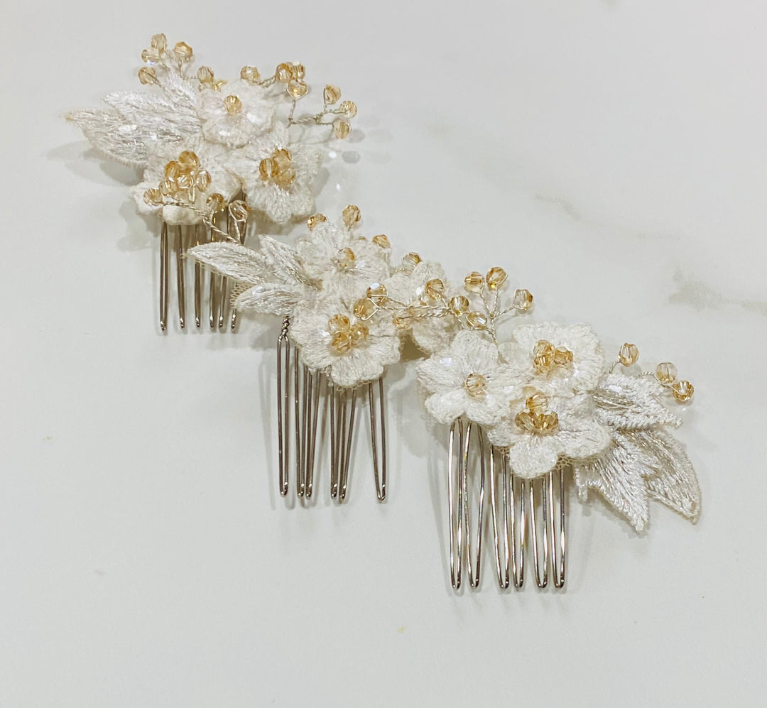 These custom miniature combs come in a set of three.  These elegant floral embroidered lace combs are finished with gold hued crystal accents.
