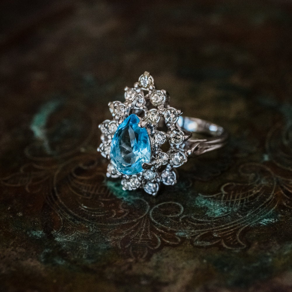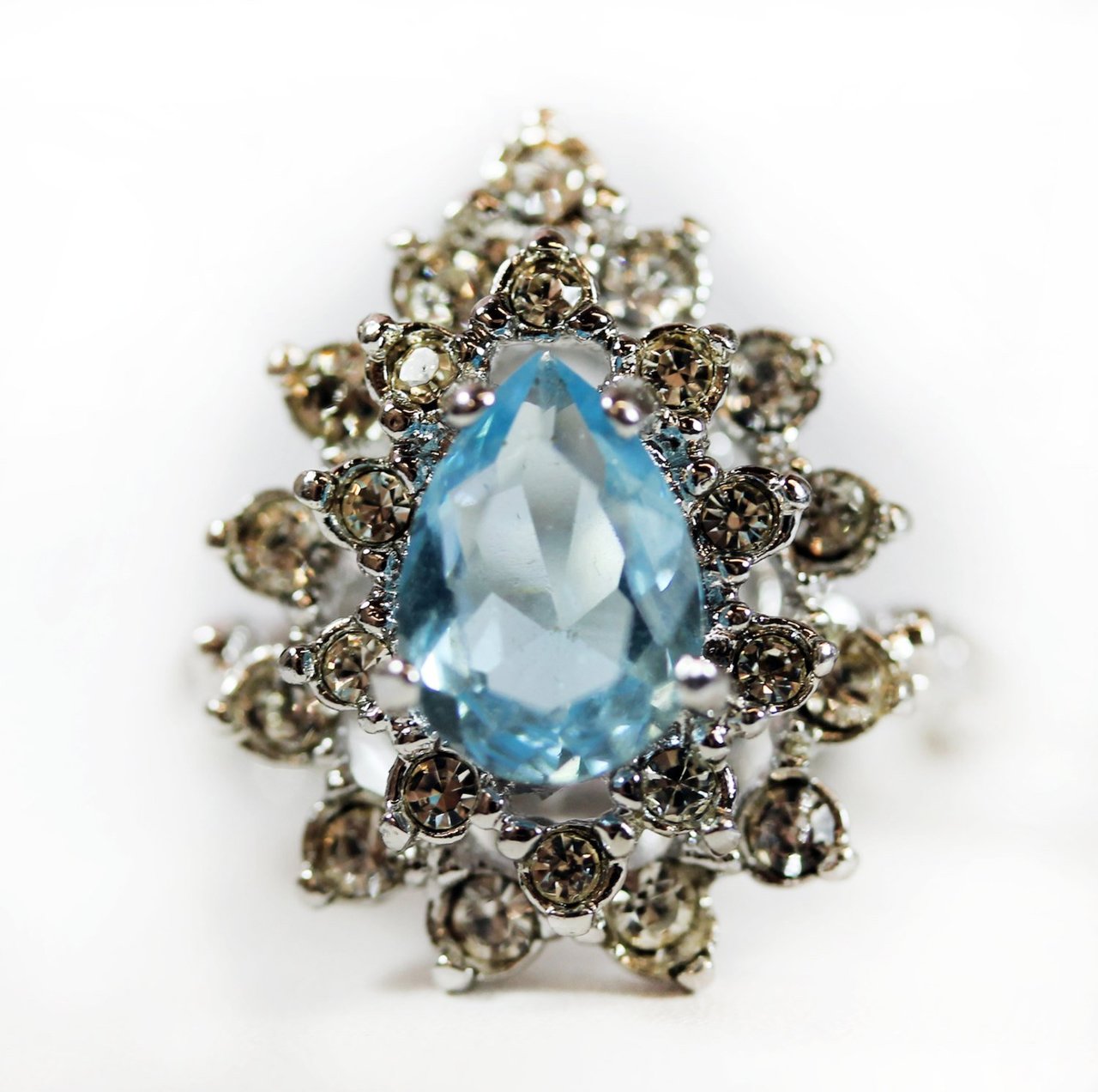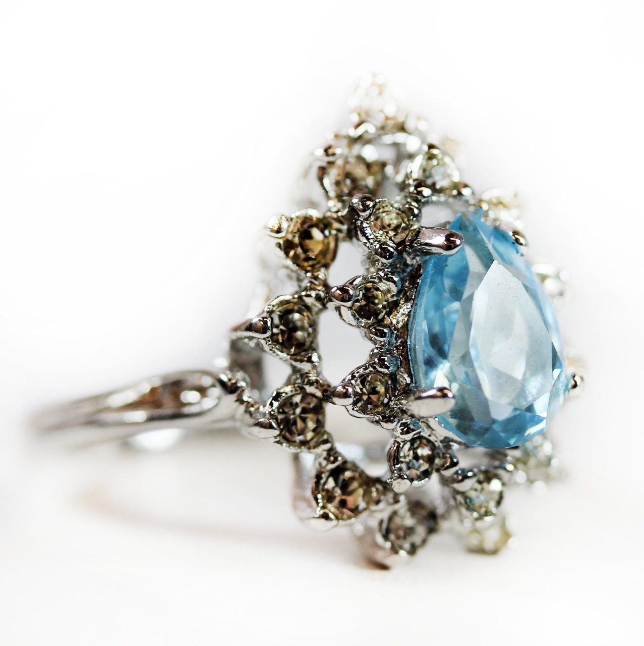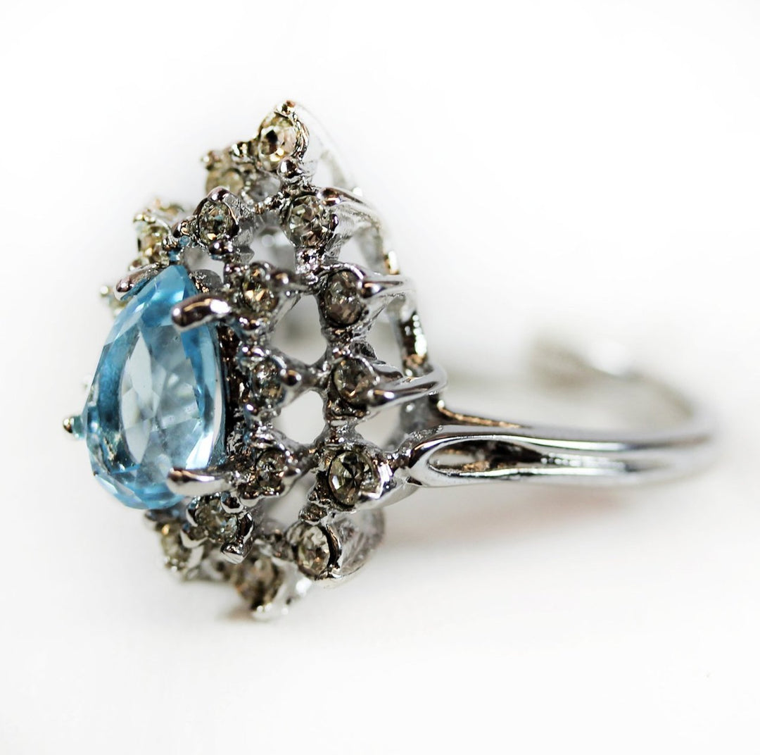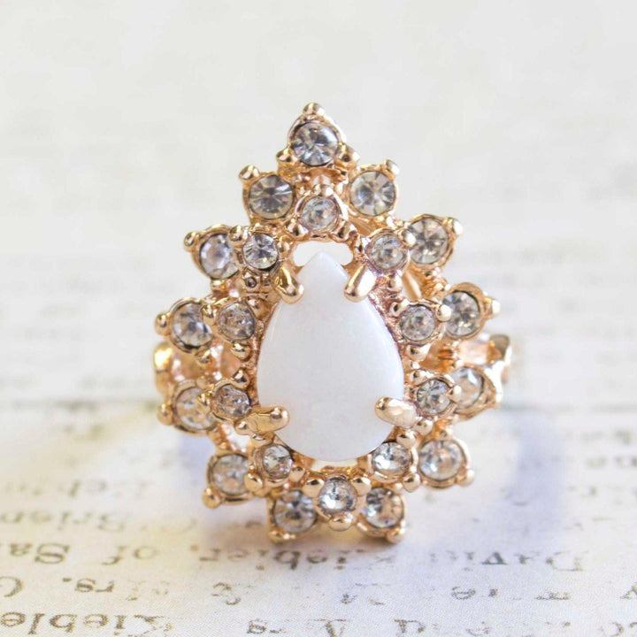 Condition: Excellent (Never worn and with tags) Vintage Cocktail Ring Made in Providence, RI, USA 18k Gold Electroplated Pear Shaped Genuine Opal Genuine Clear Austrian crystals Stamped - 18k HGE October's Birthstone