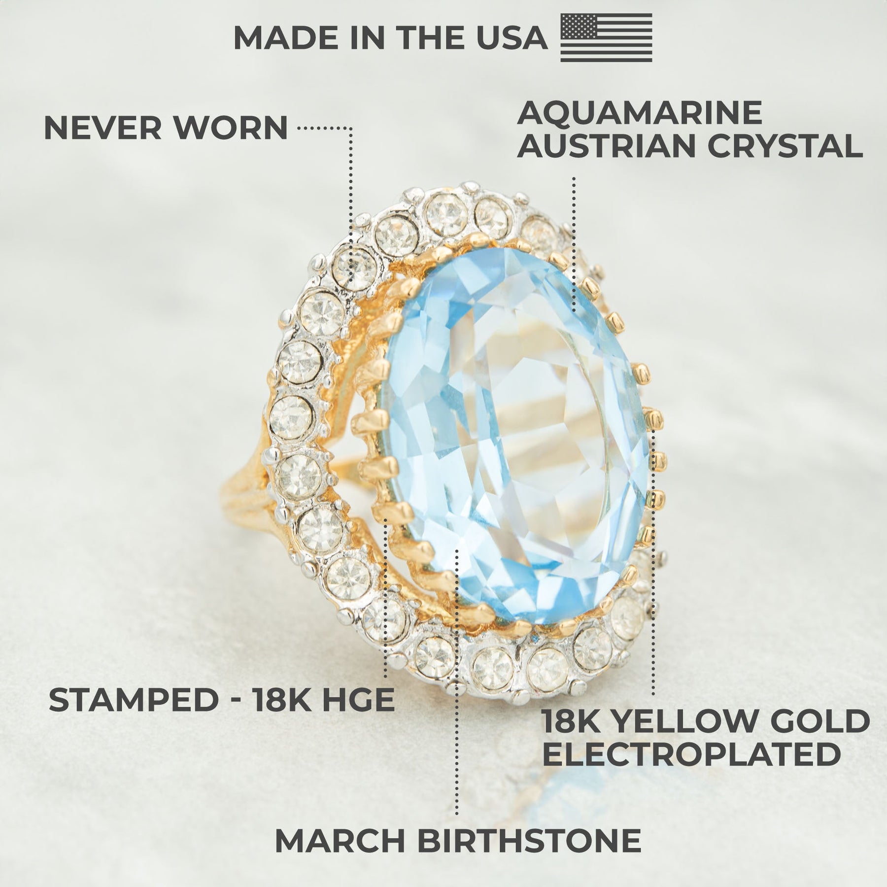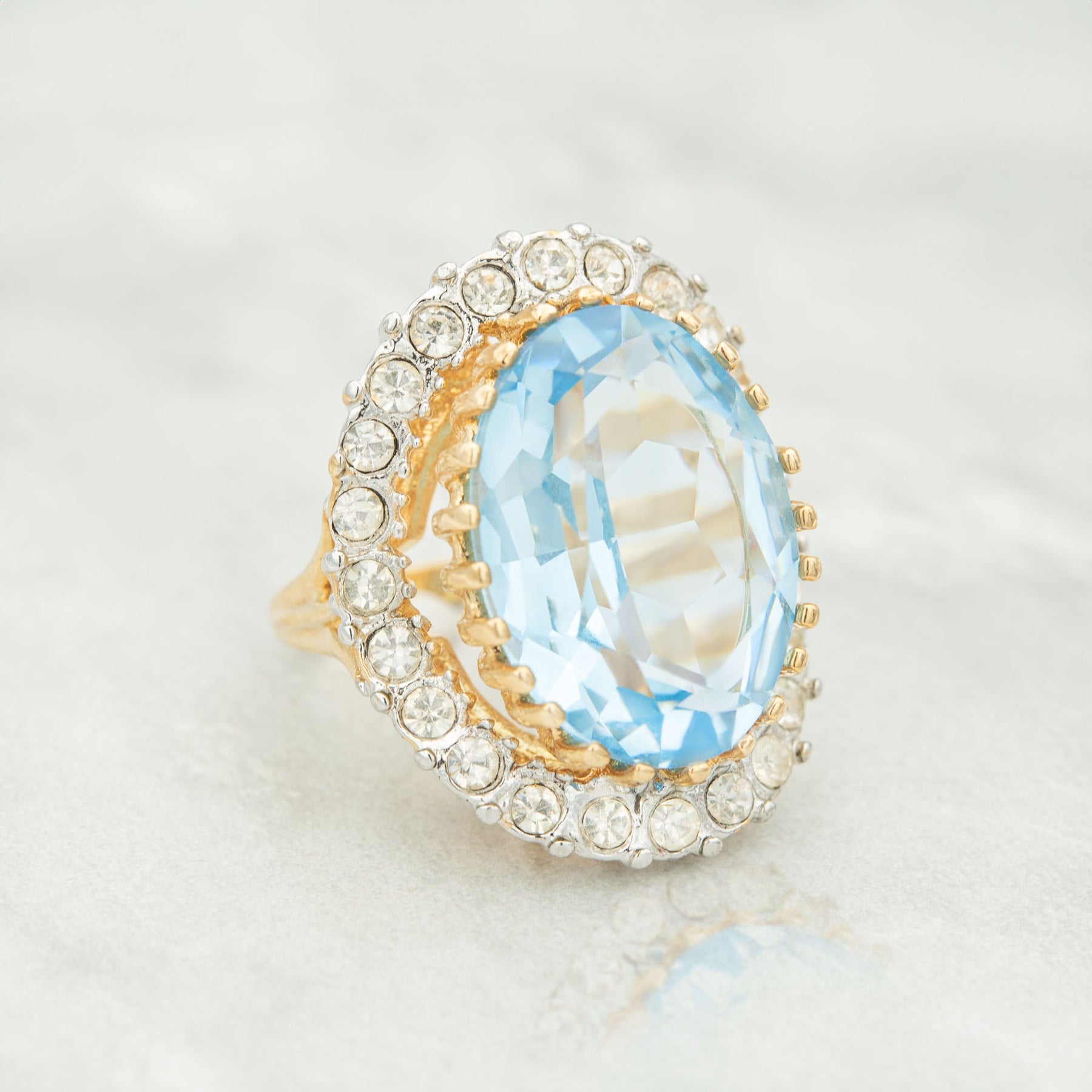 Vintage Cocktail Ring Made in Providence, RI, USA 18k Gold Plated Prong Setting Oval Cut Light Topaz, Sapphire, or Aquamarine Austrian Crystal Ring