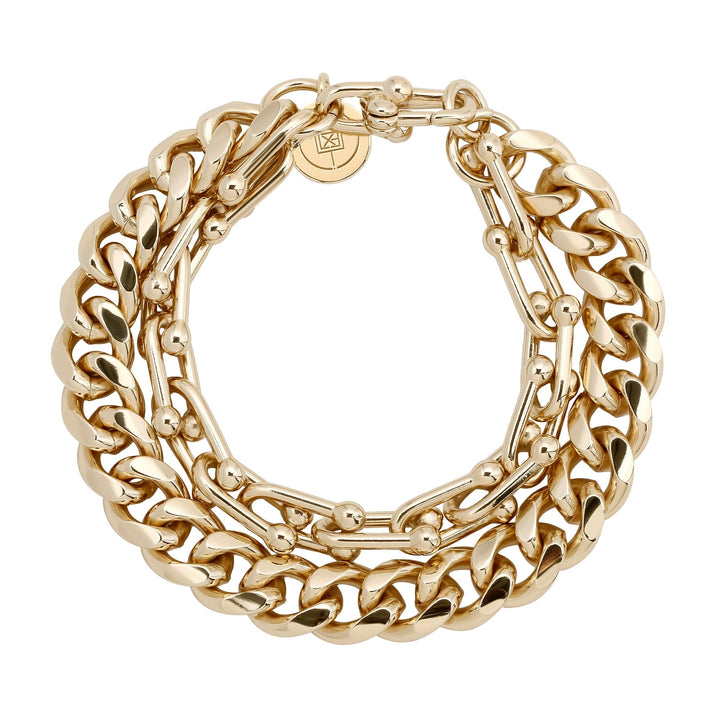 The Violet bracelet is made from rounded recycled brass curb chain, and our Margaux U link chain. Fastened with a custom 20mm U link clasp.