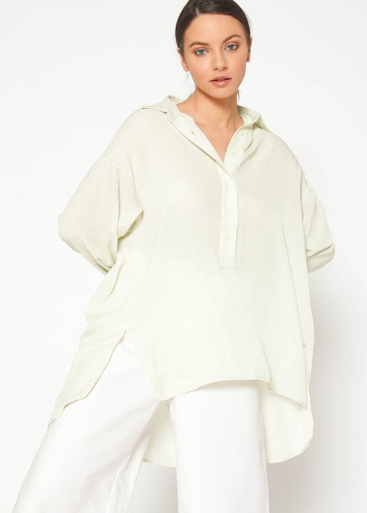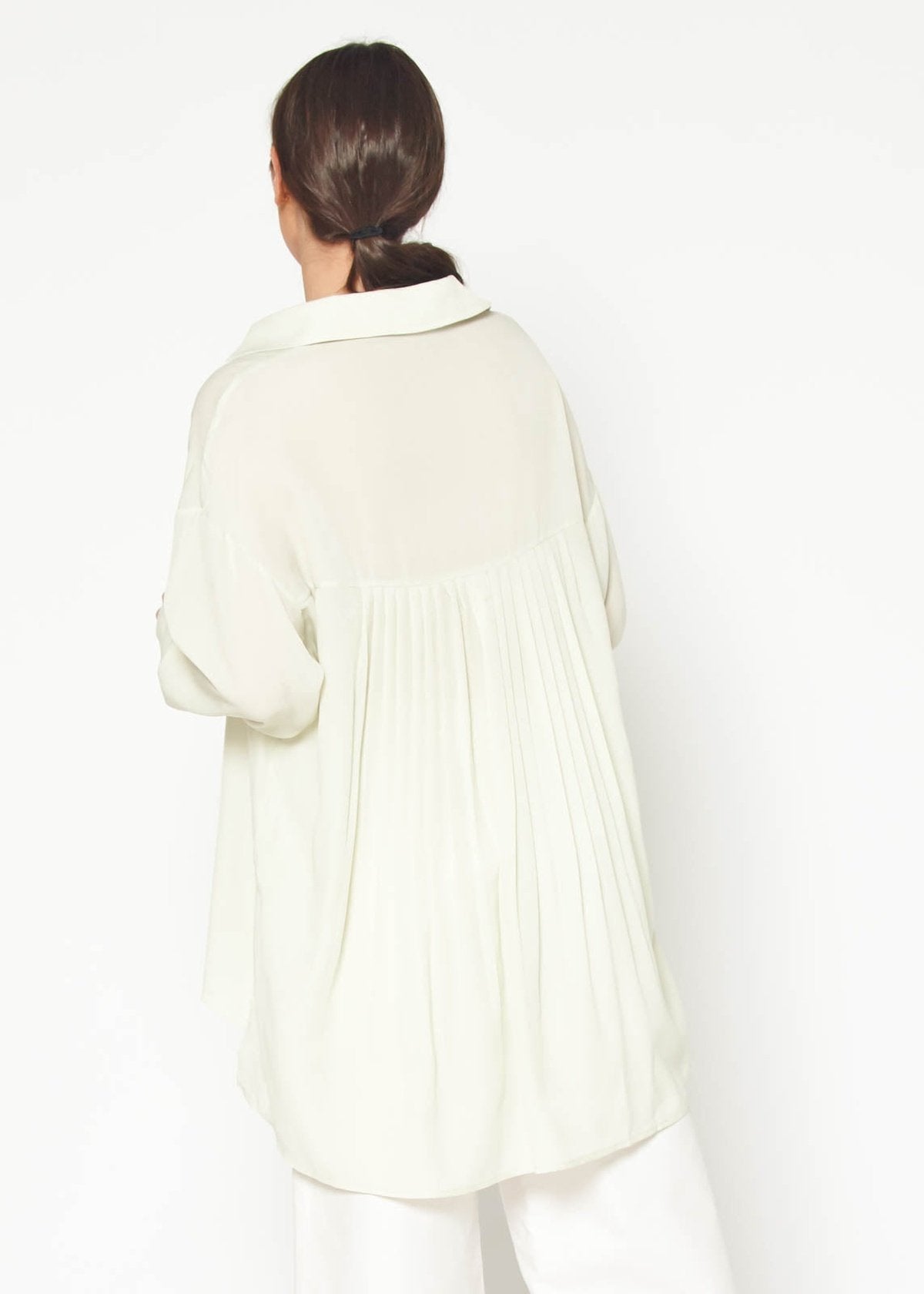 Be ready for any occasion with this Women's Hi Lo Button Up Shirt Blouse! With a pleated back and an oversized fit, this button-up will have you looking cool and confident.